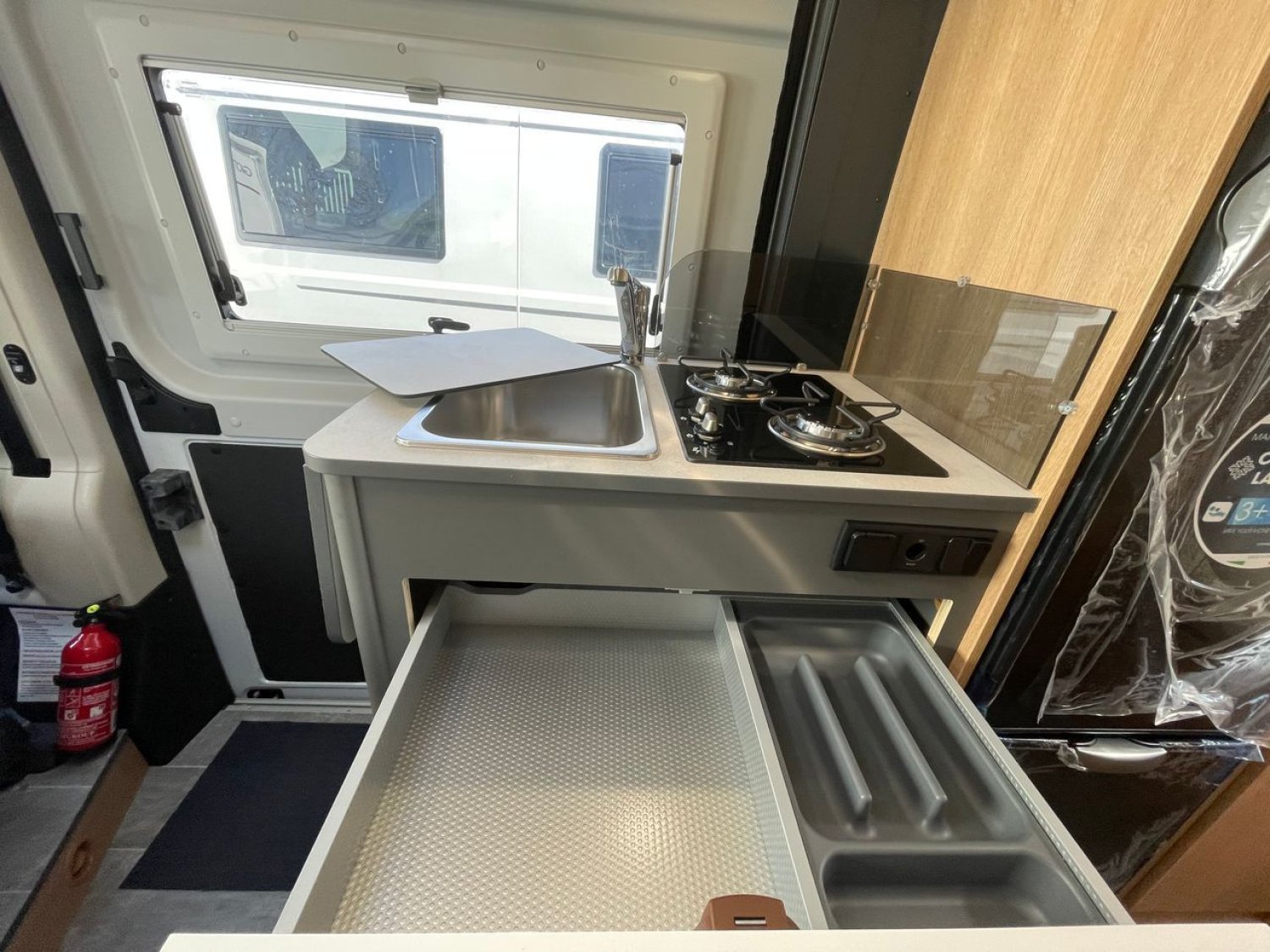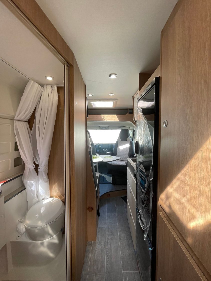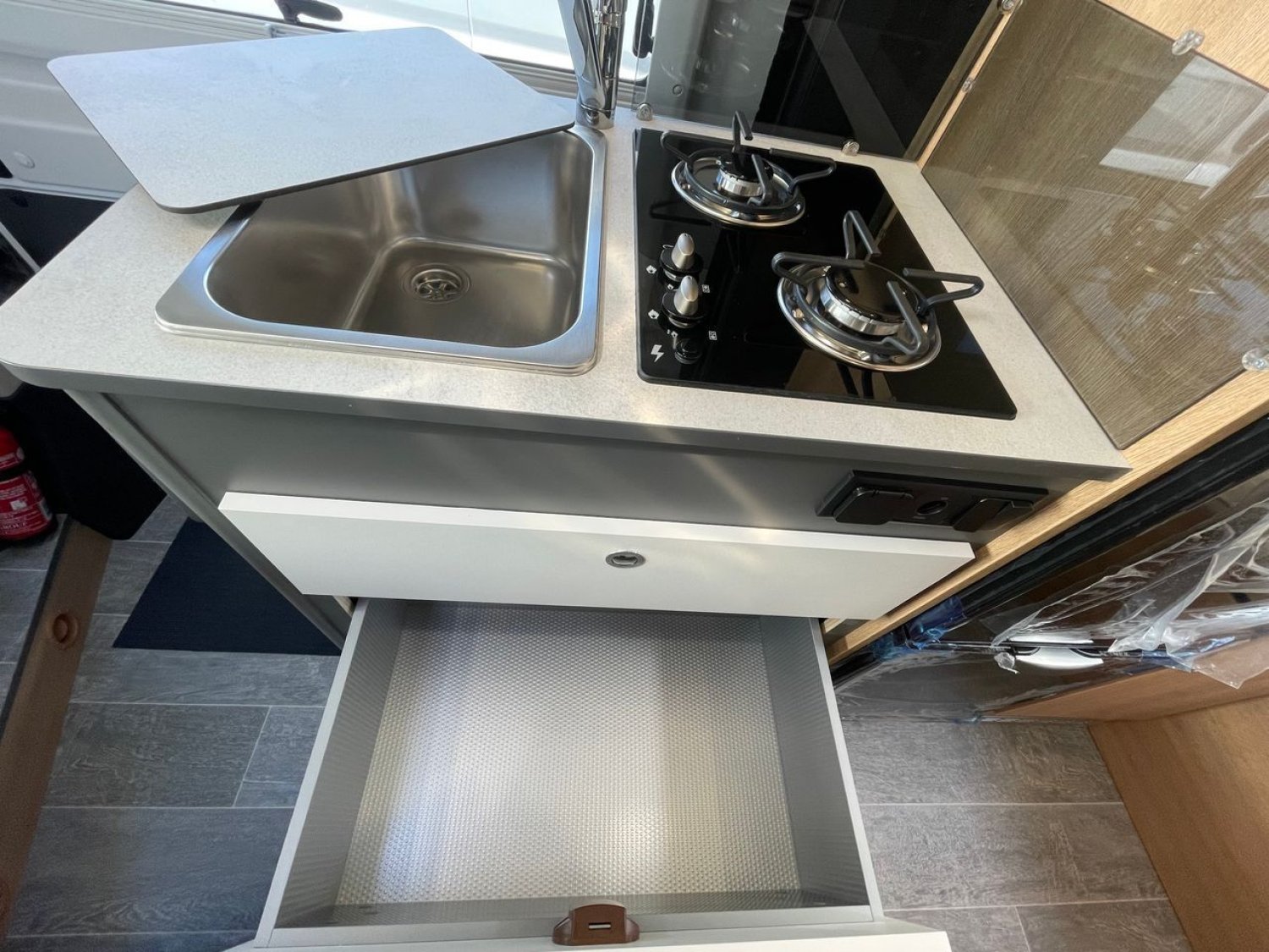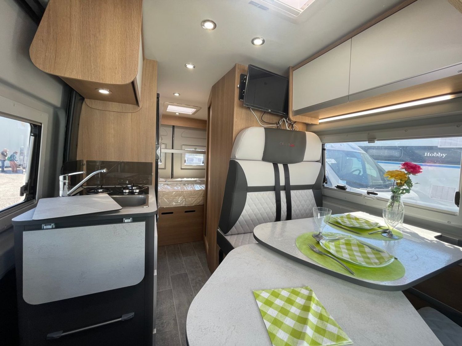 À l'avant, la dinette spacieuse permet également de se transformer en lit d'appoint, et on y retrouve également un grand réfrigérateur à compression de 135L, la climatisation cabine, ou encore un chauffage et chauffe-eau Truma. La salle de bain est équipée d'un bac de douche, d'un WC compact ainsi qu'un astucieux lavabo pivotant.
