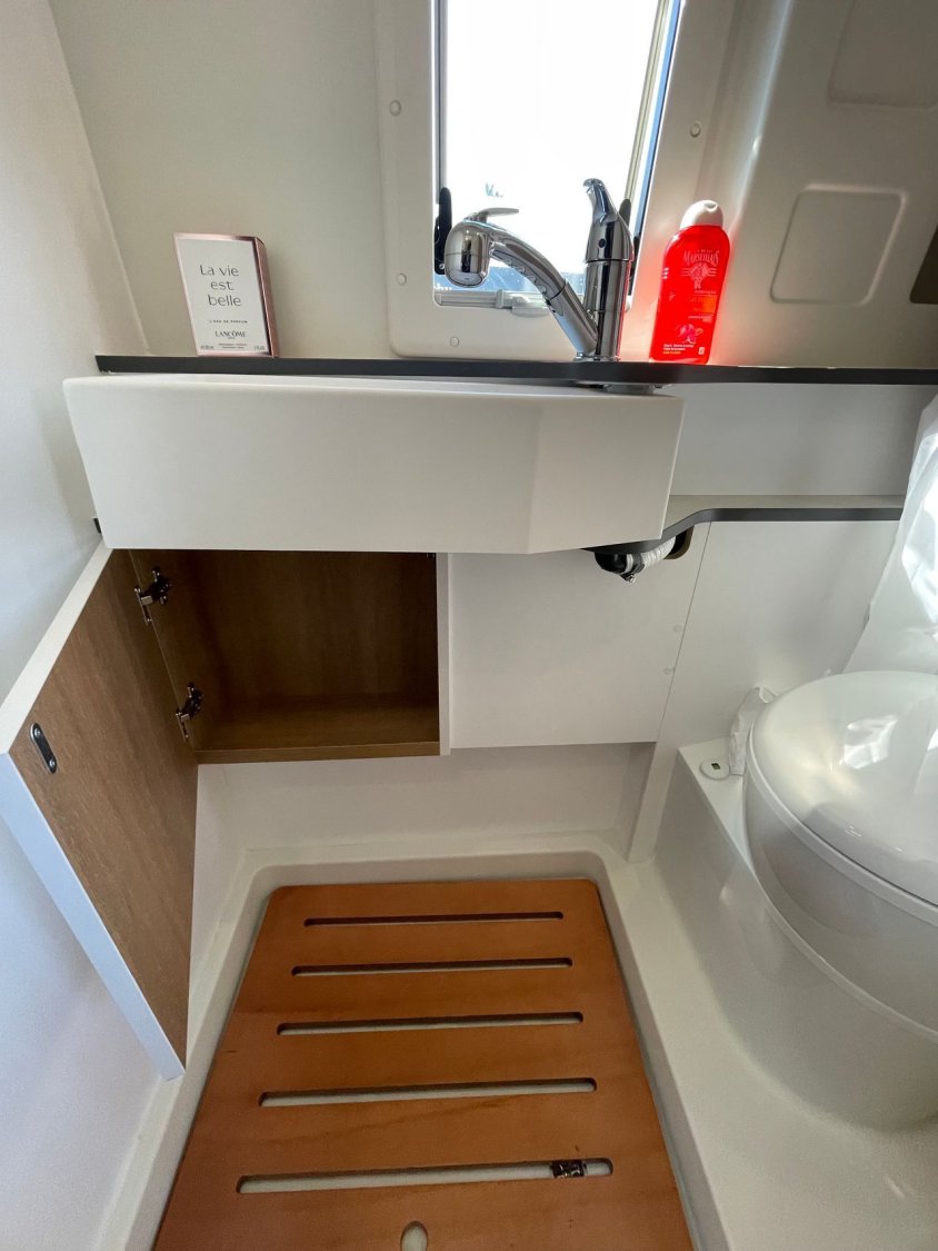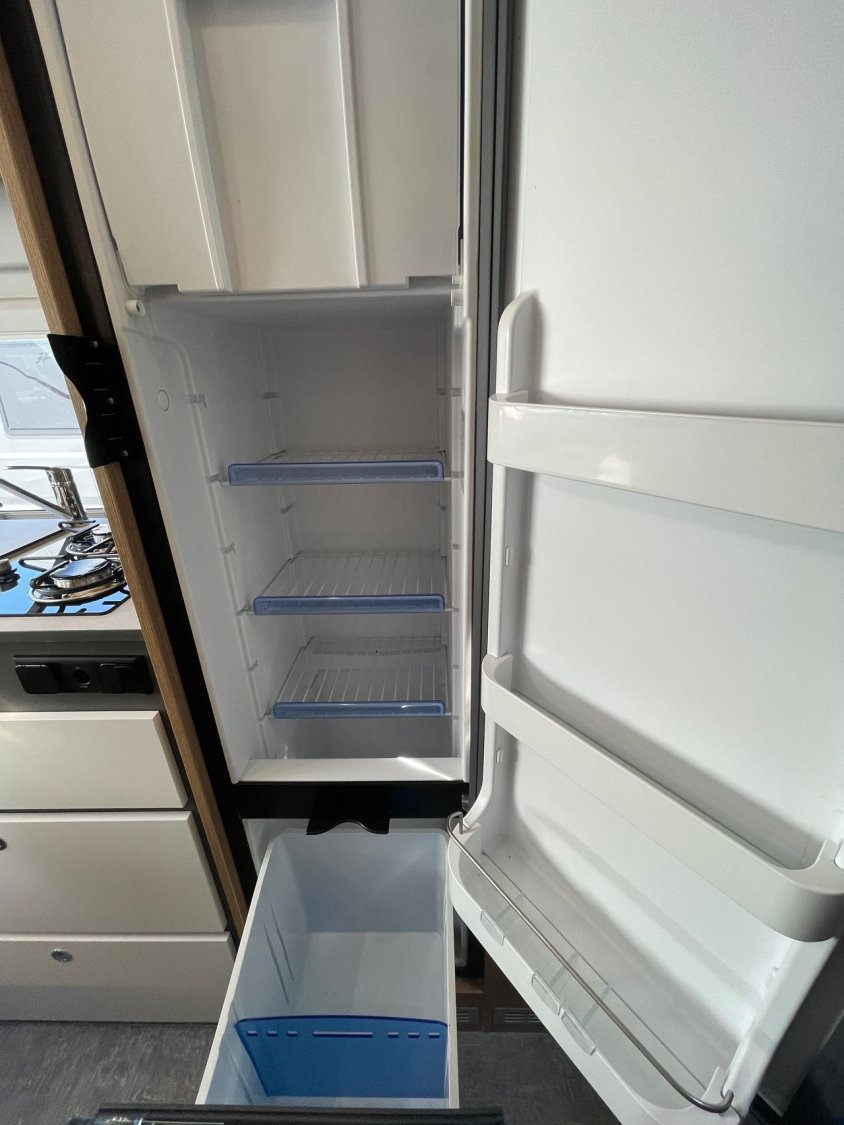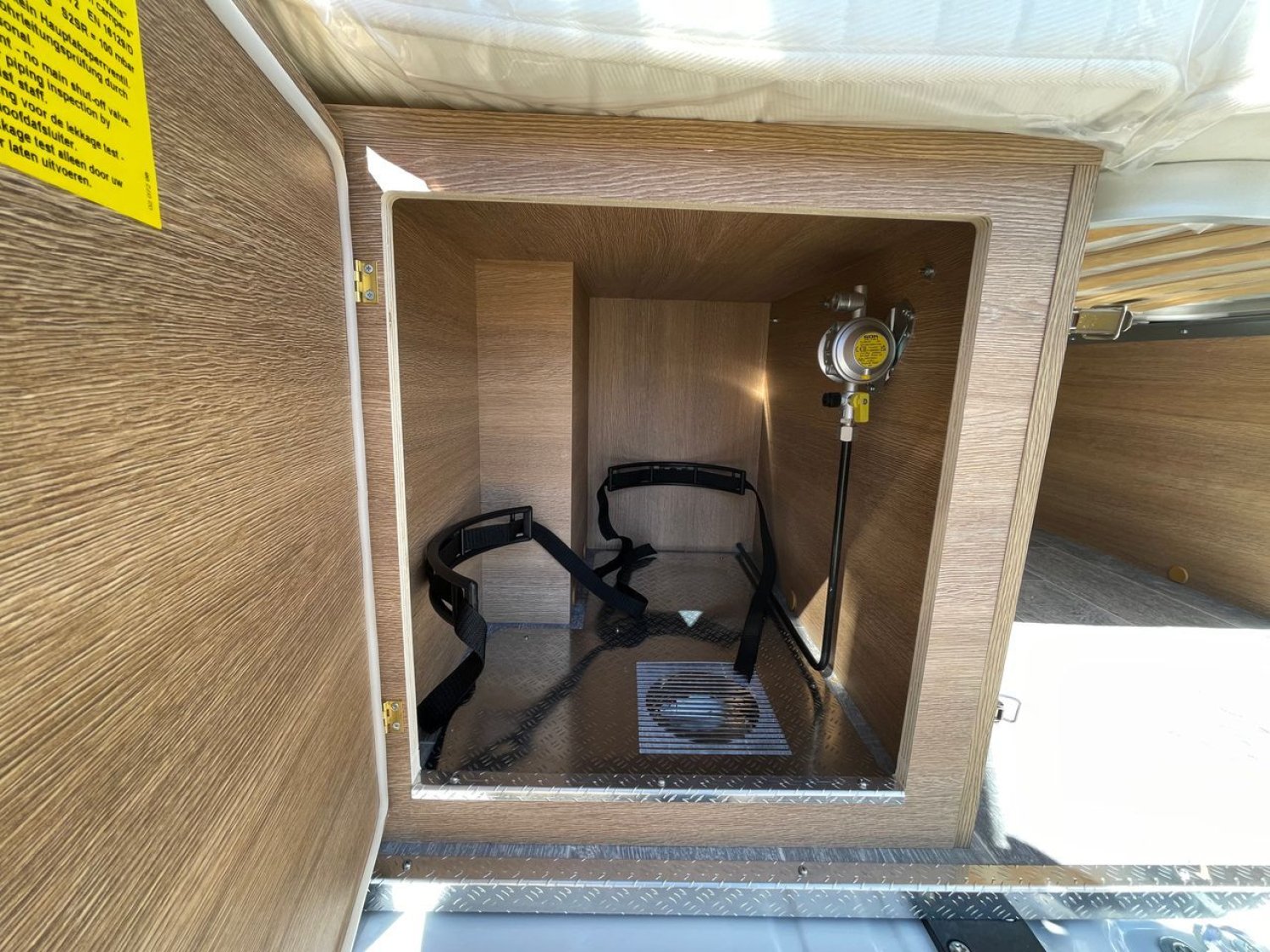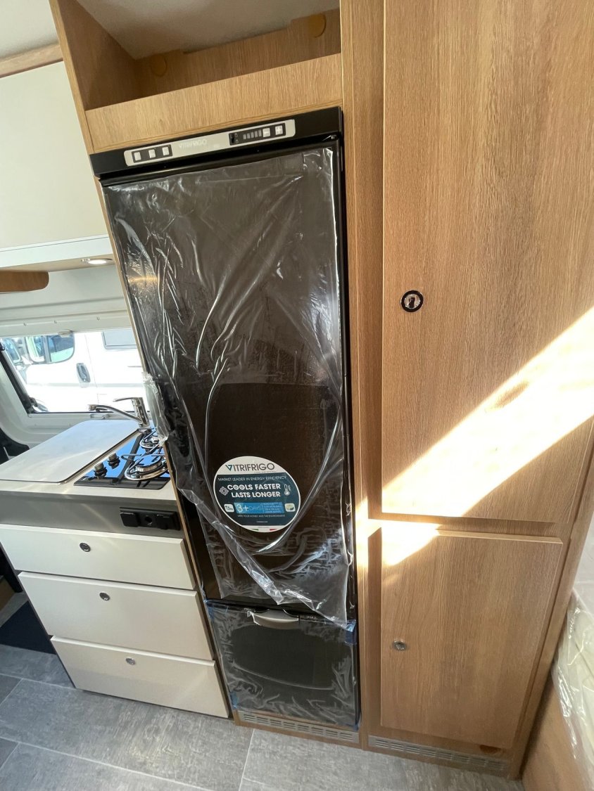 À l'avant, la dinette spacieuse permet également de se transformer en lit d'appoint, et on y retrouve également un grand réfrigérateur à compression de 135L, la climatisation cabine, ou encore un chauffage et chauffe-eau Truma. La salle de bain est équipée d'un bac de douche, d'un WC compact ainsi qu'un astucieux lavabo pivotant.