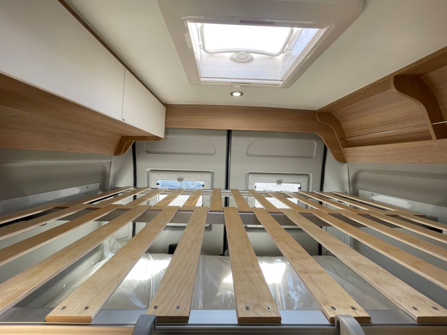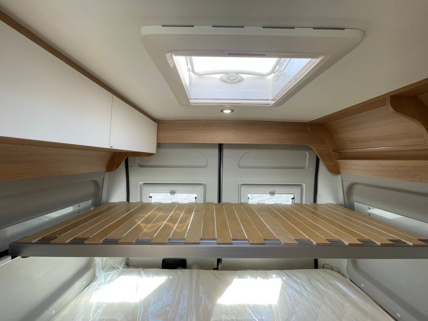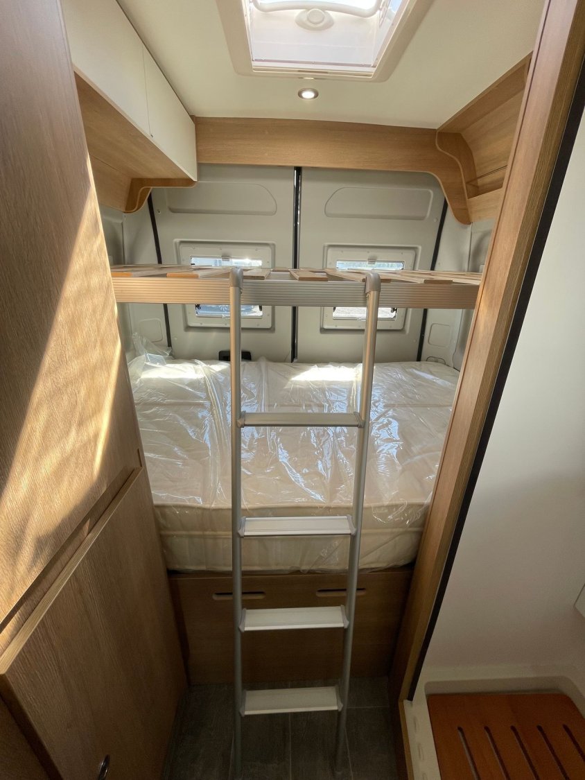 Ce nouveau modèle familial se distingue par ses lits doubles superposés modulables à l'arrière, qui permettent selon les besoins de chacun de bénéficier de trois configurations : deux lits doubles superposés, un lit double en bas et une couchette en haut, ou alors un seul lit double en position basse. Ces possibilités sont rendues possibles grâce à son sommier coulissant, qui permet d'imaginer de nombreuses possibilités.