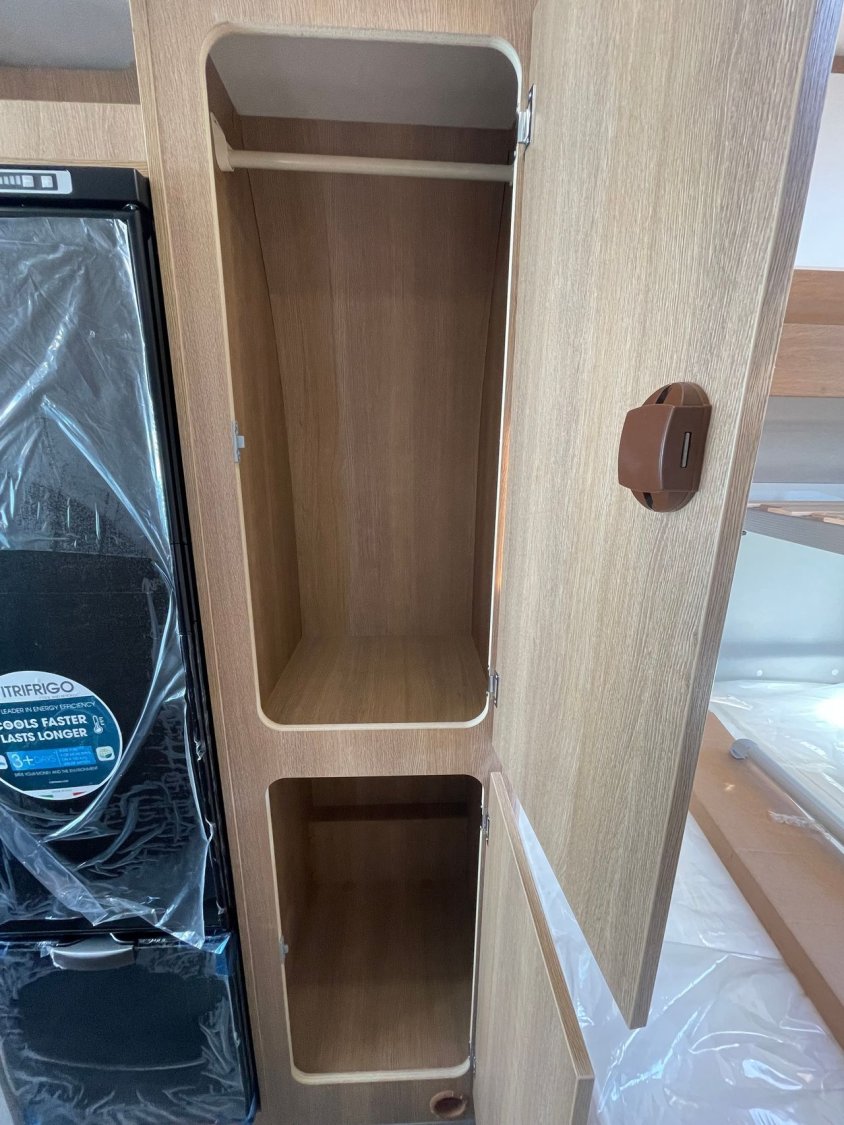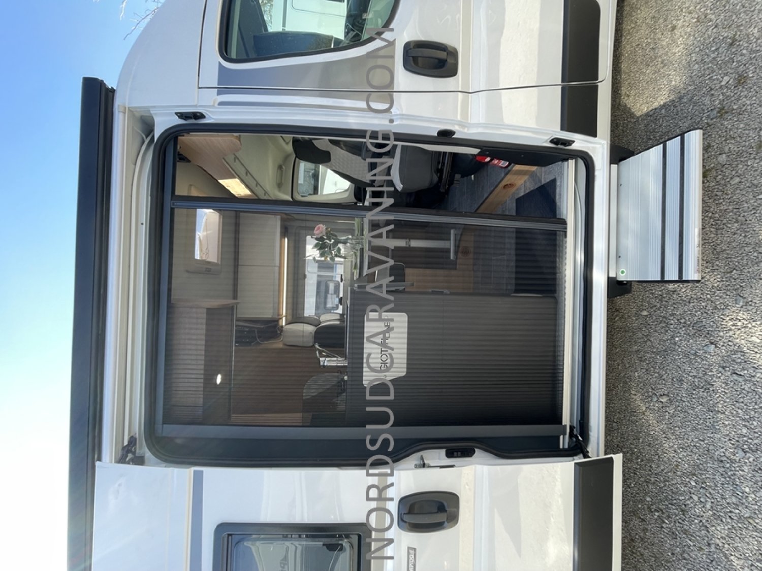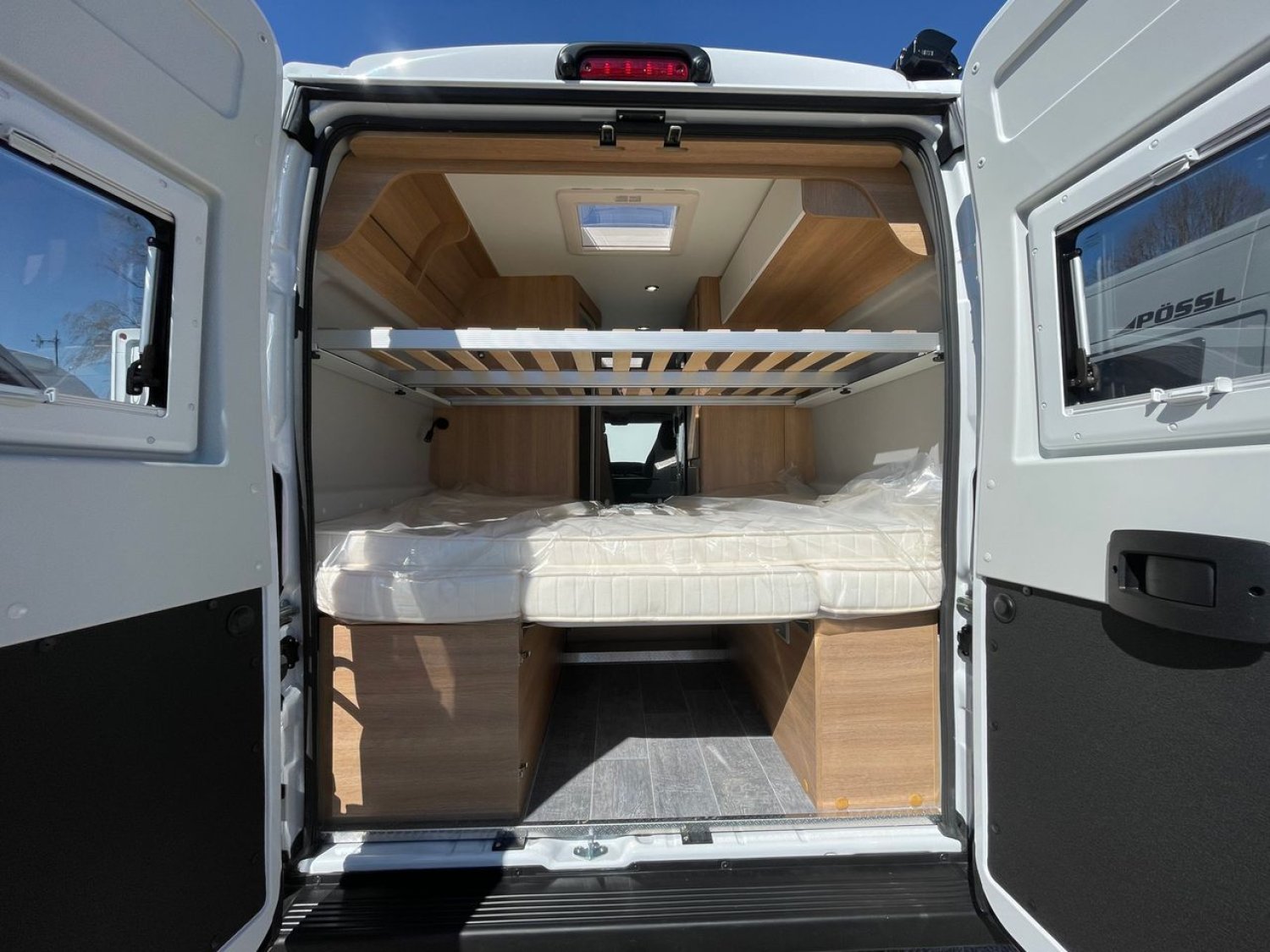 Ce nouveau modèle familial se distingue par ses lits doubles superposés modulables à l'arrière, qui permettent selon les besoins de chacun de bénéficier de trois configurations : deux lits doubles superposés, un lit double en bas et une couchette en haut, ou alors un seul lit double en position basse. Ces possibilités sont rendues possibles grâce à son sommier coulissant, qui permet d'imaginer de nombreuses possibilités.