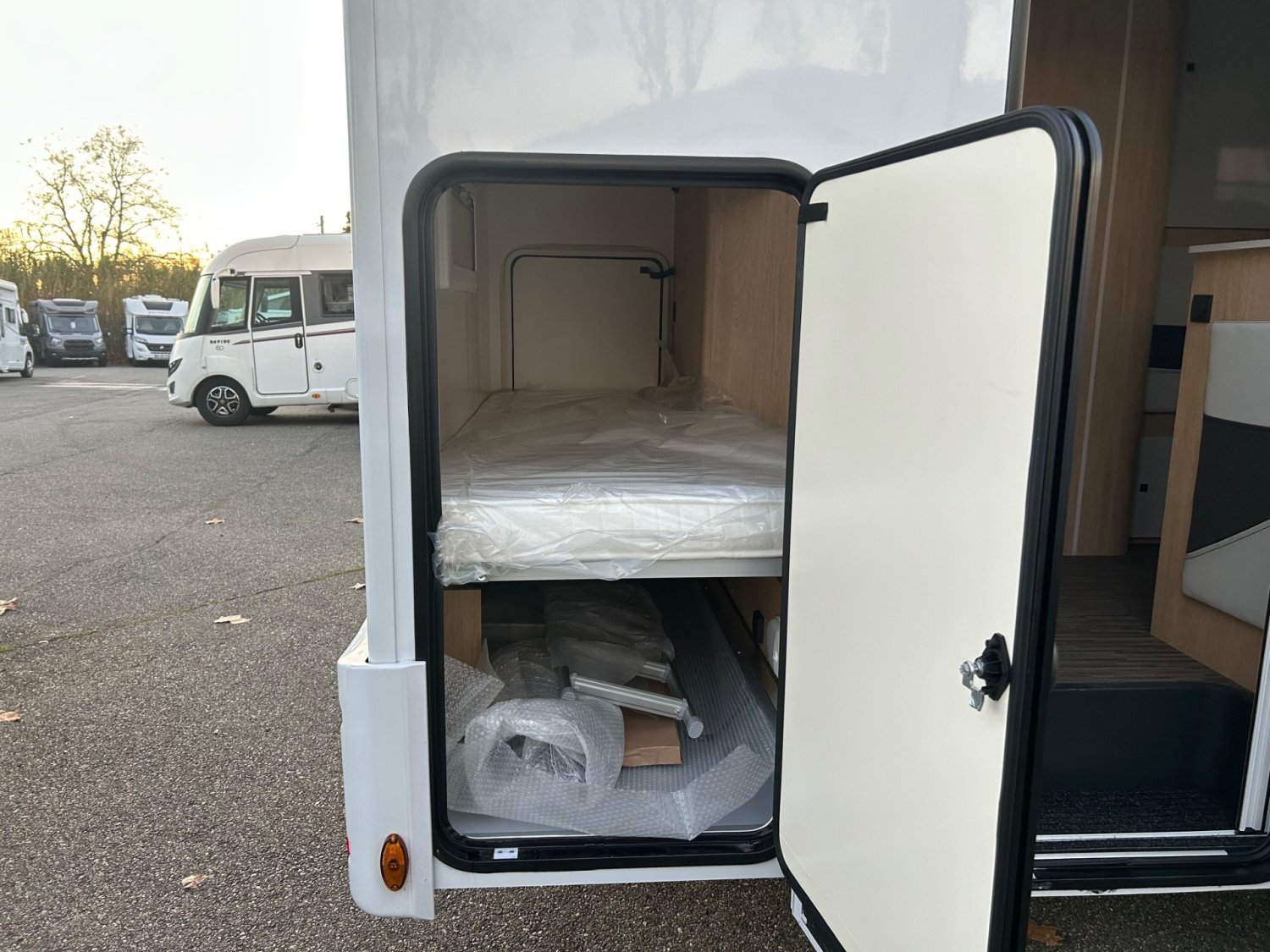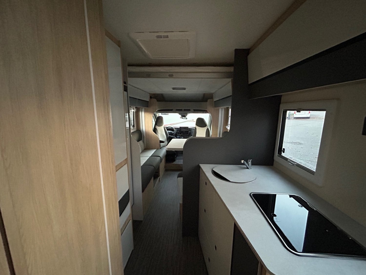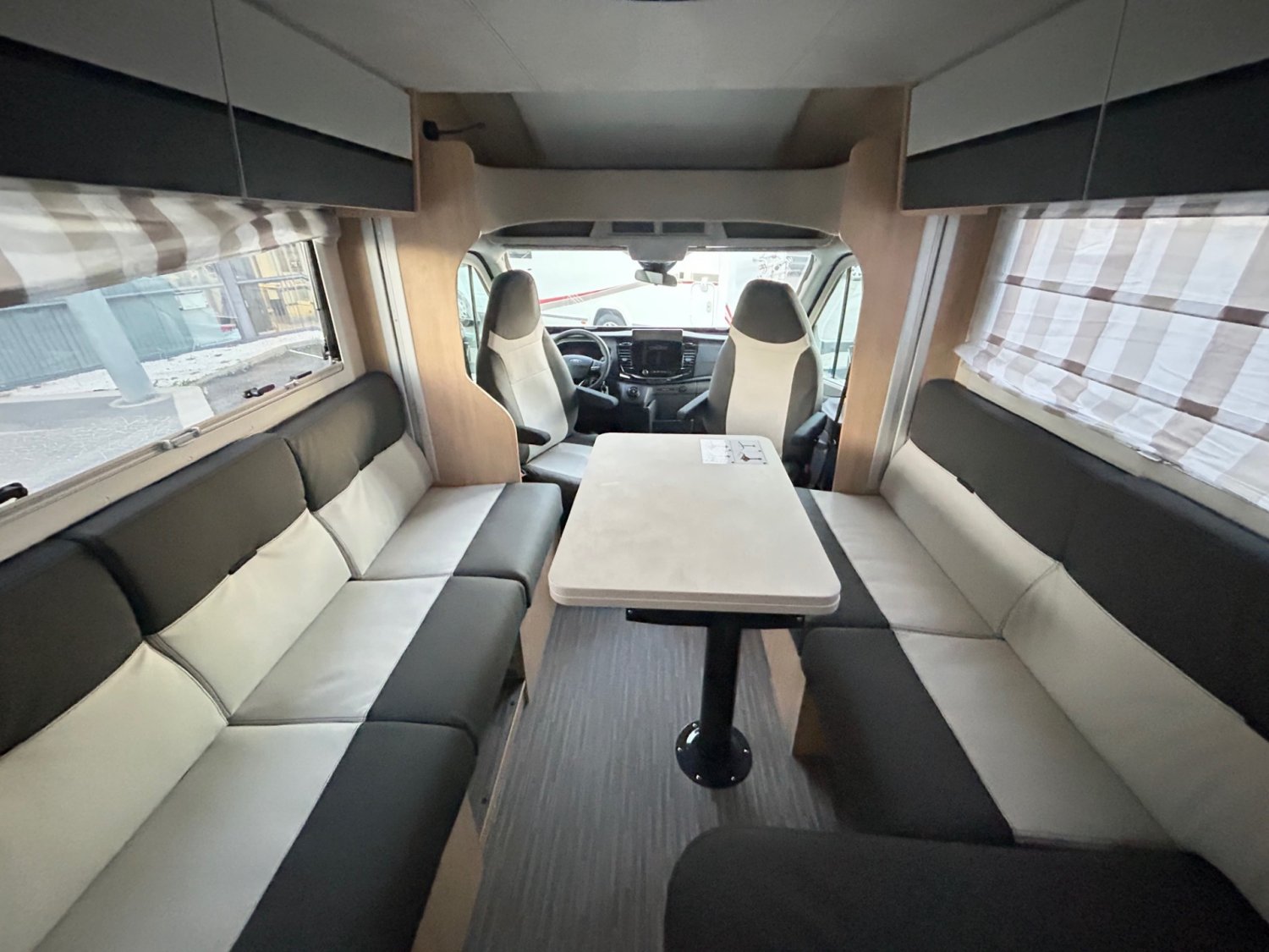 Profilé spacieux (˜ 7,45 m). 6 places carte grise / 6 couchages. Motorisation 2.0 L – 165 ch sur porteur Ford, boîte automatique pour un confort de conduite optimal. Lit de pavillon électrique + lits superposés, salon modulable, cuisine équipée, salle d’eau/douches/WC, frigo de bonne capacité, nombreux rangements astucieux. Ambiance intérieure moderne, équipements complets (moustiquaire, skyroof, store extérieur, panneau solaire possible…)