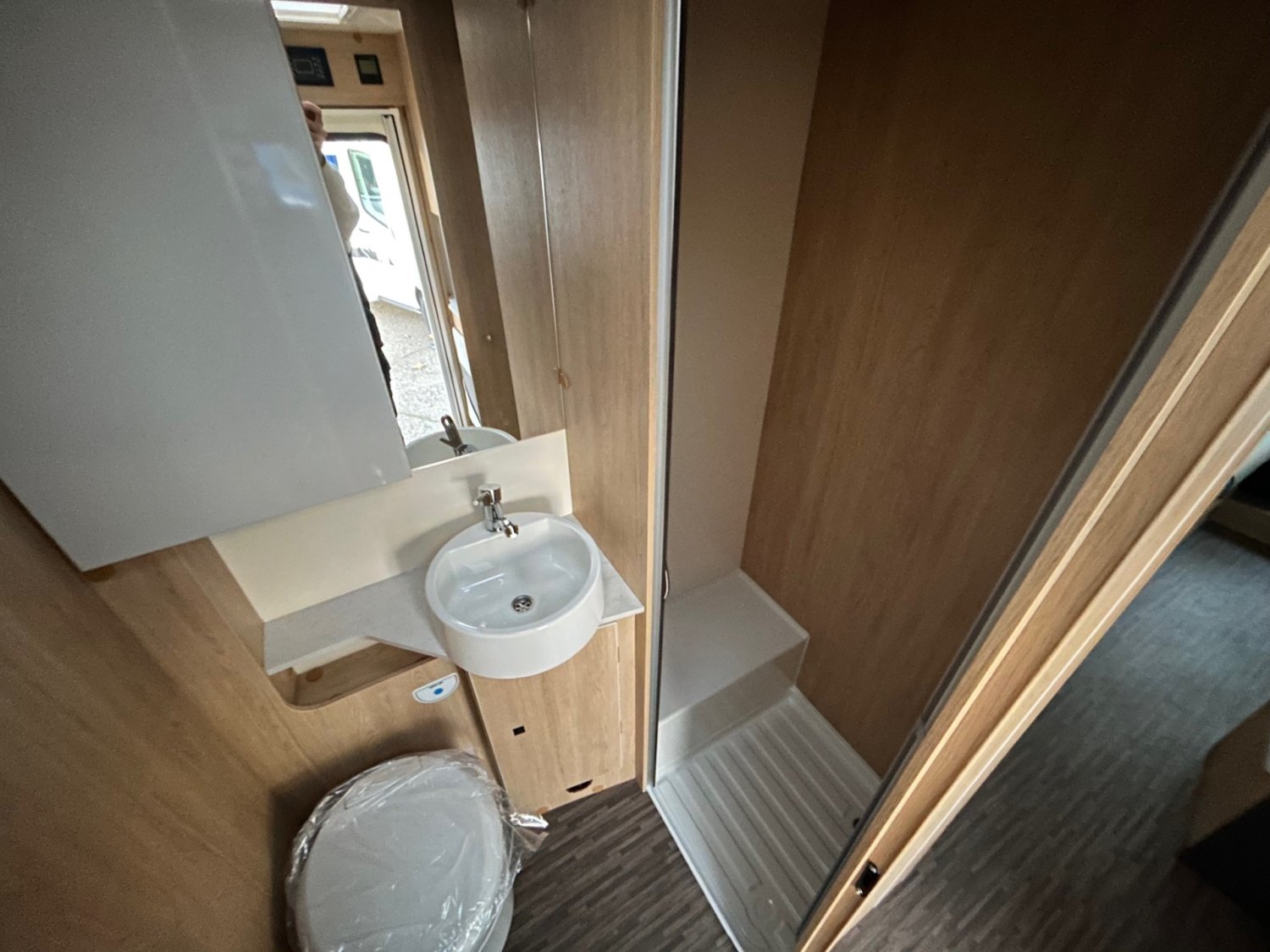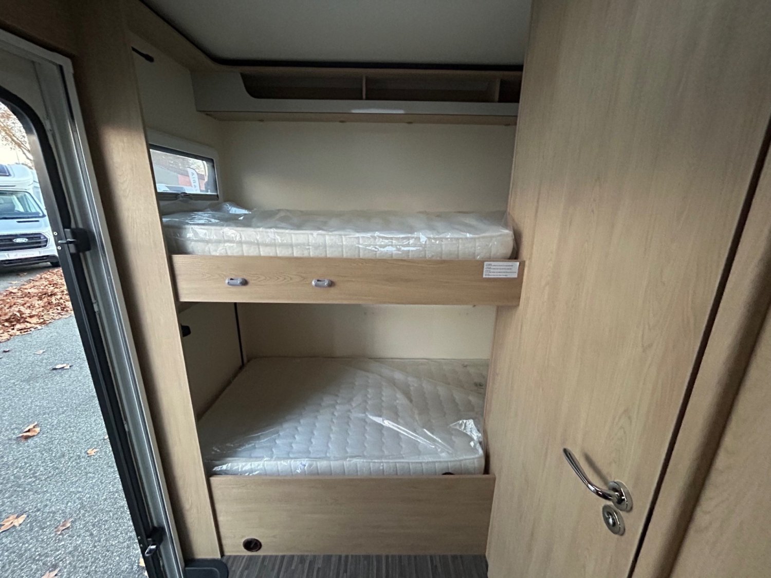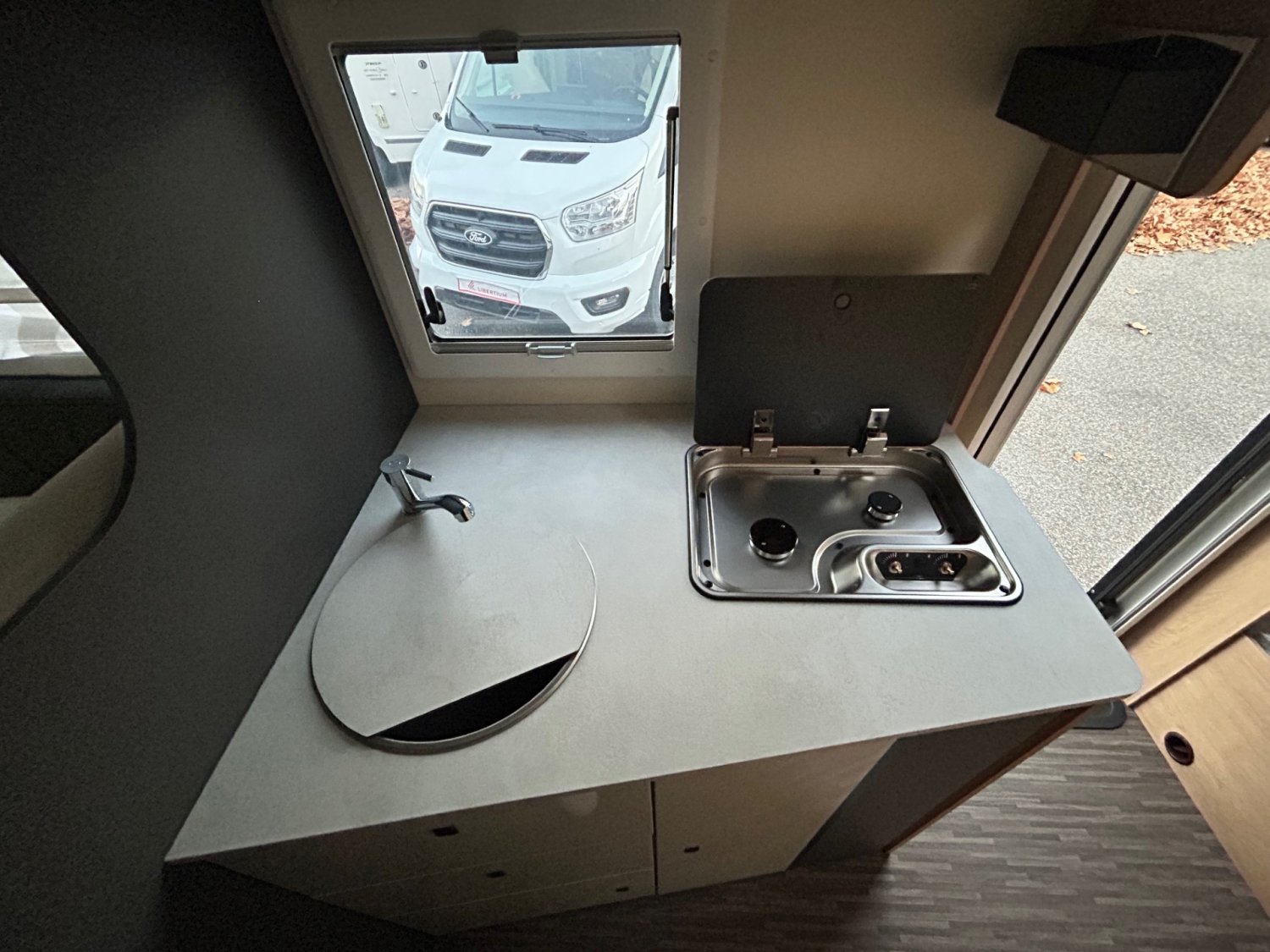 Profilé spacieux (˜ 7,45 m). 6 places carte grise / 6 couchages. Motorisation 2.0 L – 165 ch sur porteur Ford, boîte automatique pour un confort de conduite optimal. Lit de pavillon électrique + lits superposés, salon modulable, cuisine équipée, salle d’eau/douches/WC, frigo de bonne capacité, nombreux rangements astucieux. Ambiance intérieure moderne, équipements complets (moustiquaire, skyroof, store extérieur, panneau solaire possible…)