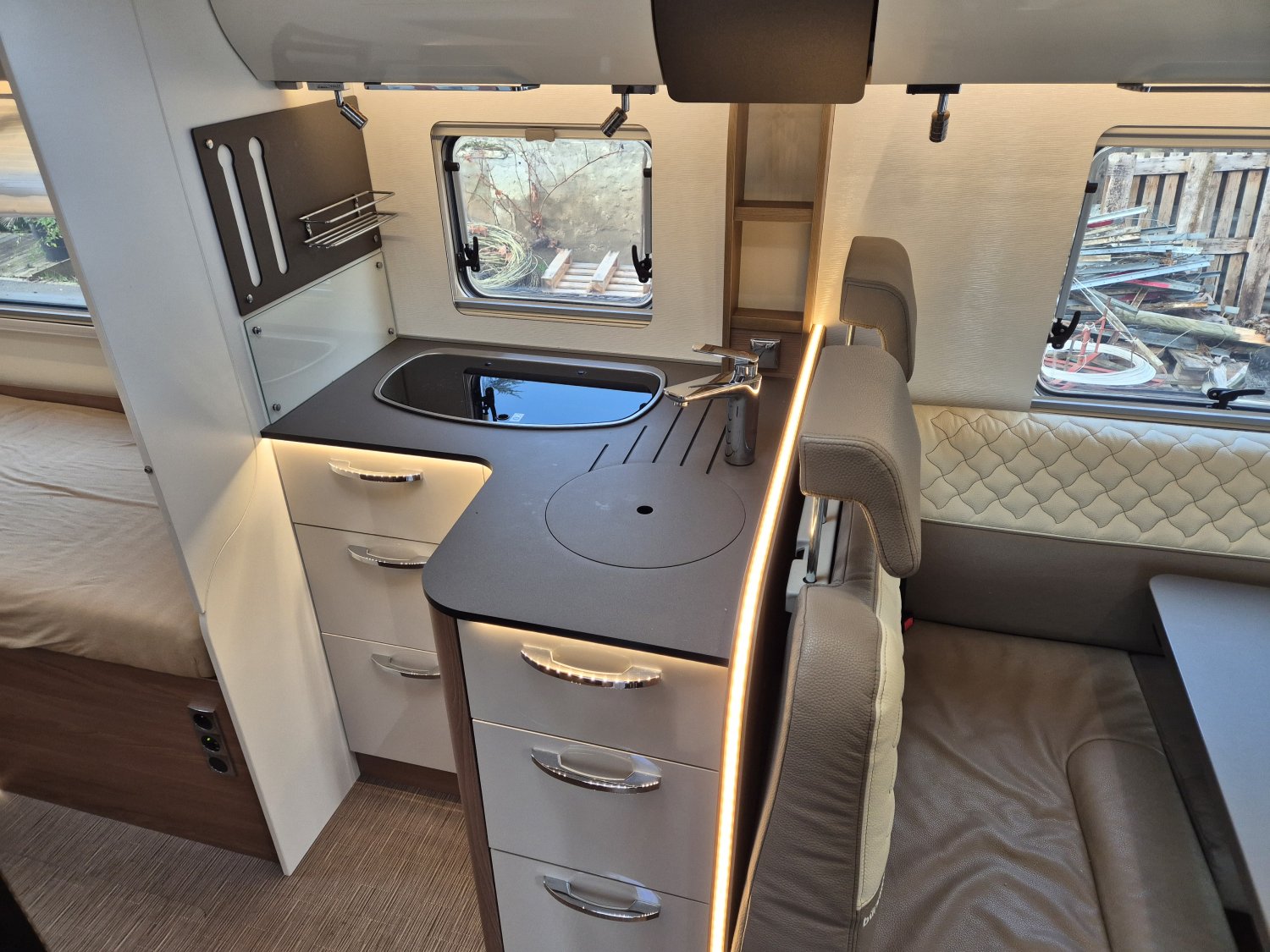 CHAUFFAGE COMBI TRUMA 6, REFRIGERATEUR/CONGELATEUR, STORE EXTERIEUR 4.5M, CHAUFFAGE ROUTE, GAZINIERE 3 FEUX, FENETRE SDB, SELLERIE CUIR, CUISINE EN L, DOUCHE ET WC SEPARES, ECLAIRAGE LED, MOUSTIQUAIRE DE PORTE CELLULE, PORTE VELO, STORES PLISSES DE CABINE, TABLE TELESCOPIQUE, DOUBLE CLOISON DE SEPARATION, SALON FACE A FACE, RESERVOIR EAUX USEES HORS GEL, MARCHEPIED INTÉGRÉ, PORTE CELLULE XL (passage 645mm), PORTE VELO ASCENSIONNEL, WC PORTABLE, CHAUFFE-EAU GAZ
