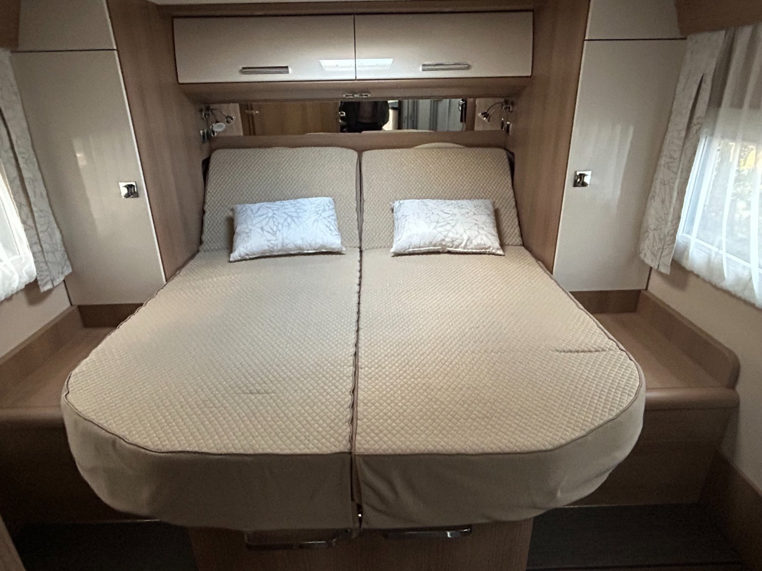 Lit central avec couchage jusqu'à 1,95M - Salon en L avec table pivotante 360° - Cuisine d'angle confort avec comptoir de cuisine surélevé faisant office de séparation et de plan de travail additionnel - grand garage scooter avec une charge de 350Kg.
