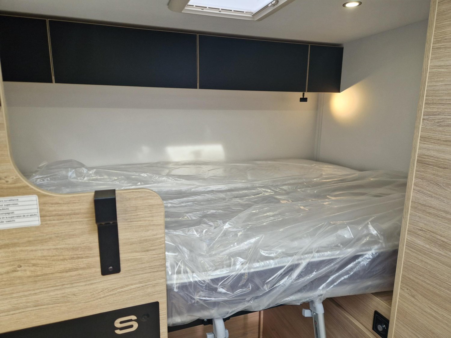 Profilé étroit de marque leader avec lit transversal sur soute et lit de pavillon 2 places électriques. Bien équipé de série, sur une base Ford 165 CV en boite automatique.