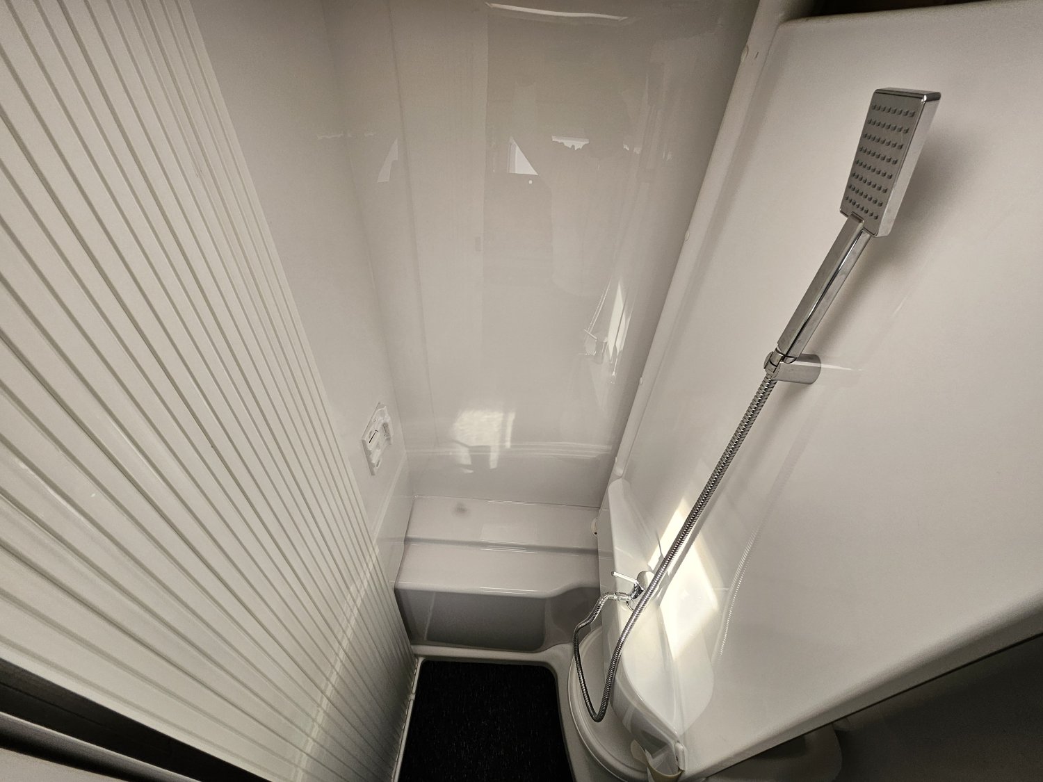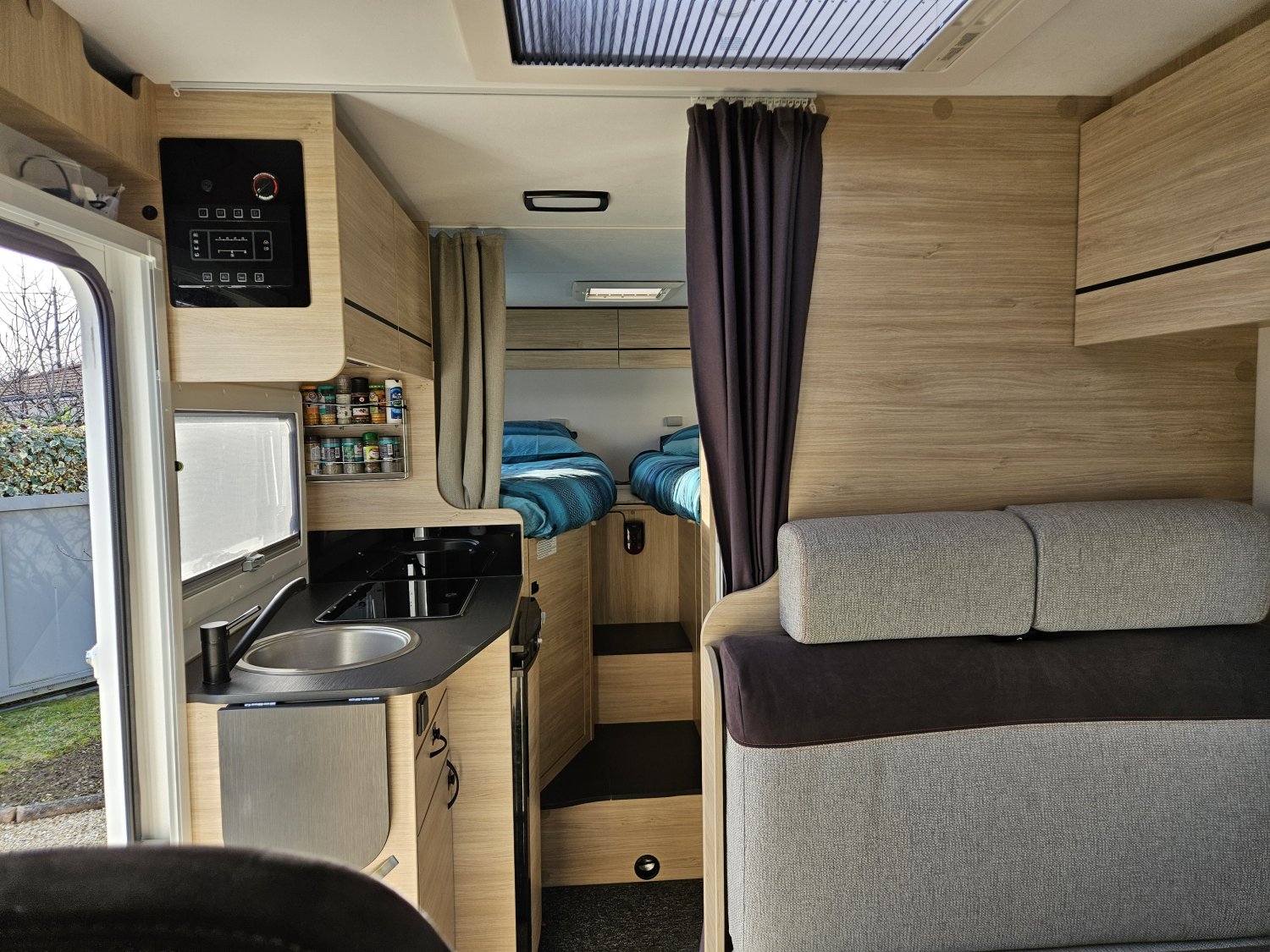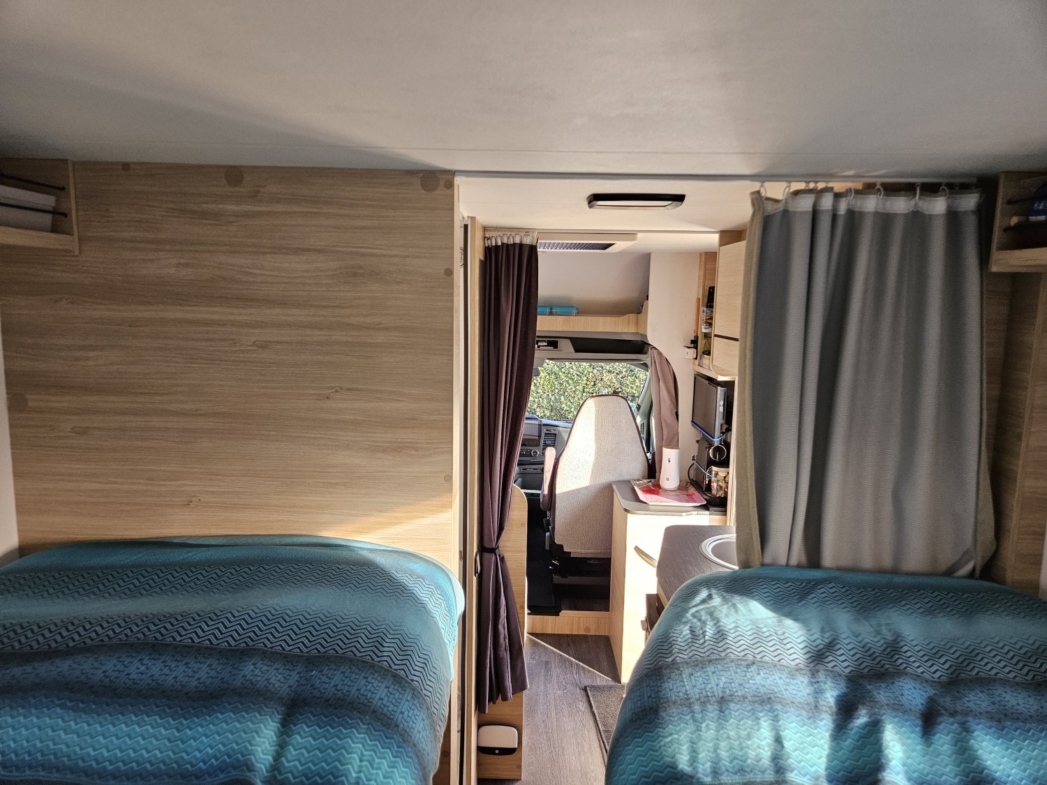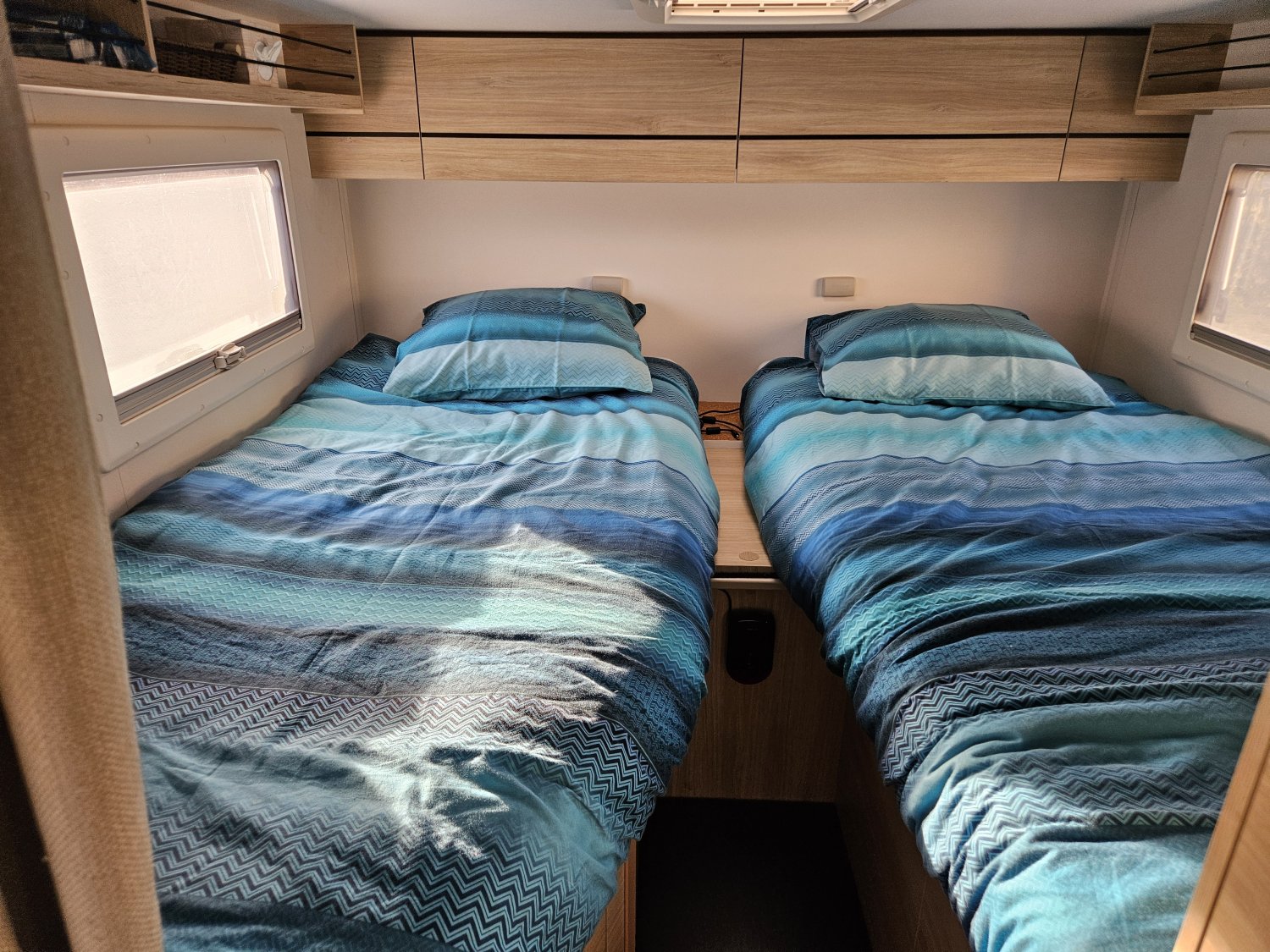 La salle de bain avec son système modulable pour la partie douche est très fonctionnelle et l'implantation des lits jumeaux permet de bénéficier d'une grande soute.