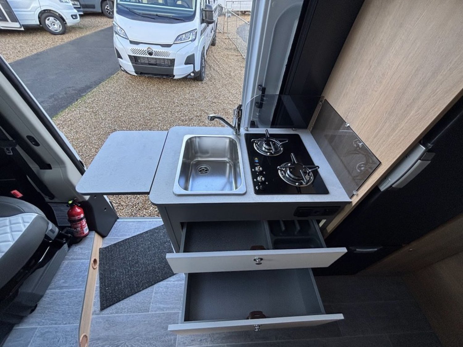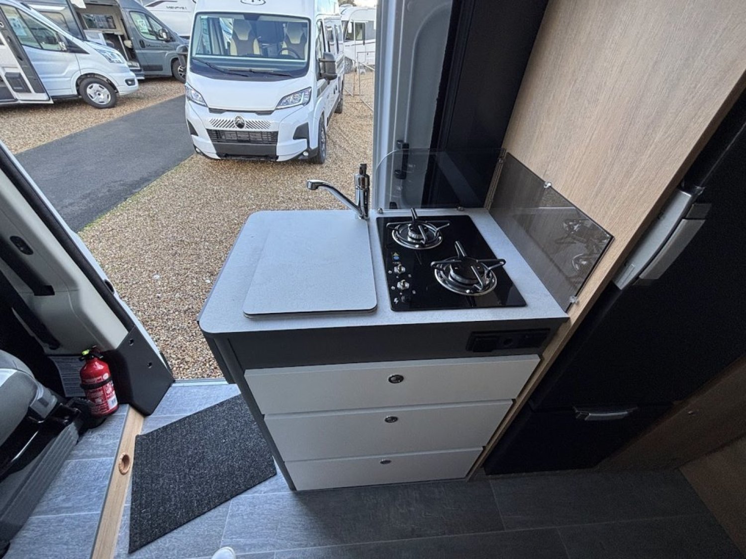 Cuisine en long, Douche modulable, Lit arrière transversal, Lit dînette avant, lit superposés, Salon avant sièges pivotants, WC Cassette.