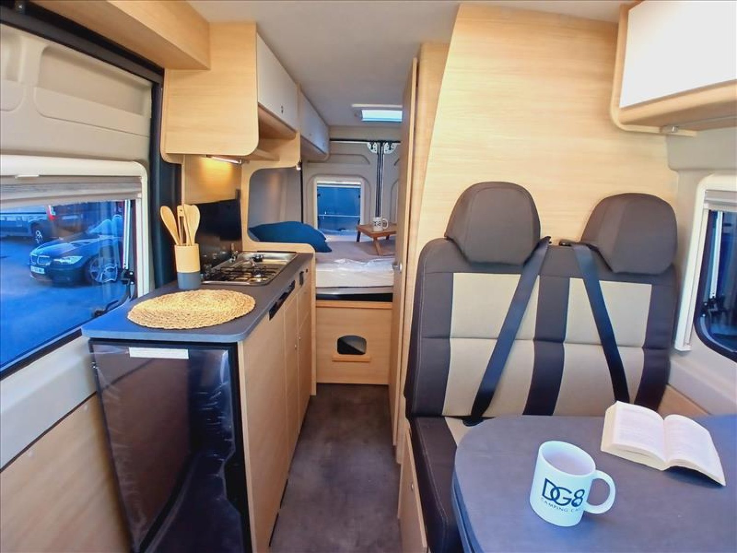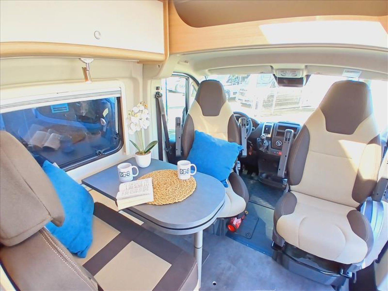 ABS, EBD, ASR, fermeture centralisée avec télécommande., Aération de toit avec moustiquaire., Avec couvercle en verre pour plan de travail supplémentaire, Ceintures de sécurité 3 points., Chauffage à air pulsé., Direction assistée, compte-tours., Éclairage diurne intégré aux phares principaux., Eclairage intérieur cabine de conduite, Eclairage LED et nombreux spots sur rails pour une ambiance, Eclairage LED puissant également dans la partie douche., Feux de jour intégrés aux projecteurs, Freins à disque avant et arrière., Grand miroir., Isolation complète plancher, plafond, Lève-vitres électriques côté conducteur et passager., Multiples espaces et possibilités de rangements, Niche pour emplacement TV, Plan de travail et table en matière robuste., Plaque de cuisson 2 feux, allumage piézoélectrique, Portes de placard de qualité, Réfrigérateur avec compartiment congélateur intégré., Réglage des phares en hauteur et anti-démarrage., Revêtement de sol moderne aspect béton entretien facile, Siège conducteur réglable en hauteur., Sièges conducteur et passager pivotants, Tiroir à couverts., Tiroirs spacieux dans le bloc cuisine., Trappe de rangement dans le plancher sous la table, Turbodiesel 4 cylindres, Euro 6d, filtre à particules., Véhicule neuf d'exposition, WC pivotant pour optimiser l'espace.