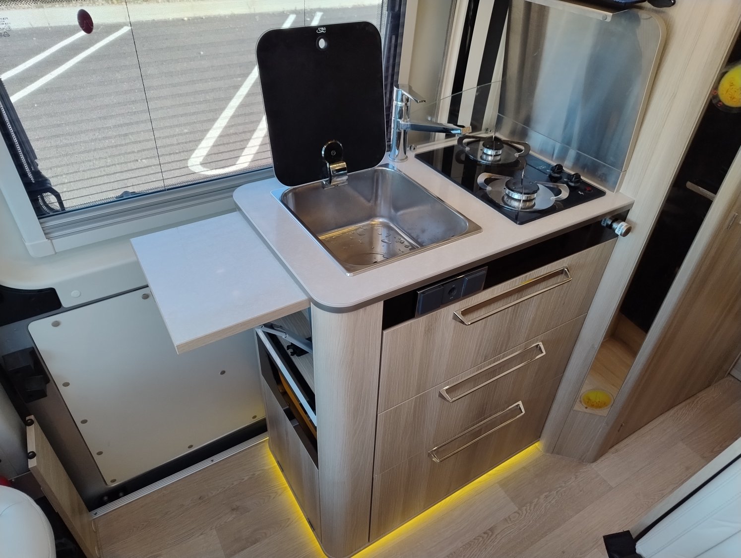 Ce fourgon compact vous accompagnera partout sans difficulté ! Son design moderne et lumineux grâce à son toit panoramique sont gages de séjours à bord très agréables. Pour l’hiver son isolation performante et son chauffage TRUMA vous garantissent de belles et confortables nuits.