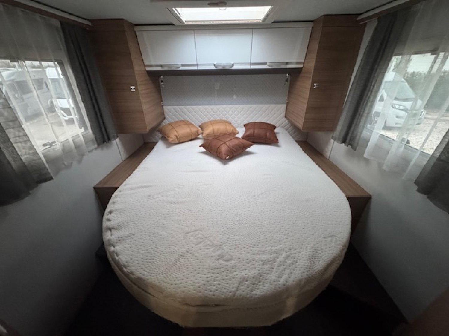 Cet Adria intègre un salon face-face, un large espace cuisine, une salle de bain indépendante, un grand lit central pour 2 personnes (195x150) avec énormément de rangement et un lit de pavillon électrique pour 2 personnes (190x130).