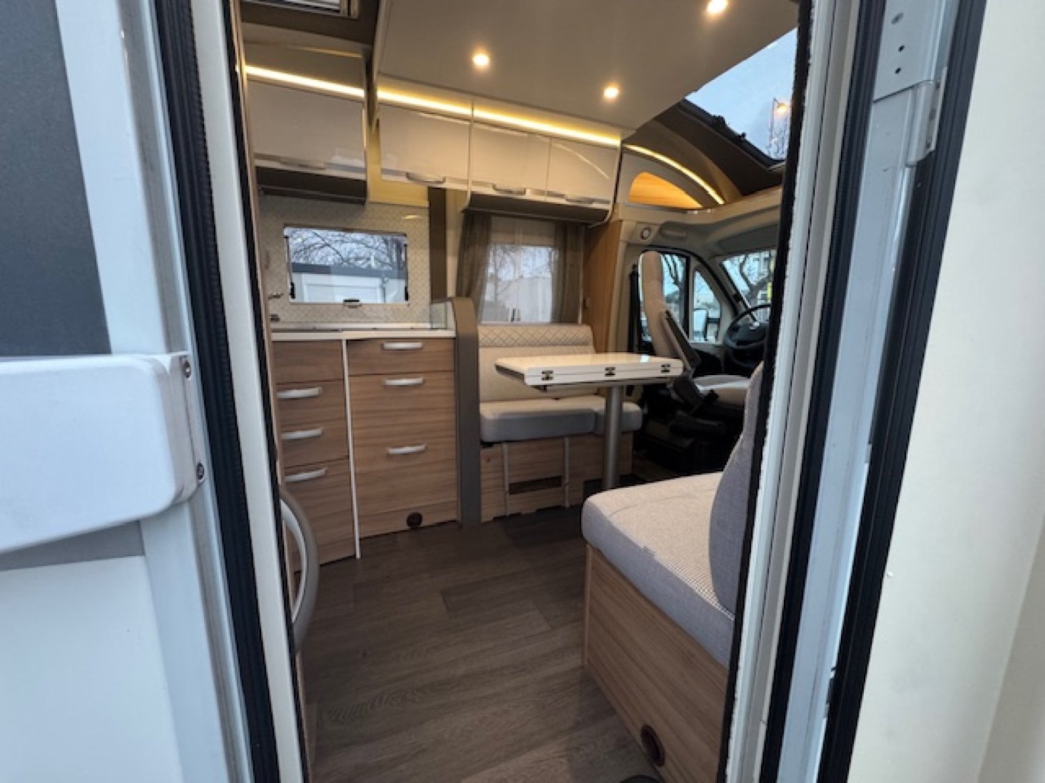 Camping-car , profile, salon avant avec sièges pivotants, banquette face face, réfrigérateur/conservateur, douche séparée, très belle salle de bains, lit central