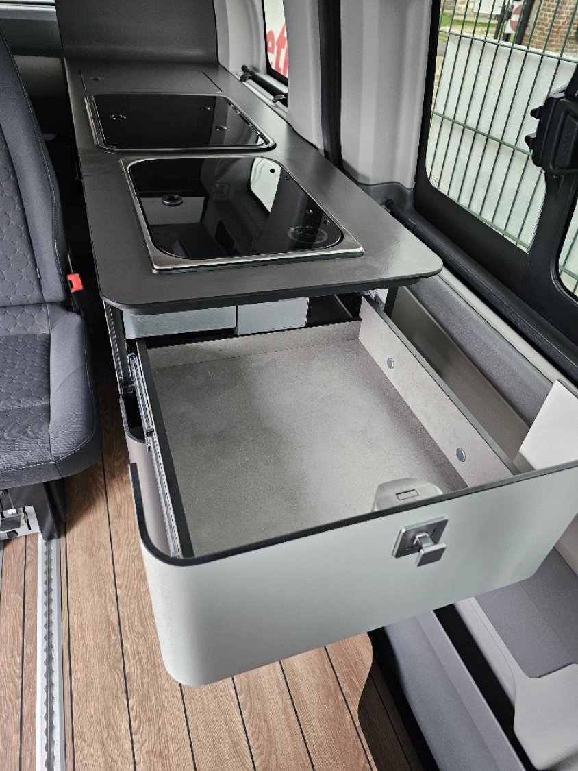 Le nouveau City Camp (5,05 m) répond à tous les scénarios imaginables : un week-end sportif, une virée chez des amis, un déménagement, un voyage en famille, etc. Un vrai couteau suisse, avec deux portes latérales coulissantes, quatre places nuit, des sièges individuels et un lit bas totalement démontable.