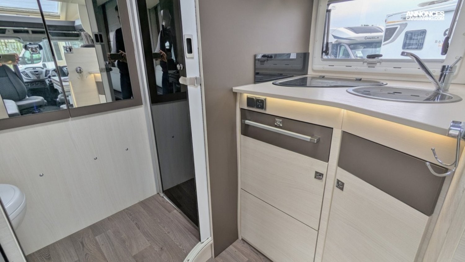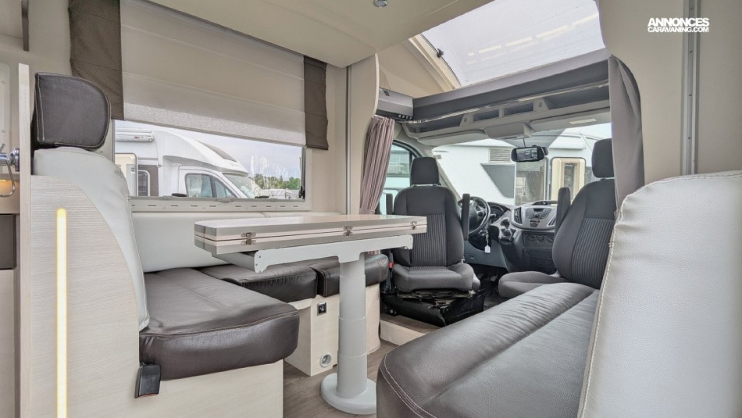 Camping car profilé ultra compact, spacieux et très bien équipé sur Ford 2,0 TDCi 170 cv avec lit principal pavillon de 140 x 190, très grand salon convivial convertible en couchage de deux personnes, salle d'eau/WC transversale avec douche séparée et dressing, cuisine avec frigo/congel 175 litres. Un bel espace à vivre !