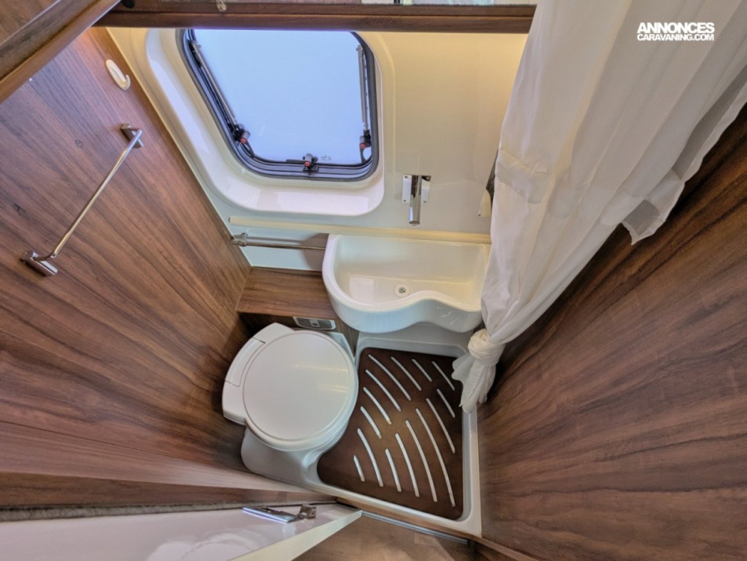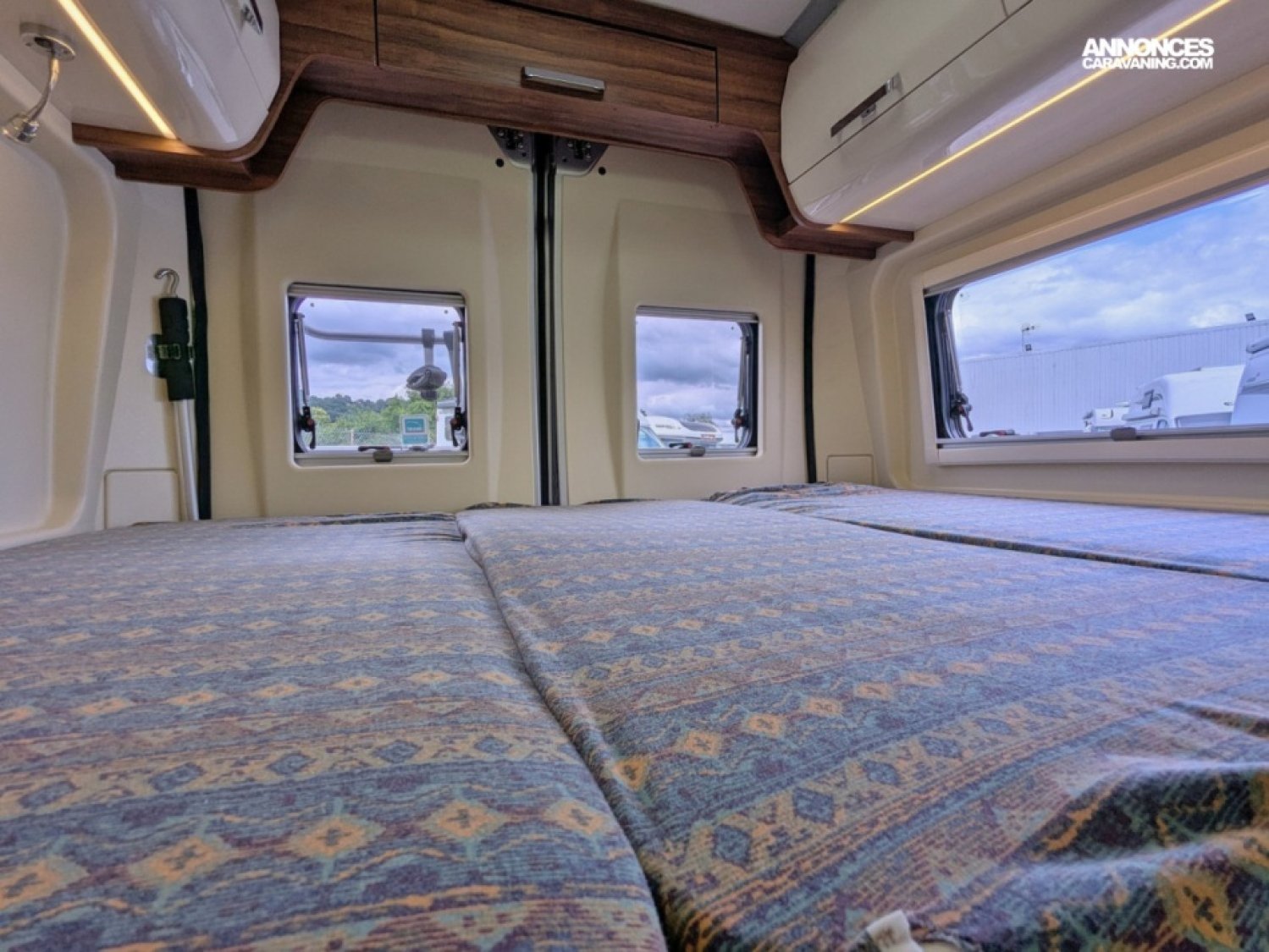 Fourgon aménagé de 5,99 m sur Fiat 2,3 JTD 130 cv avec lit transversal, salle d'eau avec WC et douche, cuisine équipée de frigo, plaque gaz 2 feux et de nombreux tiroirs fonctionnels, et salon avant avec sièges pivotants.