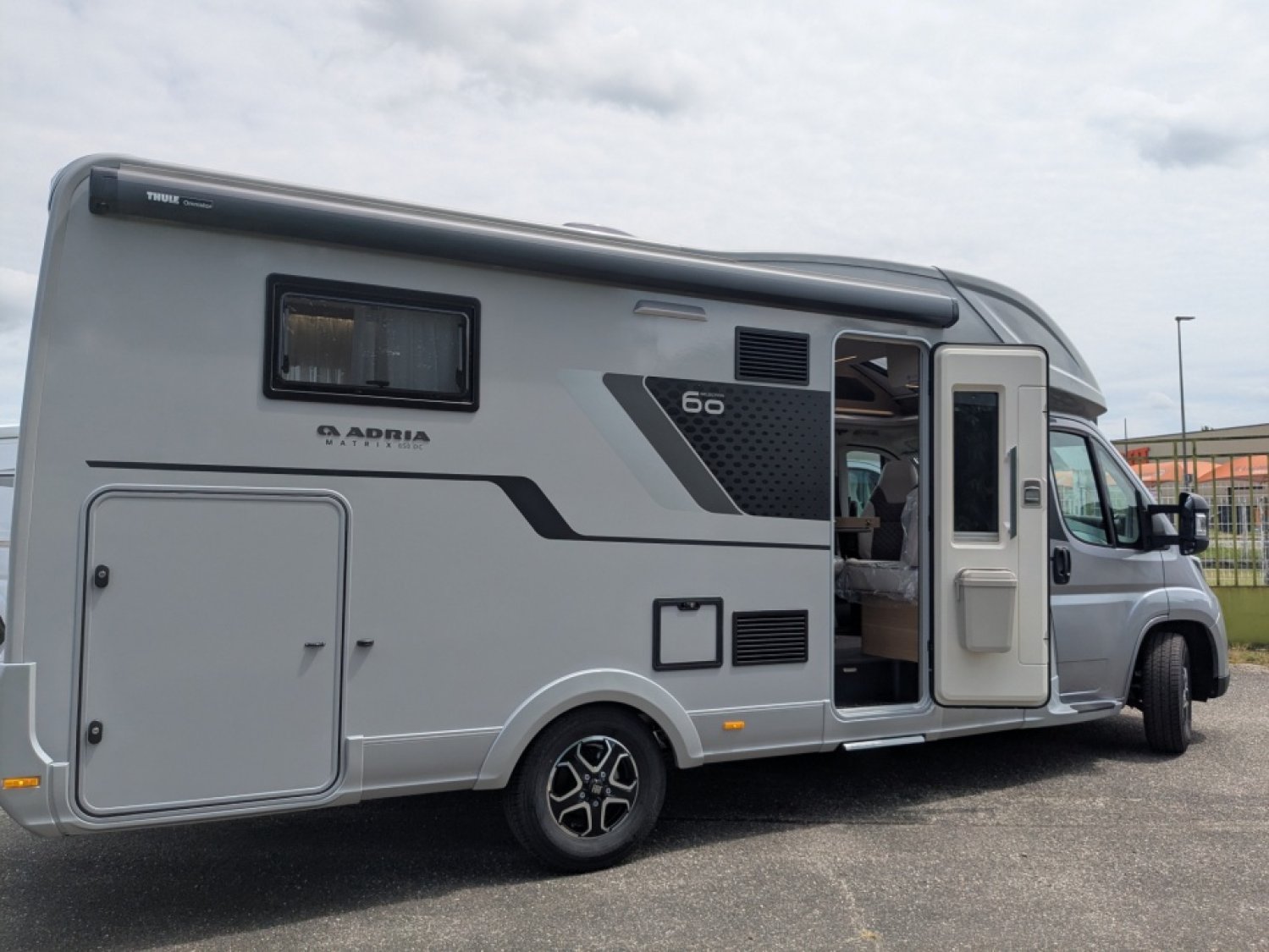 A NE PAS MANQUER ! Série limitée 60ème anniversaire !! Adria Matrix 650 DC, profilé sur Fiat 2.2 140 cv en boîte auto AT8 avec lit central sur soute réglable en hauteur électriquement, salle d'eau/WC, douche indépendante, cuisine équipée avec grand frigo/congel et maxi salon face/face avec sièges pivotants. Lit de pavillon électrique de deux personnes au-dessus du salon. Ce véhicule est équipé d'un double plancher de service et présente donc un plancher plat sur toute sa longueur. Il bénéficie également de la suspension pneumatique. Très peu de disponibilité !
