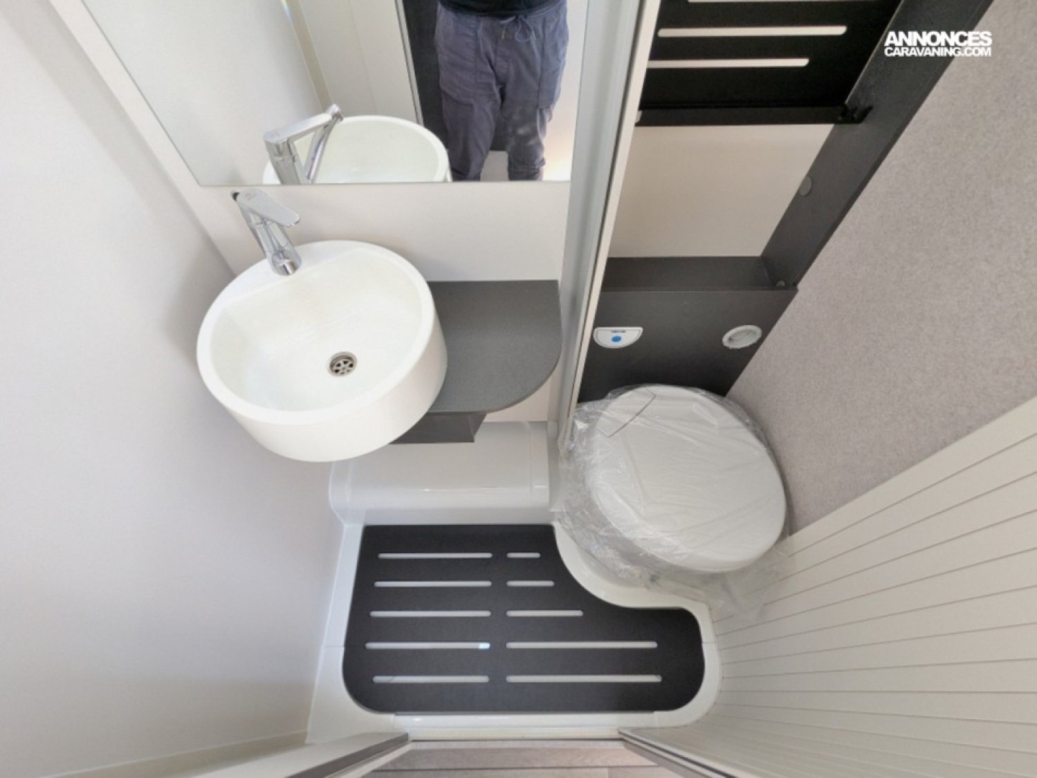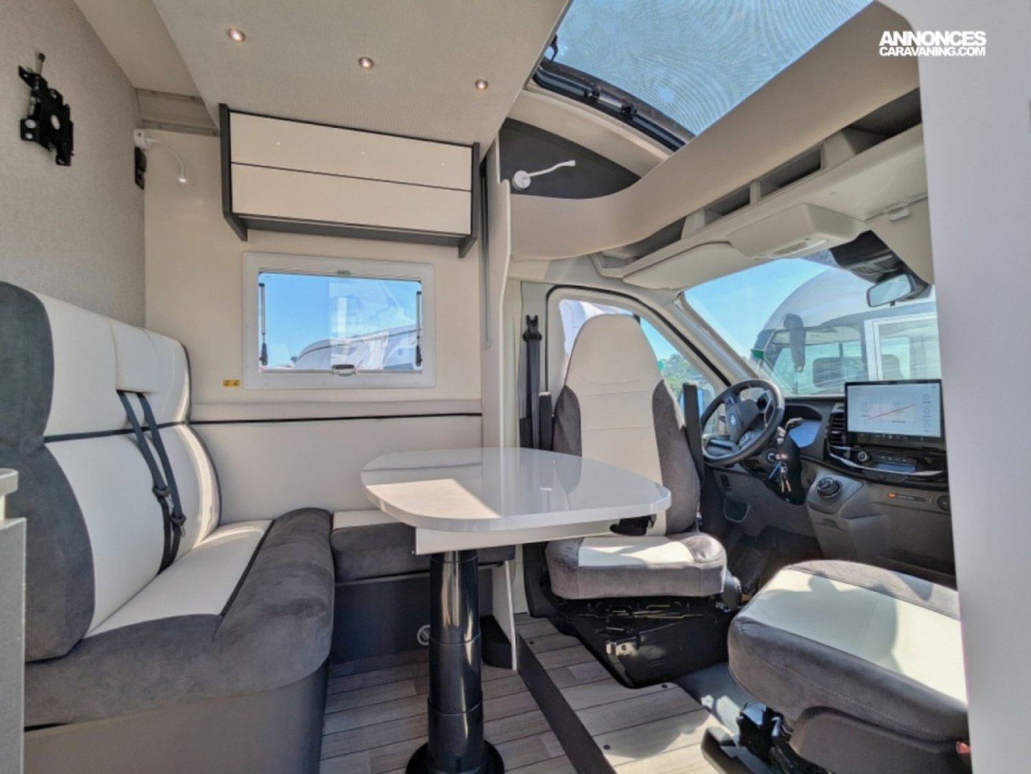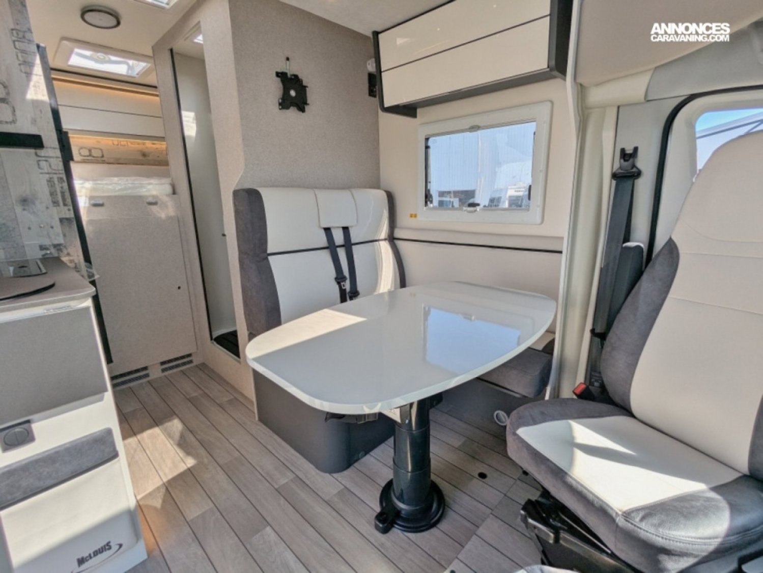 Mc Louis MC4-331 Slim 2026, un profilé compact de 2,14 de large sur le nouveau Ford 165 cv en boîte automatique avec lit transversal sur soute, salle d'eau vario avec douche séparée par une paroi pivotante, cuisine avec frigo trimixte 138 L et maxi salon avec sièges pivotants. Modèle exposé avec lit de pavillon électrique au-dessus du salon et couchage additionnel salon (inclus dans le prix). Le parfait compromis entre le fourgon et le profilé !