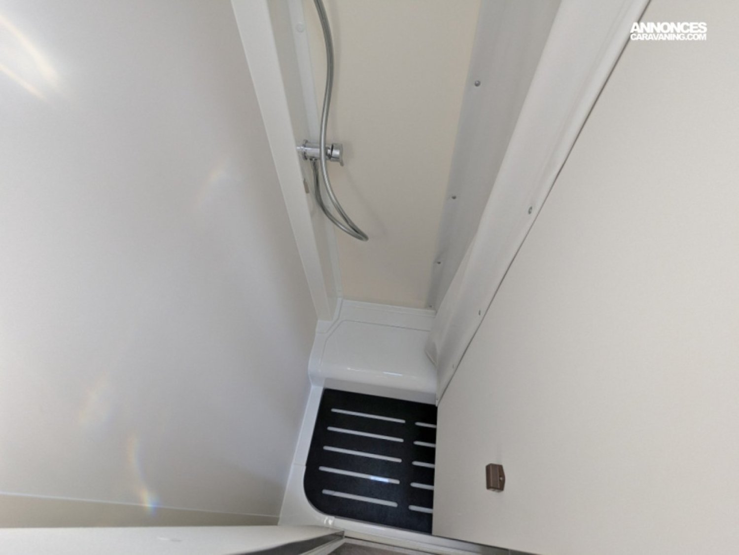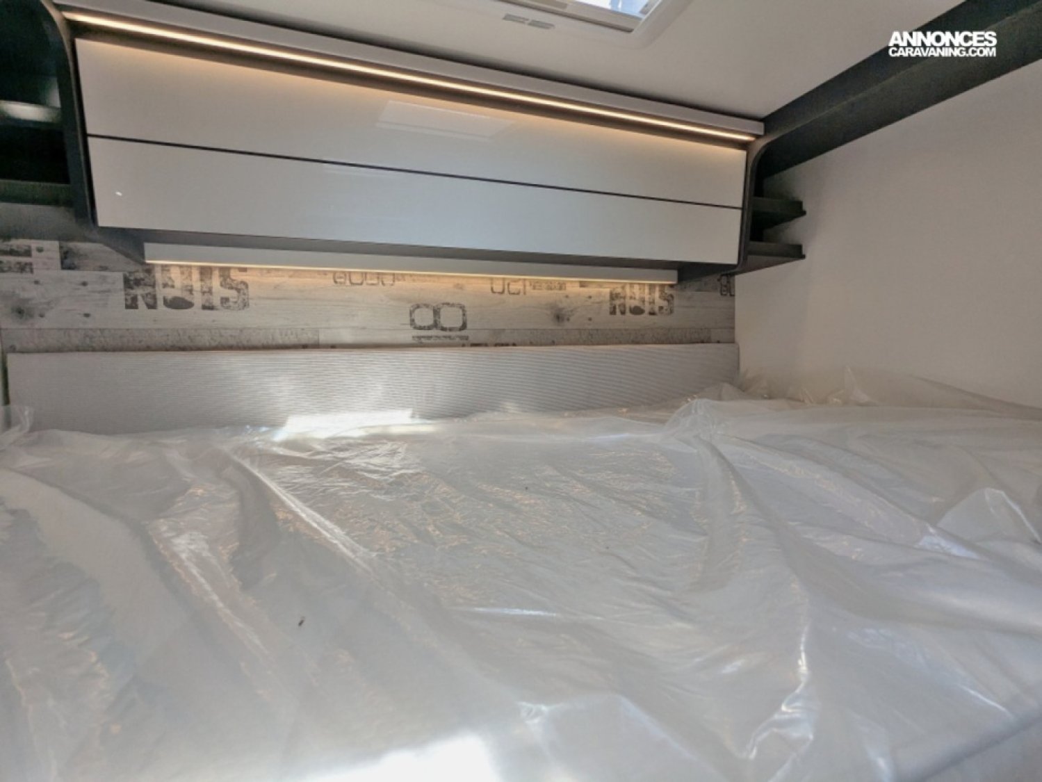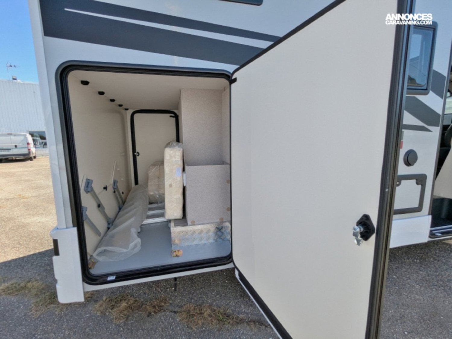 Mc Louis MC4-331 Slim 2026, un profilé compact de 2,14 de large sur le nouveau Ford 165 cv en boîte automatique avec lit transversal sur soute, salle d'eau vario avec douche séparée par une paroi pivotante, cuisine avec frigo trimixte 138 L et maxi salon avec sièges pivotants. Modèle exposé avec lit de pavillon électrique au-dessus du salon et couchage additionnel salon (inclus dans le prix). Le parfait compromis entre le fourgon et le profilé !