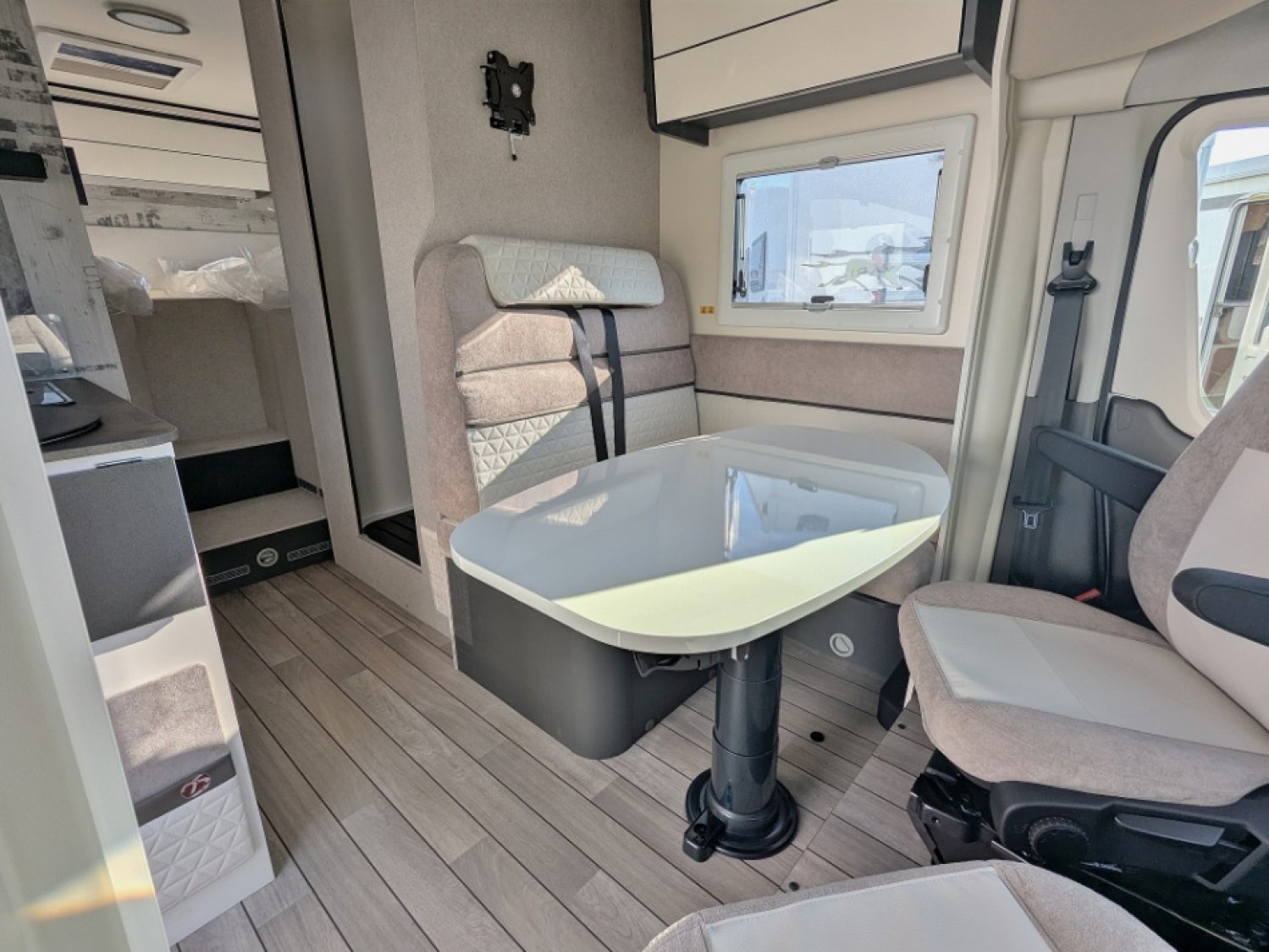 Mc Louis MC4-339 Slim 2026, un profilé compact de 2,14 de large sur le nouveau Ford 165 cv avec lits jumeaux sur soute, salle d'eau vario avec douche séparée par une paroi pivotante, cuisine avec frigo trimixte 138 L et maxi salon avec sièges pivotants. Modèle exposé avec lit de pavillon électrique au-dessus du salon et couchage additionnel salon (inclus dans le prix). Le parfait compromis entre le fourgon et le profilé !
