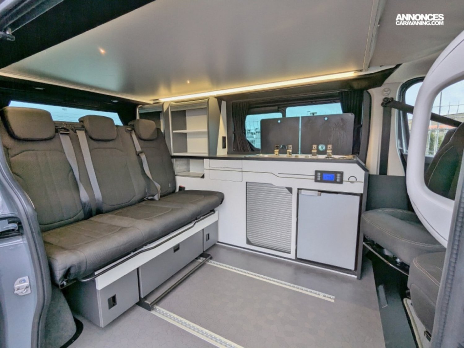 Salon avant avec sièges pivotants, très belle cuisine, réfrigérateur, très bon état général, van