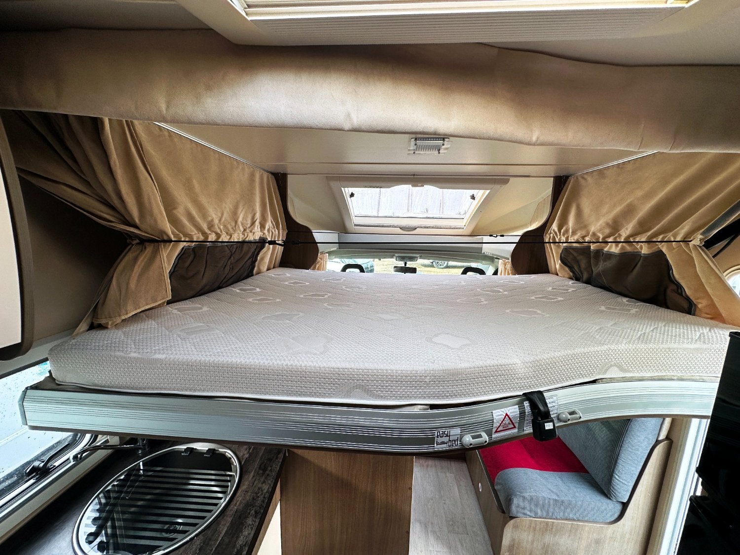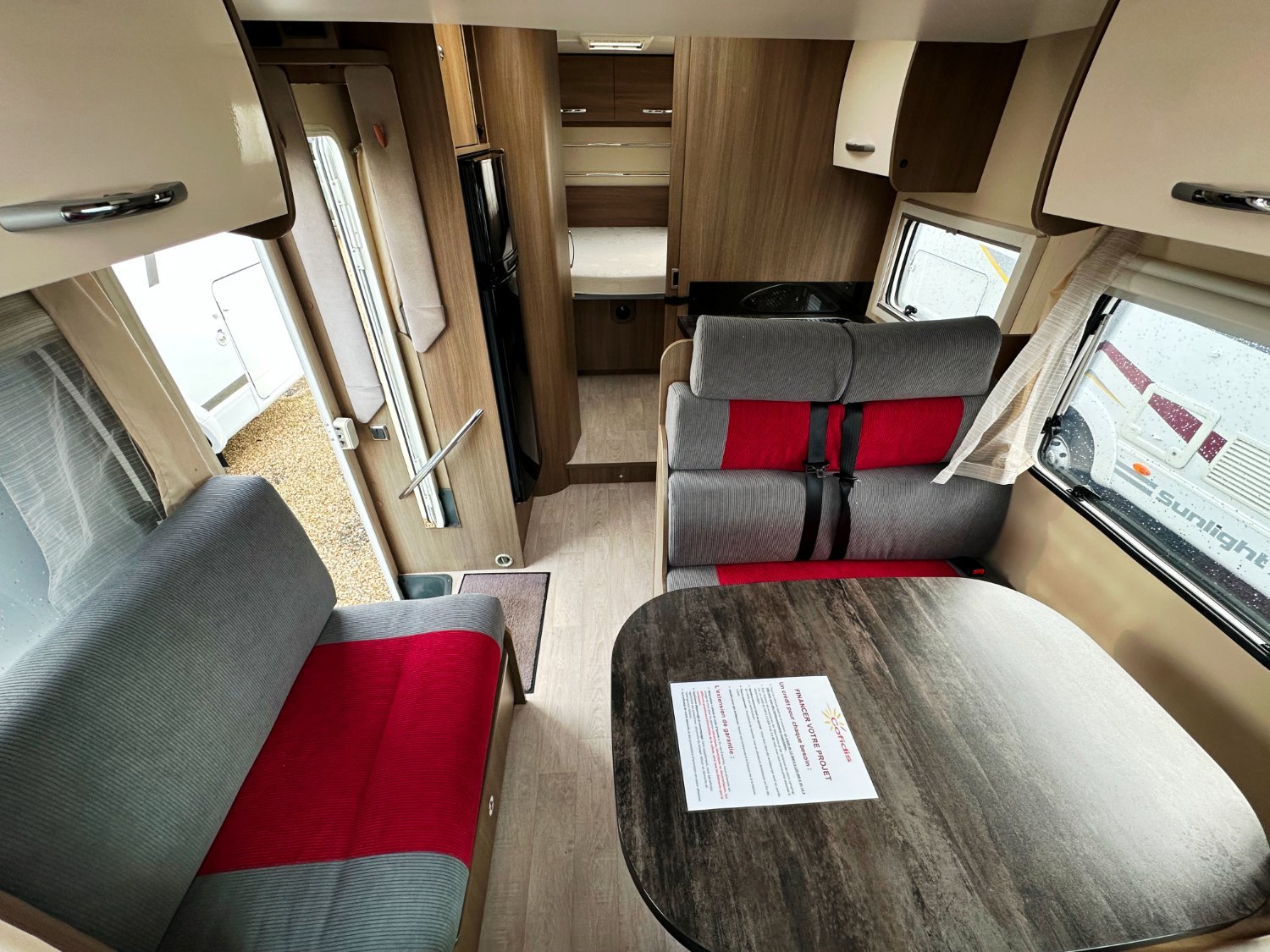 - Espace Nuit : Chambre arrière avec lit central réglable en hauteur, offrant une séparation pour plus d’intimité.