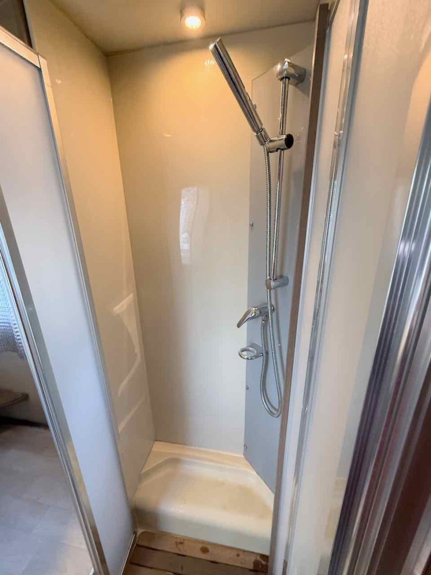 L’espace sanitaire, séparé de la pièce de vie par une cloison, comprend des toilettes indépendantes et une douche séparée.
