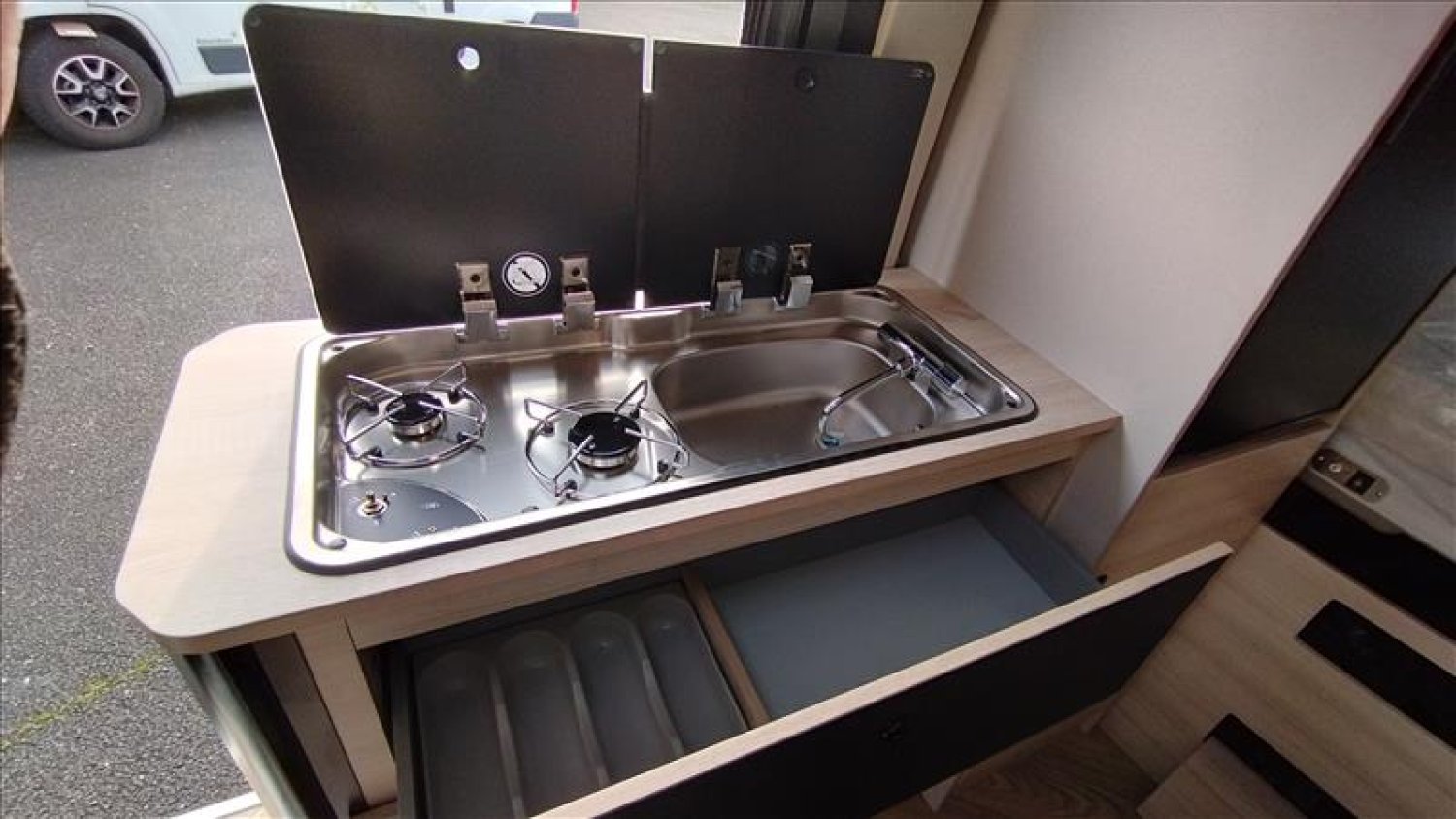 JANTES ALLIAGE 163" NOIRES, LANTERNEAU PANORAMIQUE, FEU ANTIBROUILLARD, EXTENTION TABLE DINETTE, SUPPORT TABLE EXTERIEURE, PACK ACCESSOIRES, RETROVISEURS ELECTRIQUES DEGIVRANTS, MARCHEPIED ELECTRIQUE, PACK LOOK, SALLE D'EAU AVEC FENETRE, CLIMATISATION MANUELLE DE CABINE, PENDERIE, PRE-EQUIPEMENT TV, PRECABLAGE CAMERA DE RECUL, CHAUFFAGE SUR CARBURANT UTILISABLE EN ROULANT, BAIES ARRIERES OUVRANTES, REGULATEUR / LIMITEUR DE VITESSE, ECO PACK FIAT, SIEGES DE CABINE PIVOTANTS, ESP, HILL DESCENT CONTROL, DOUBLE AIR BAG