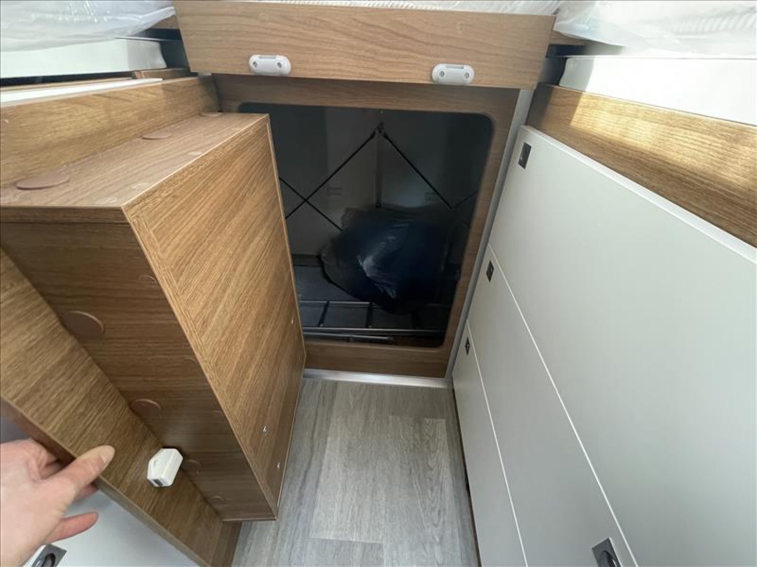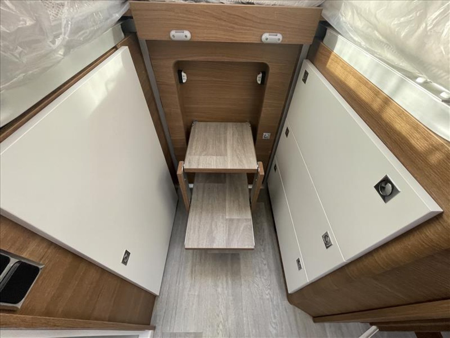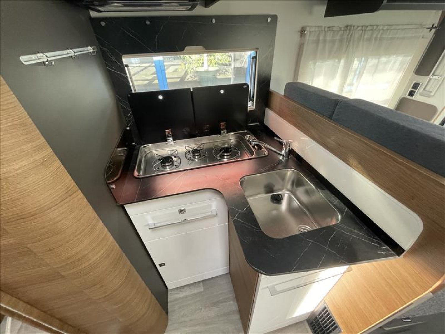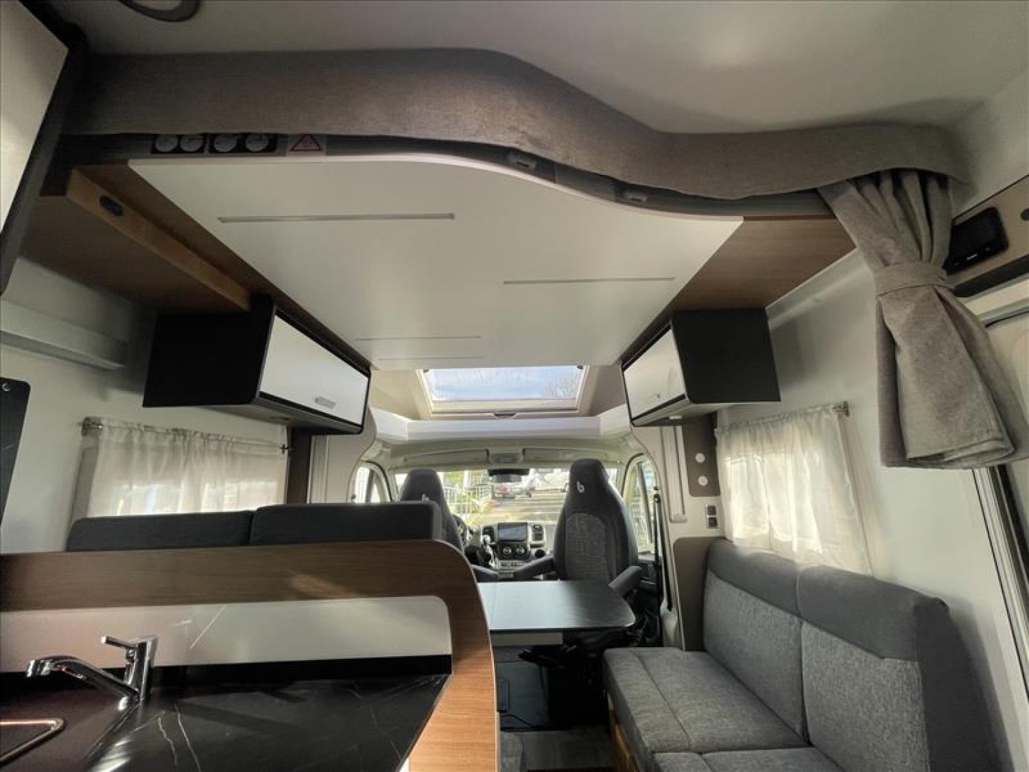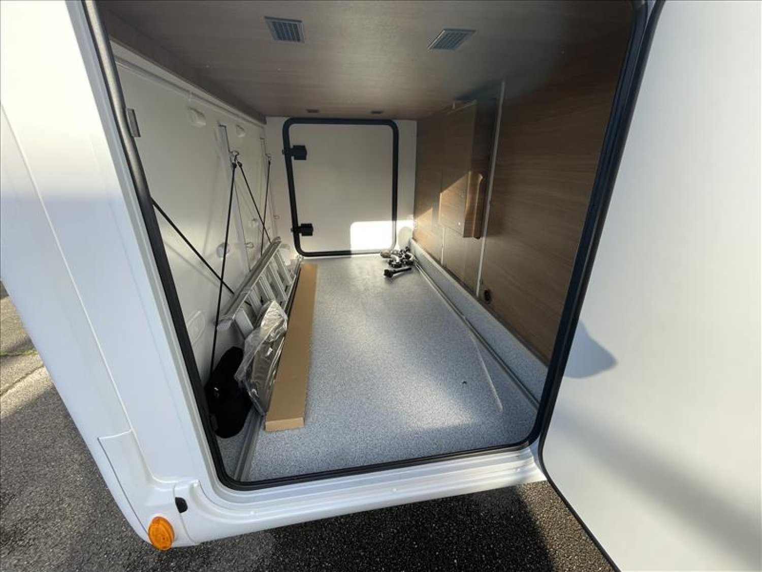 Toit ouvrant panoramique cabine (avec store et moustiquaire), PrIses 230 et 12 V dans le garage, Radars de recul, Carrosserie et dessous plancher polyester, Lit de pavillon électrique 2 places (max. 230 kg), Pare-chocs arrière avec feux LED, Casquette de profile 100% polyester renforcé, Prise USB dans la zone de couchage, Pré-installation 2ième batterie, Matelas de chambre à coucher haute densité, Hotte cuisine, Evier et réchaud 3 feux encastrés avec allumage électrique, Espace pour bouteilles de gaz : 2, Douche séparée avec porte-savon et porte serviette, Combine chauffage / chauffe-eau gaz - 4000 W