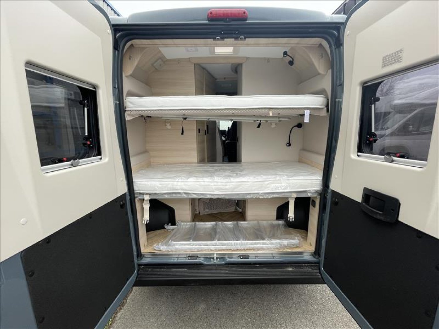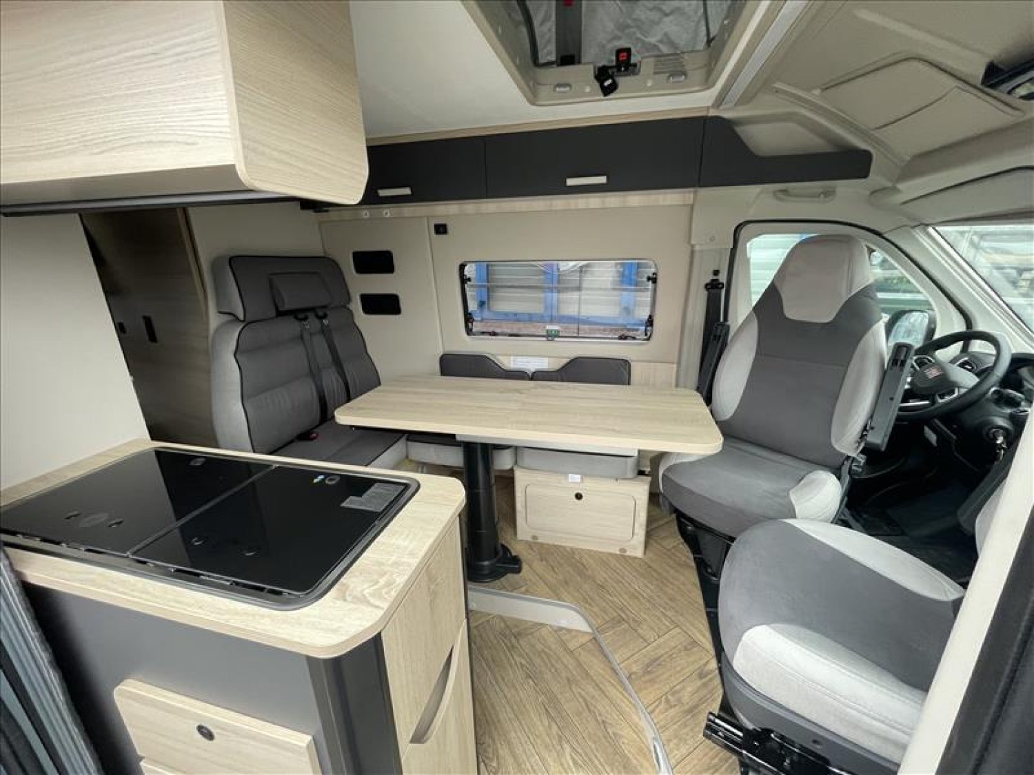Gris Lanzarote, Climatisation manuelle de cabine, Sièges de cabine pivotants réglables en hauteur avec double, Housses de siège cabine assorties à l’ambiance cellule, TOIT RELEVABLE POP UP, Rétroviseurs électriques dégivrants, Régulateur / limiteur de vitesse, Traction +, Hill Descent control, Eco pack FIAT : Stop&Start, alternateur intelligent, pompe à, Fenêtres double-vitrage avec combiné stores moustiquaire, Prises USB/USB-C, Pare-chocs avant peint, Jantes alliage 16’’ noires, Feux antibrouillard, Pré-équipement TV, Chauffage sur carburant utilisable en roulant, Baies arrières ouvrantes, Extension table dinette, Marchepied électrique, Isolation renforcée "VPS", Pack look :, - Volant en cuir, bouches d'aération chromées+ JA16 pouces, Chauffe eau GAZ