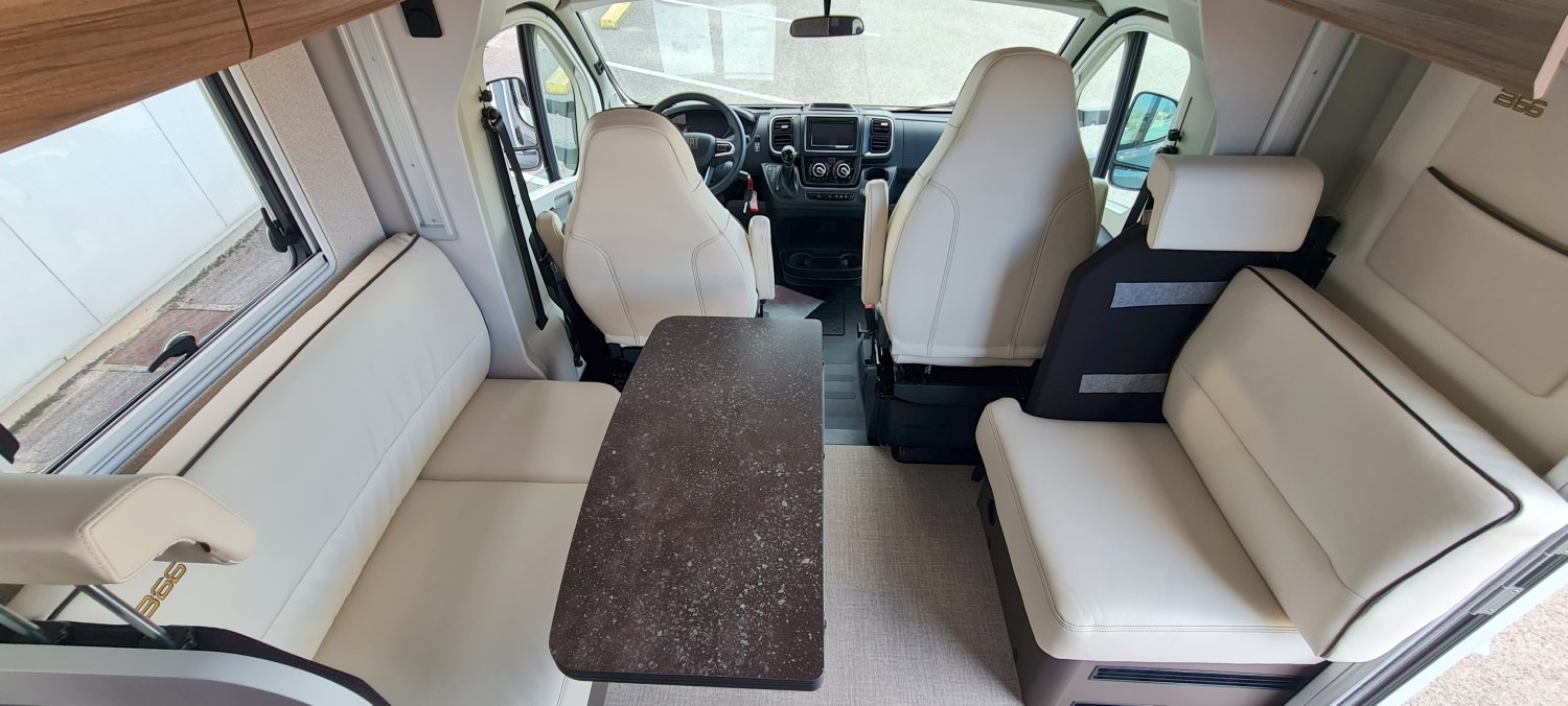 Boîte automatique 140 ch, Station multimédia avec caméra de recul, Batterie lithium, Banquette salon face-face avec table porte portefeuille, Porte d’entrée XL avec baie et moustiquaire, Double plancher technique Thermo-Floor isolé et chauffé, Réfrigérateur à compression 131,5 l, Lit central réglable en hauteur