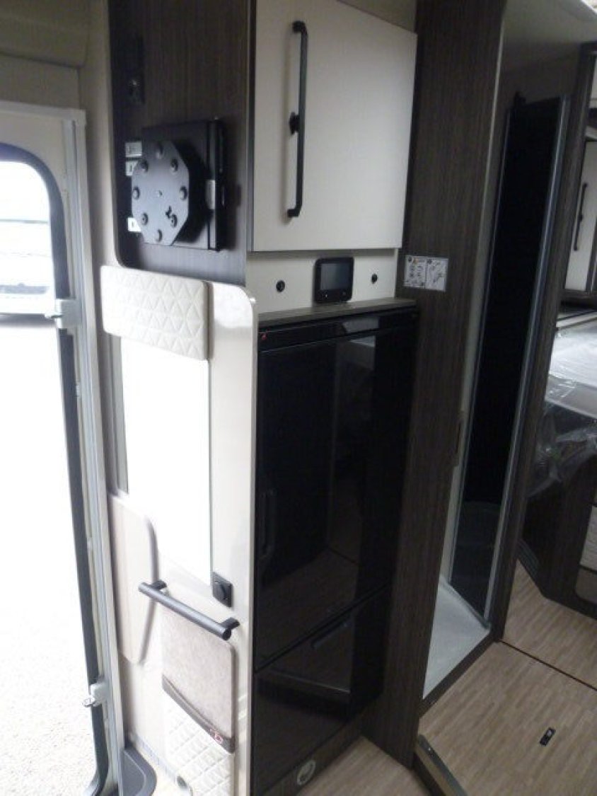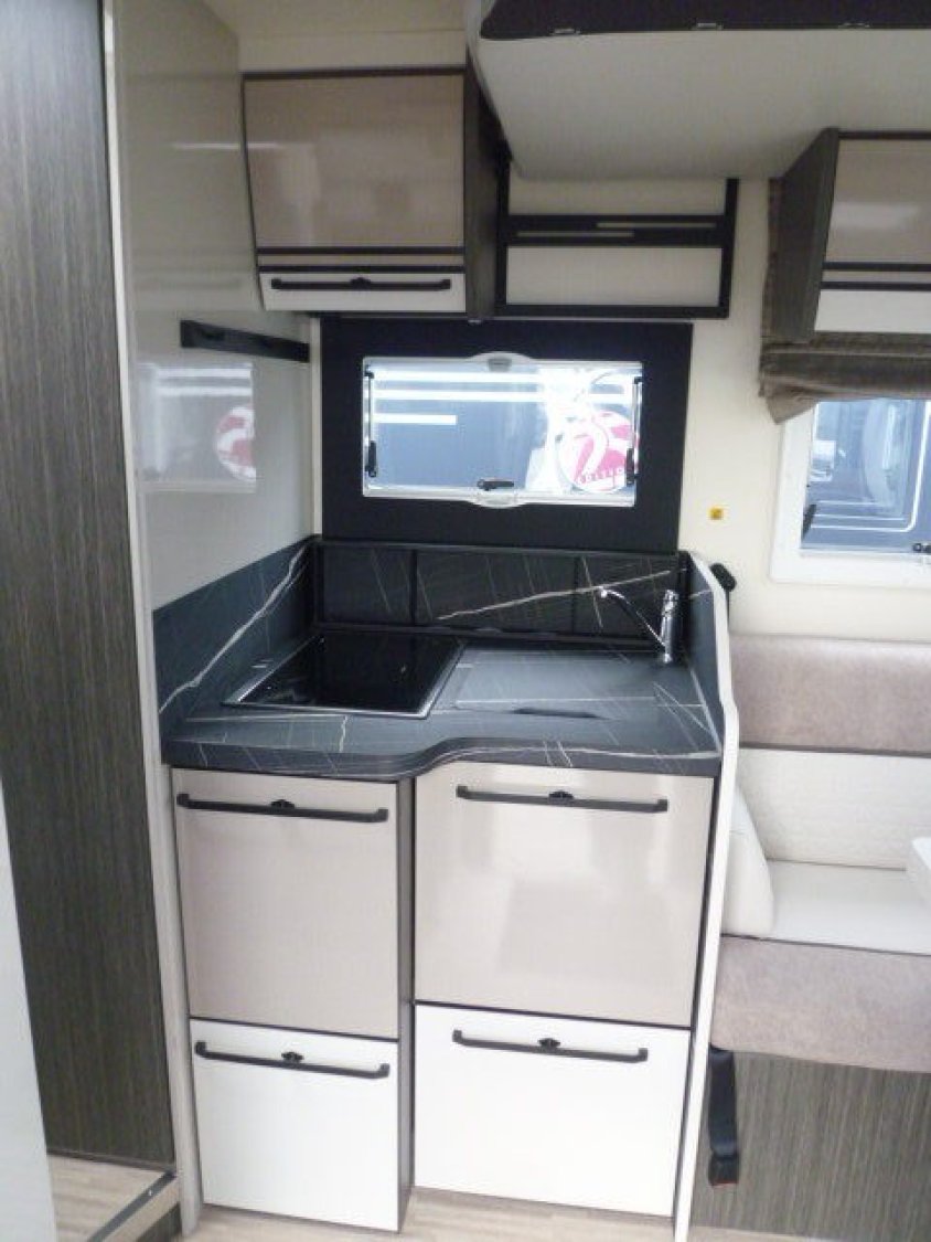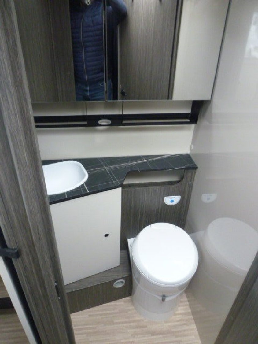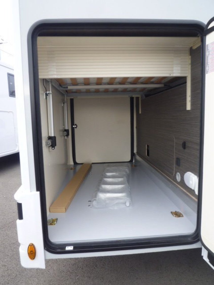 Cuisine en L, Douche indépendante, Lit central, lit pavillon, Salon avant banquettes face à face, Salon avant sièges pivotants, Soute réglable en hauteur, WC Cassette.