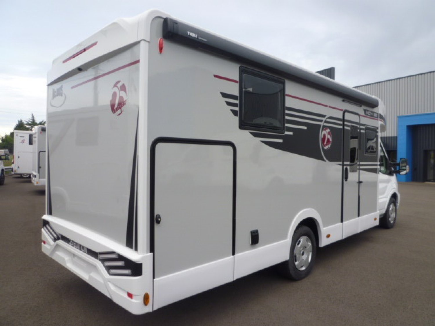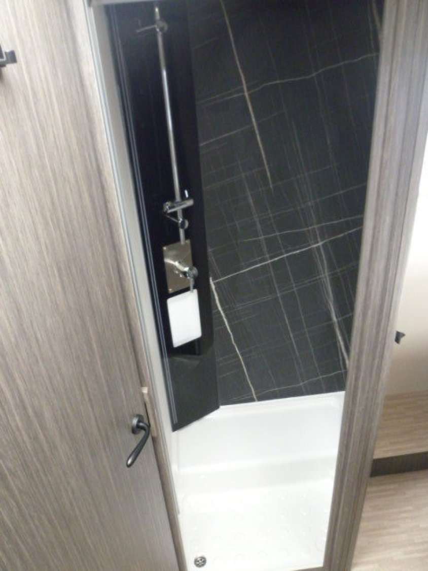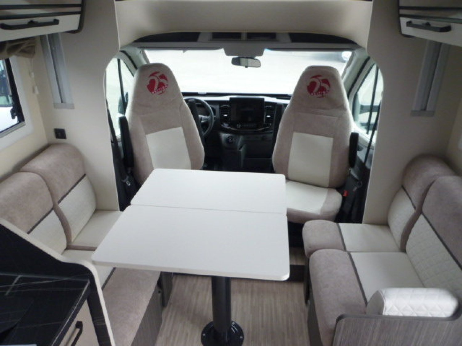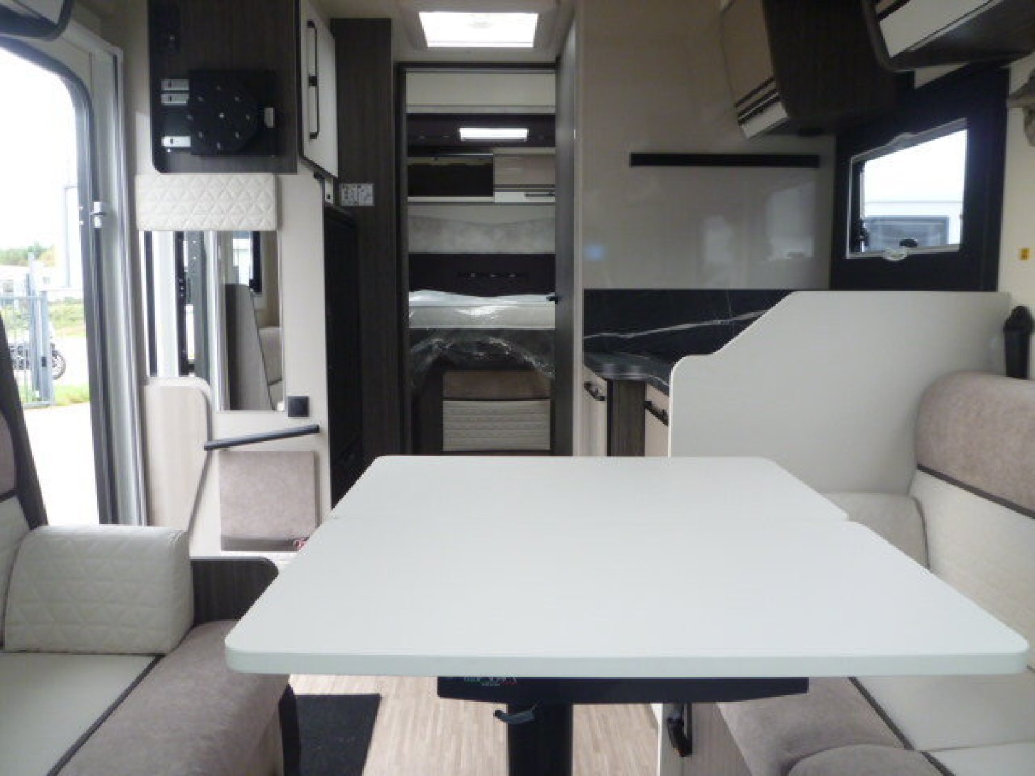 Cuisine en L, Douche indépendante, Lit central, lit pavillon, Salon avant banquettes face à face, Salon avant sièges pivotants, Soute réglable en hauteur, WC Cassette.