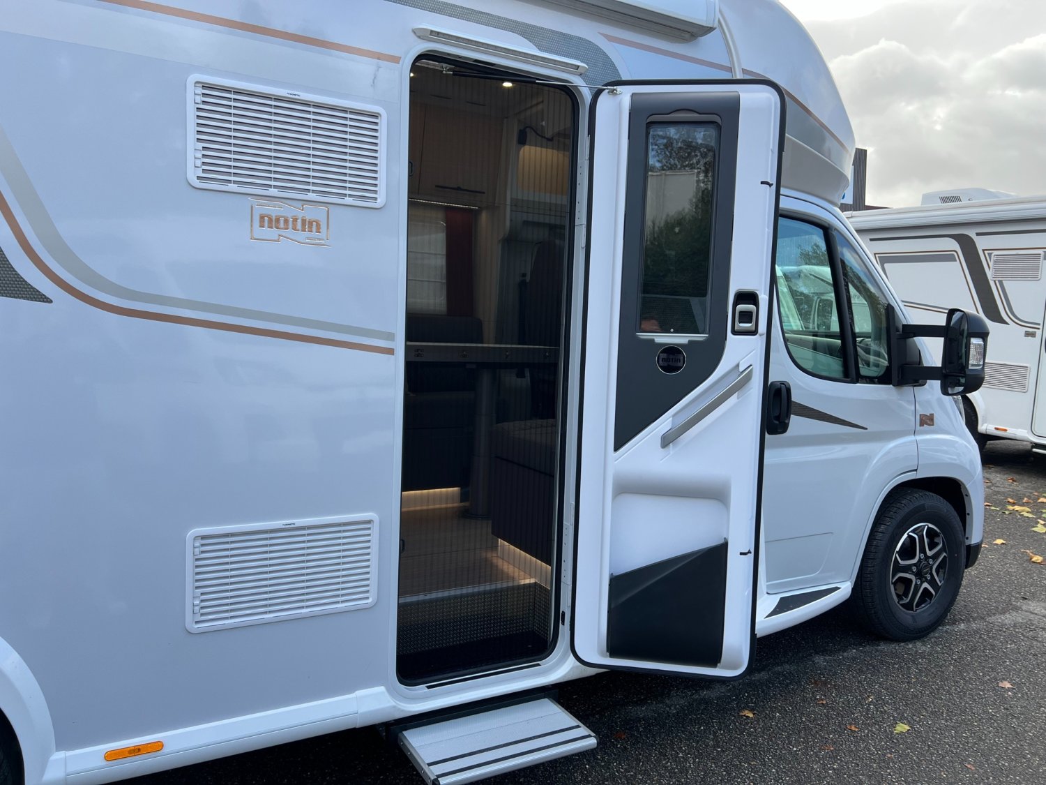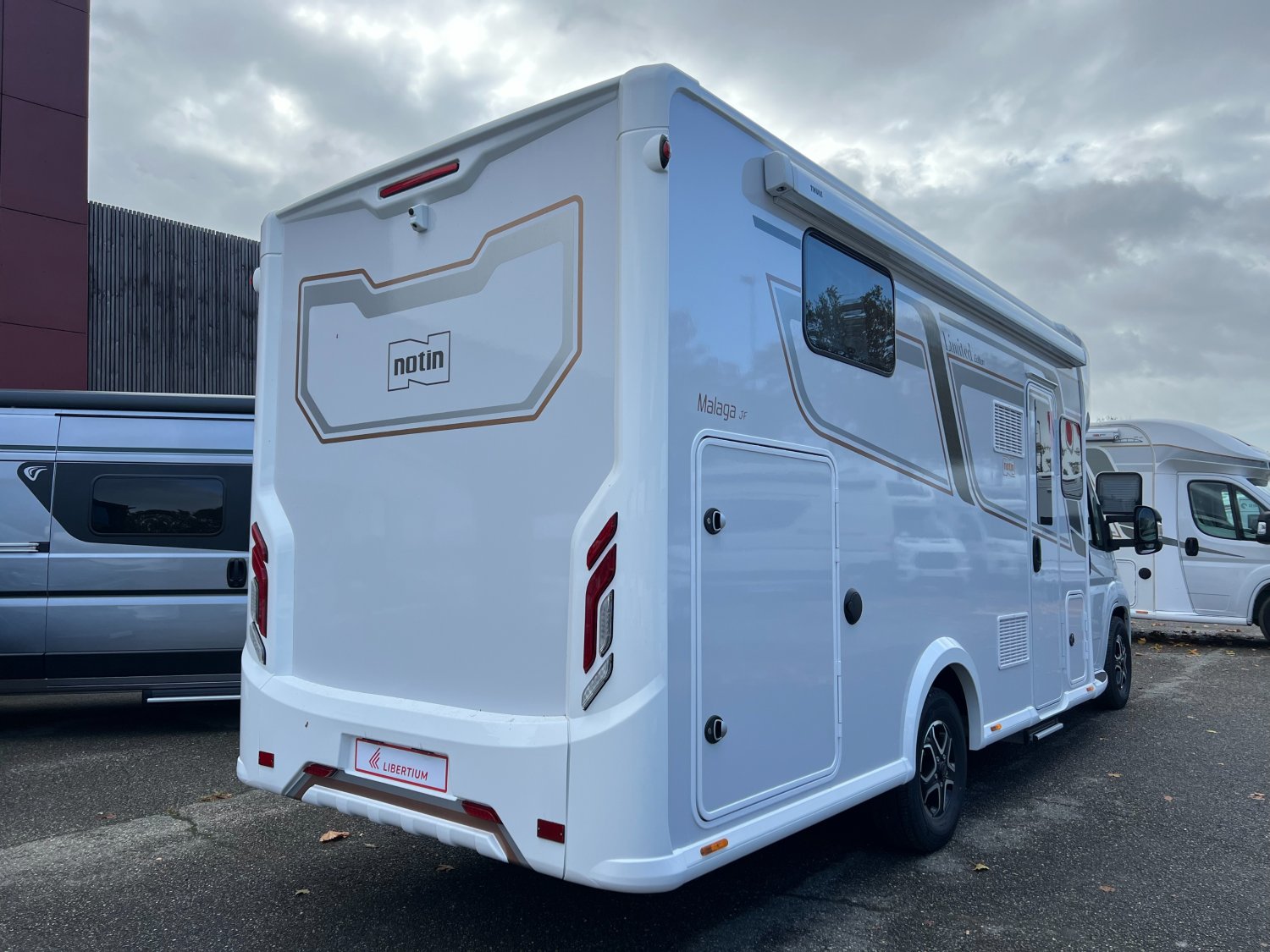 Le Notin Malaga JF 2026 série 105 ans est un profilé haut de gamme de 7,19 m offrant deux lits jumeaux arrière transformable en lit king size et un salon spacieux en face à face.