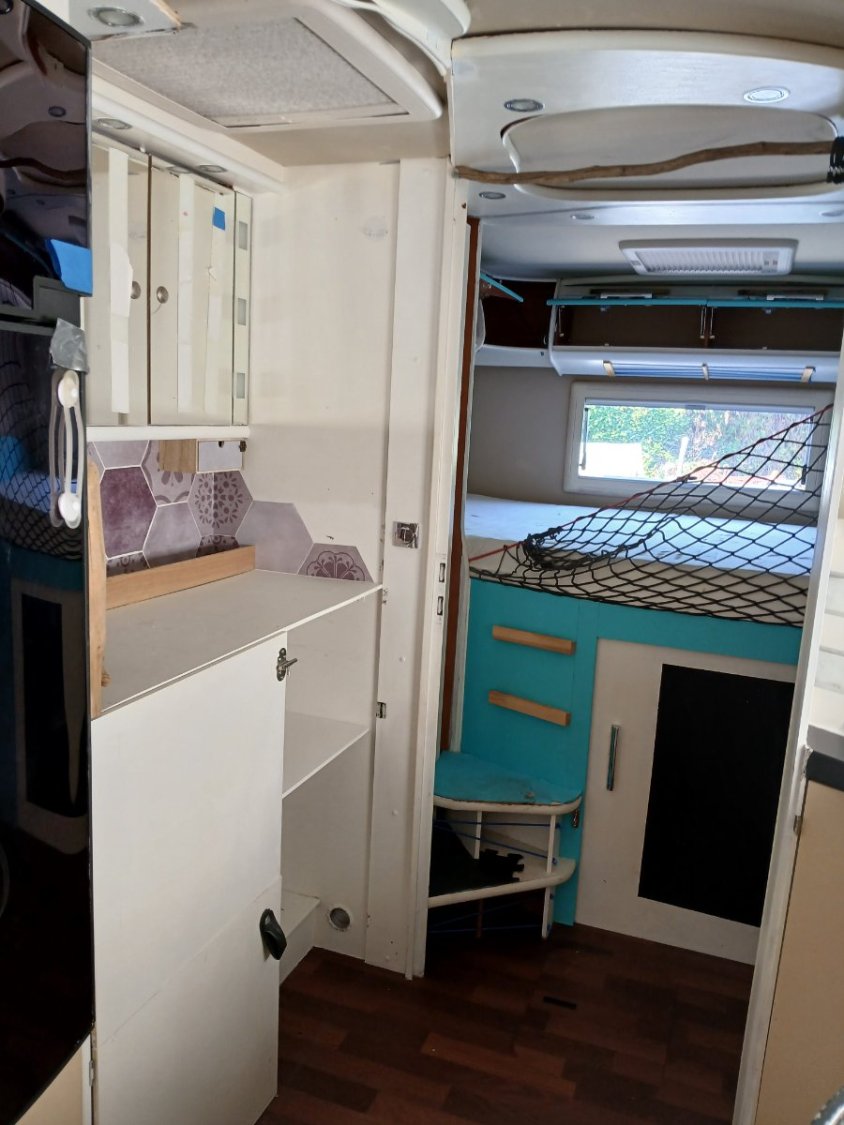 Des travaux modificatifs intérieurs ont été réalisé : retrait de la cloison du « cabinet de toilette », mise en place d'un toilette chimique neuf (encore dans l'emballage), retrait de la table pour gagner en espace de vie. Peinture refaite en blanc de l’ensemble des boiseries > rafraichissement à prévoir.