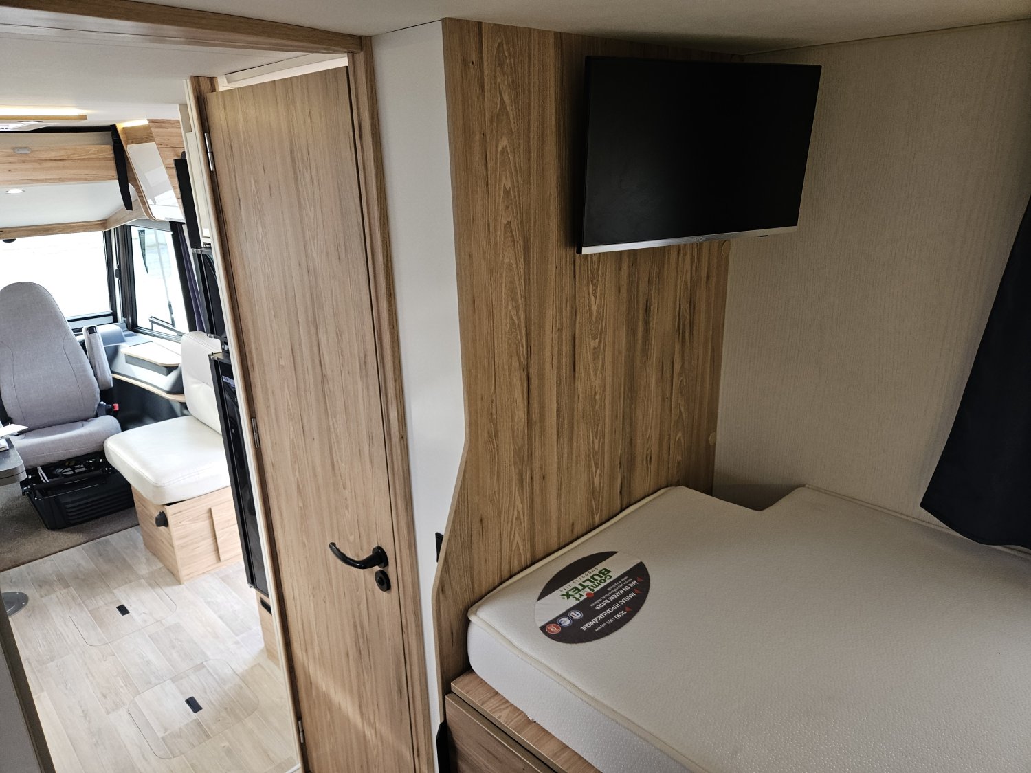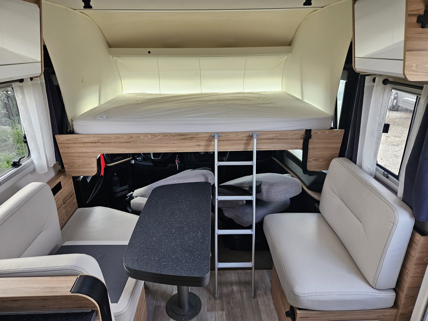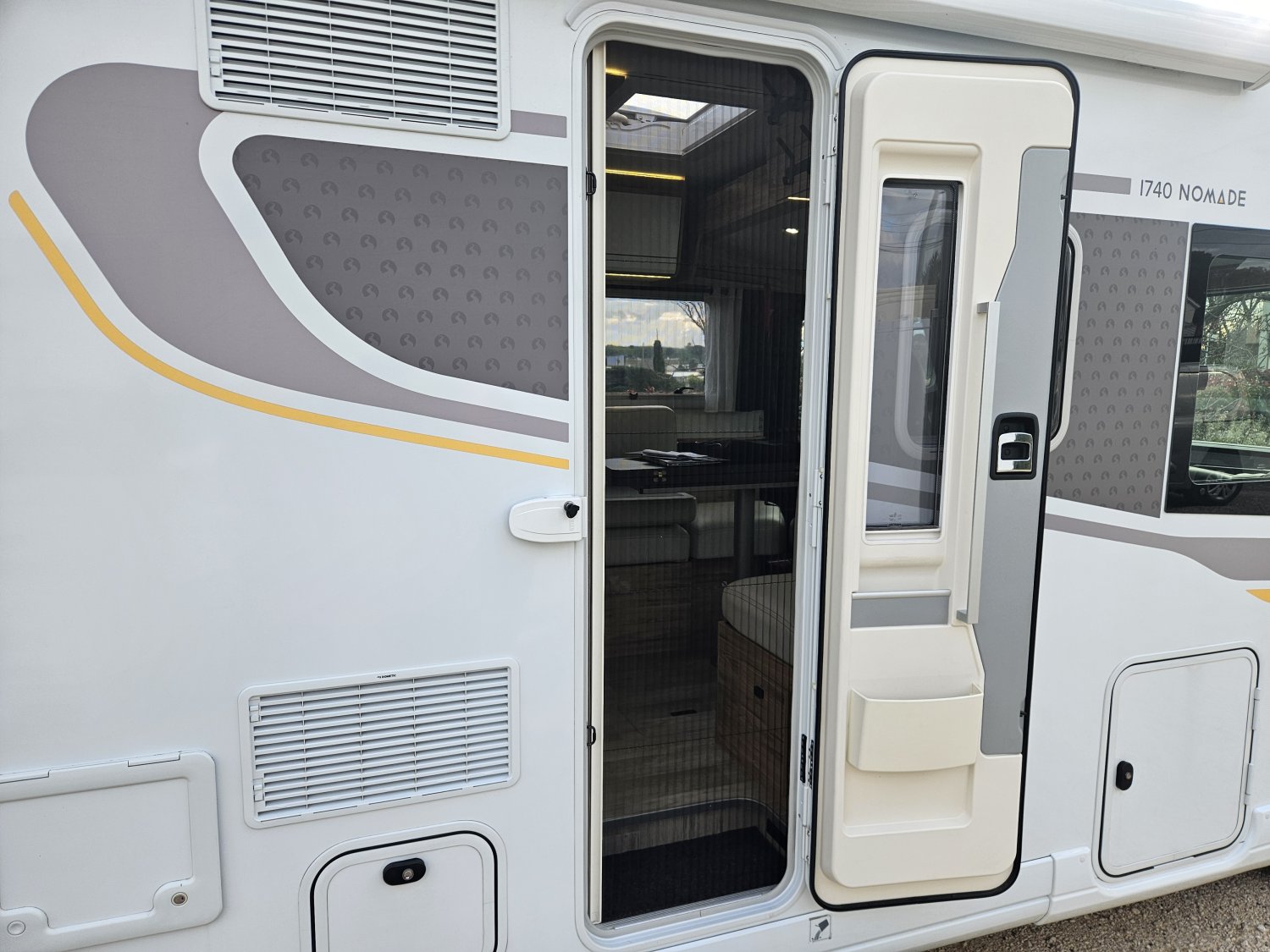 Un marchepied électrique, un store extérieur de 4,5 Mètres, une moustiquaire de porte cellule. Avec des store plissés de cabine et une moquette cabine.