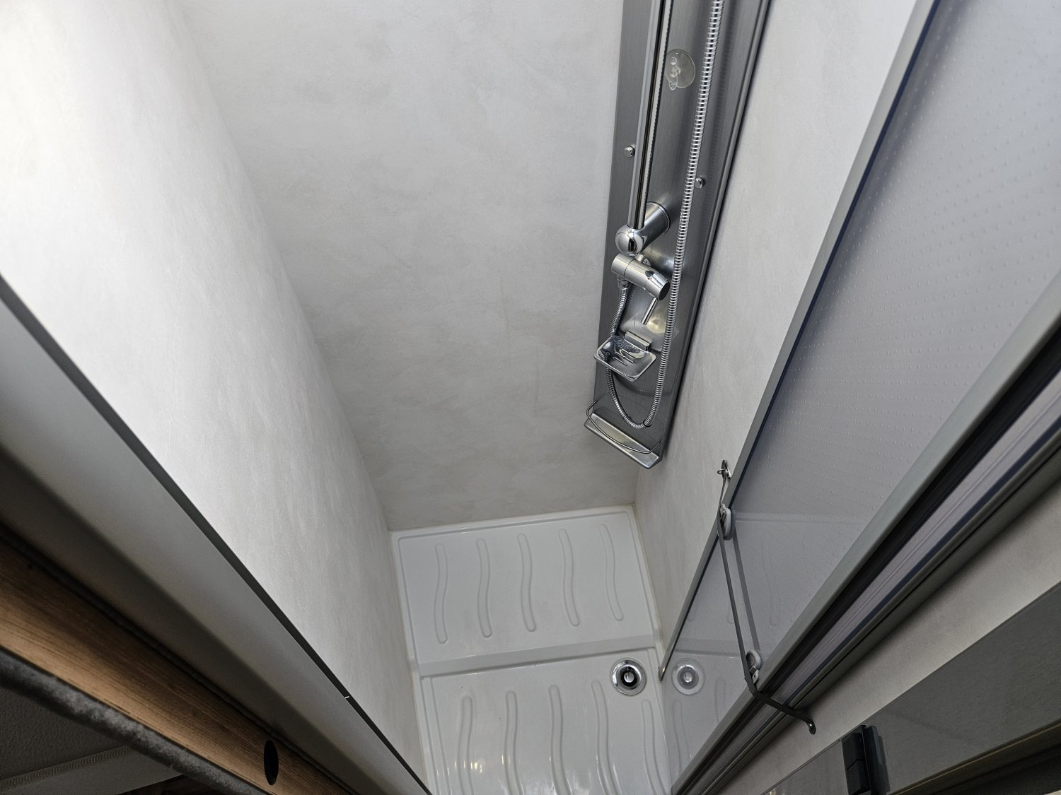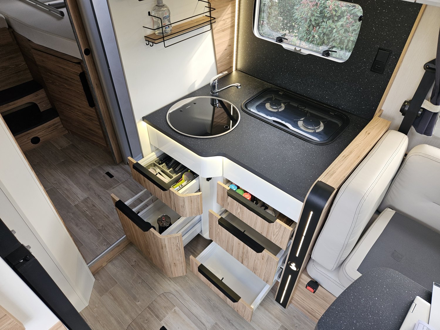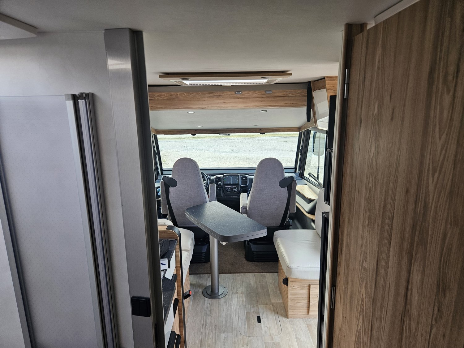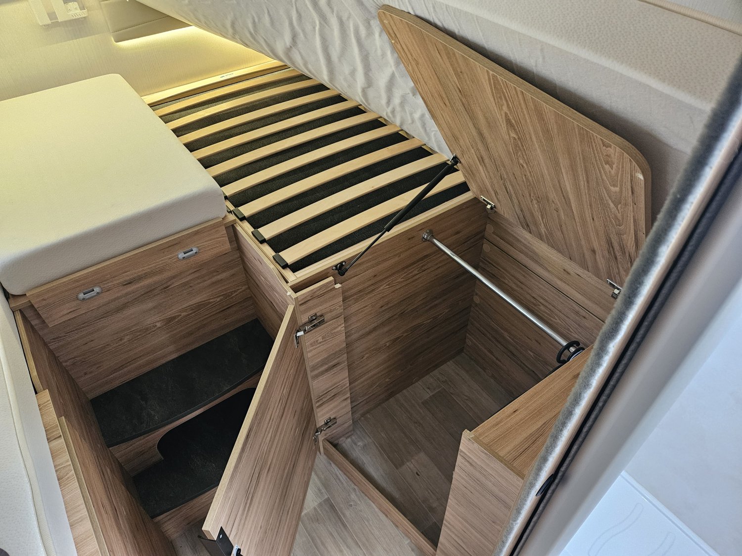 Un marchepied électrique, un store extérieur de 4,5 Mètres, une moustiquaire de porte cellule. Avec des store plissés de cabine et une moquette cabine.