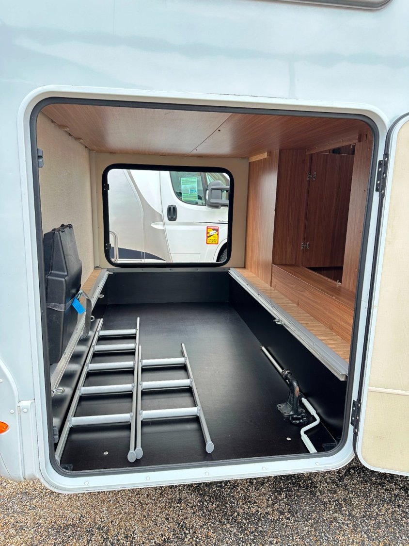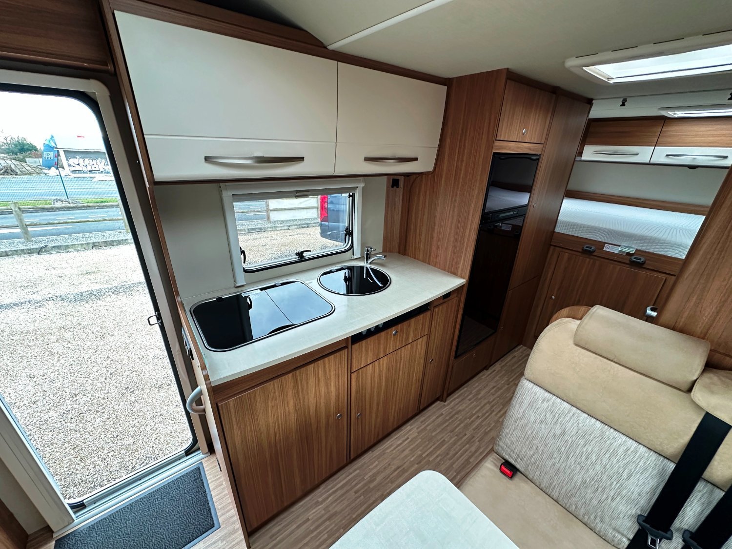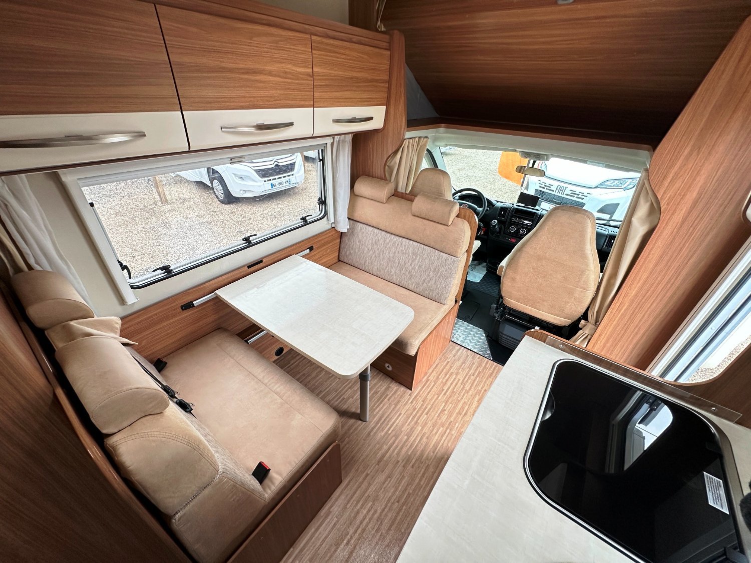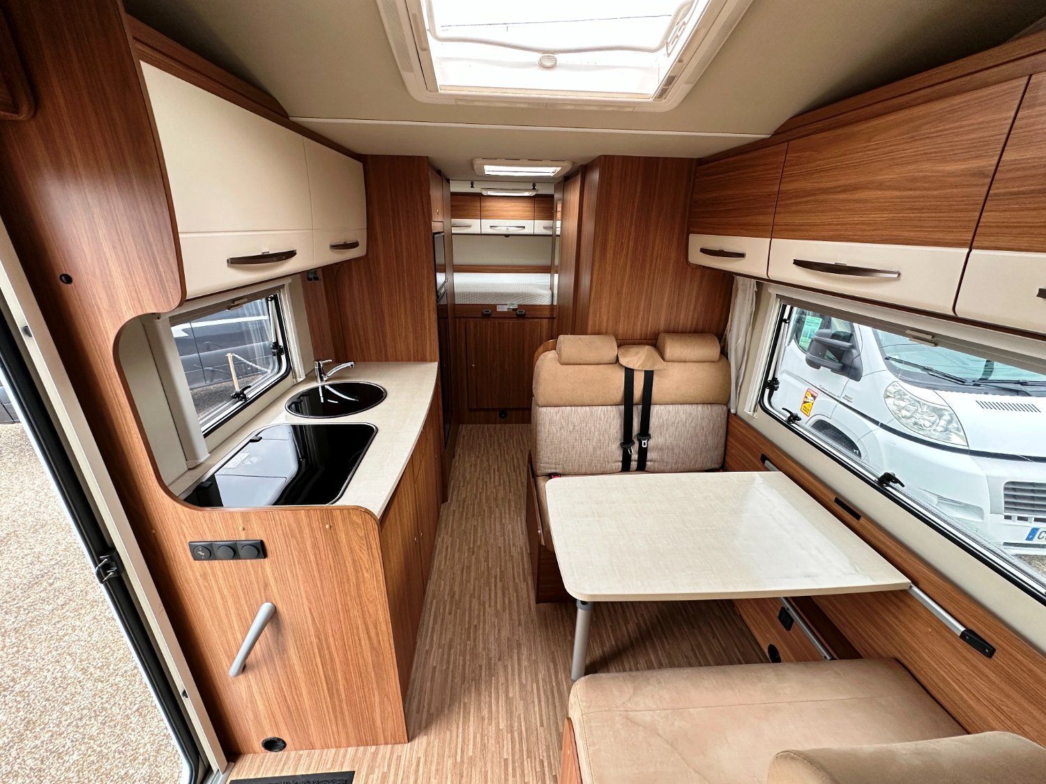 Capucine Carado, 4 couchages, lit sur immense soute garage (plusieurs vélos adultes), salle de bain avec douche indépendante, cuisine spacieuse et toute équipée, salon avant avec banquette face/face convertible en un couchage double, immense capucine en cabine avec lit en 160 cm.