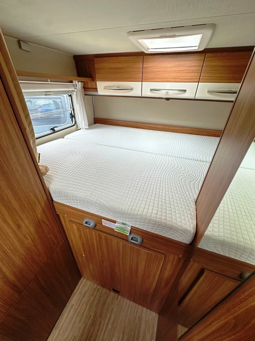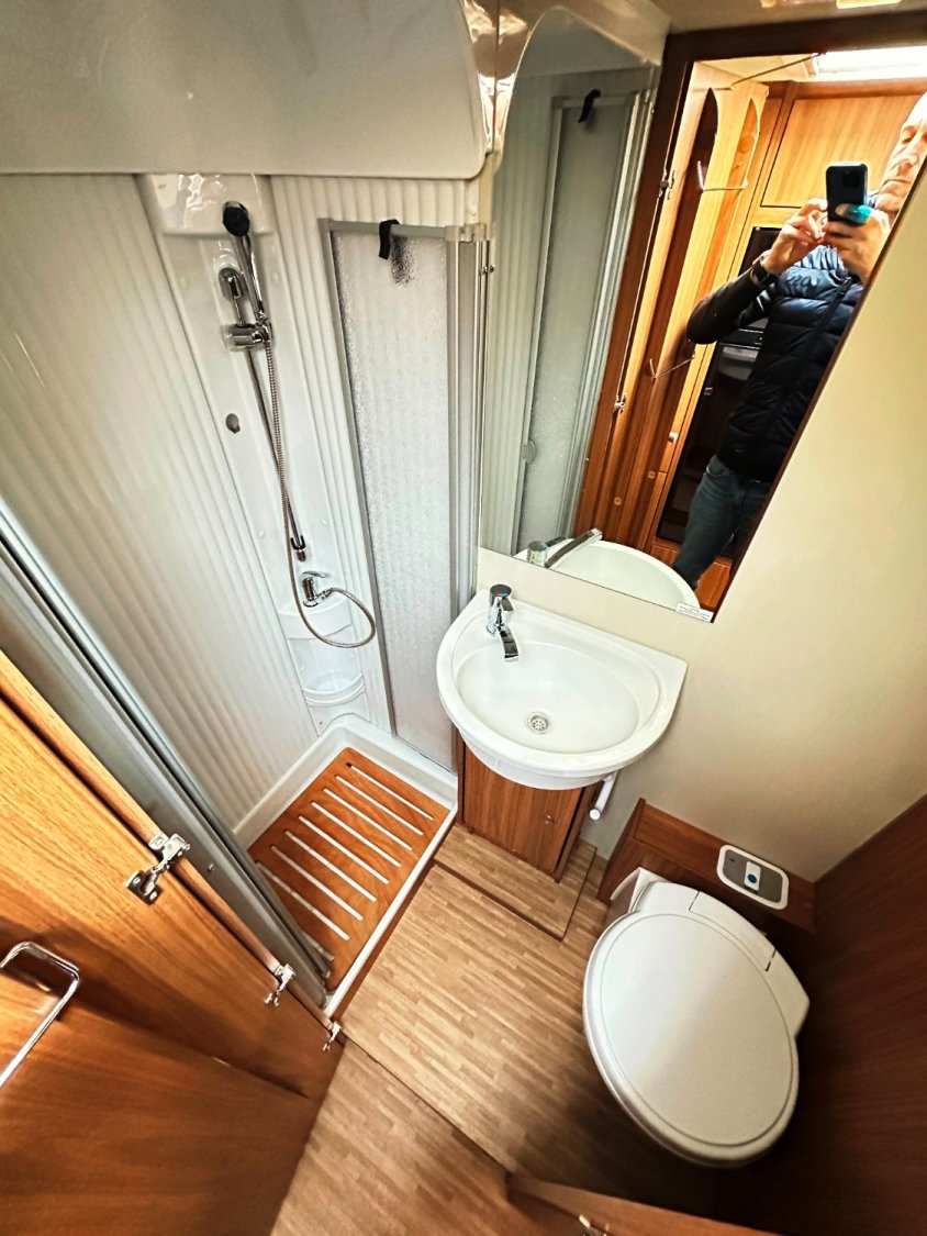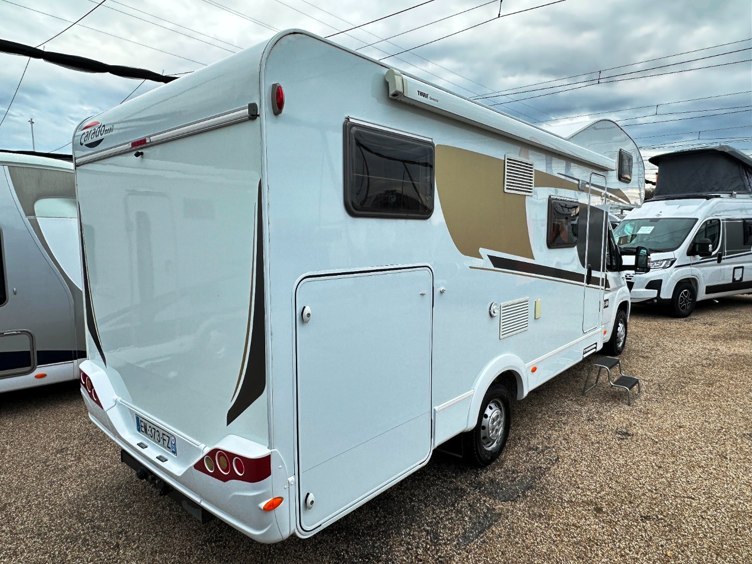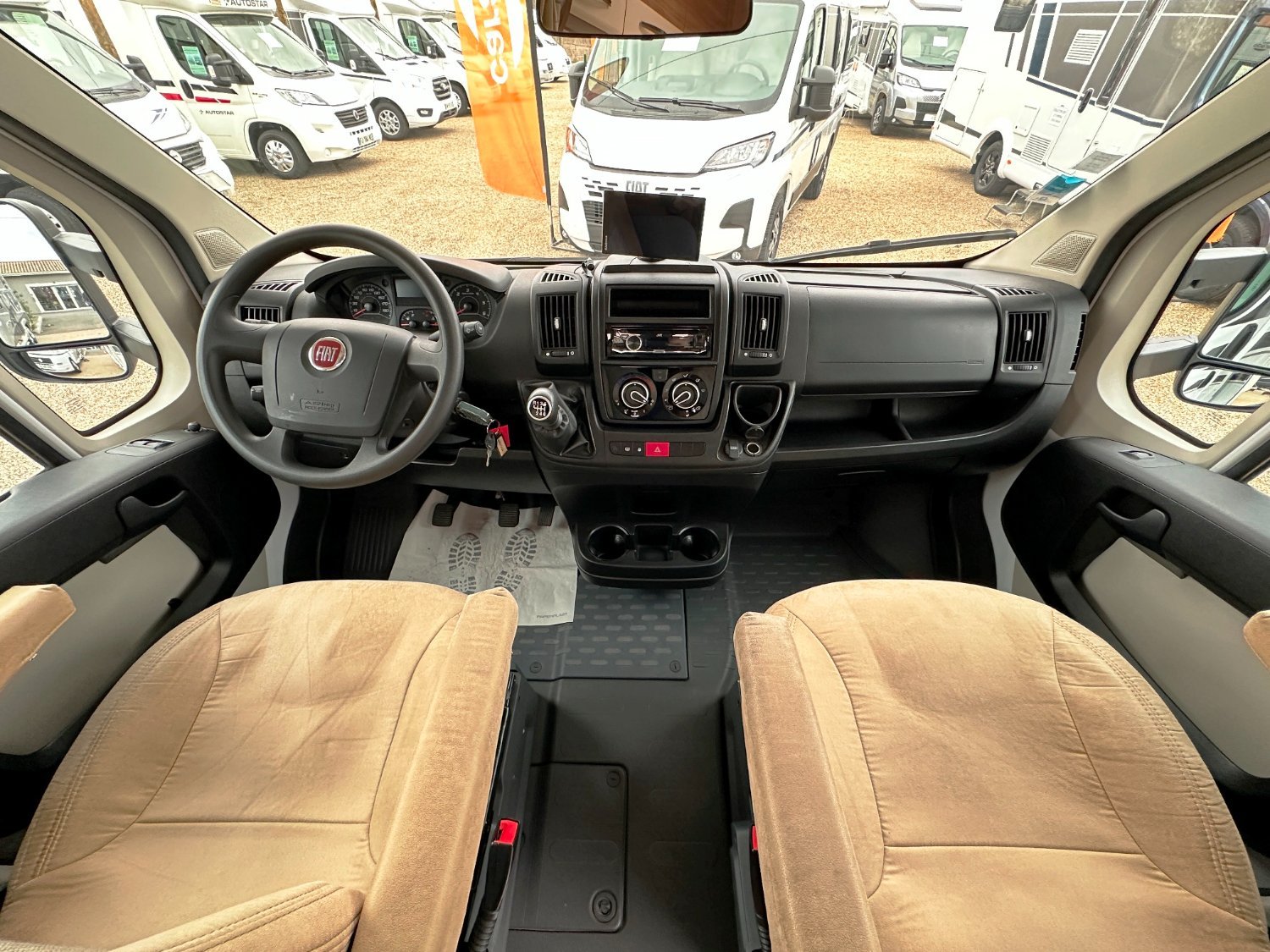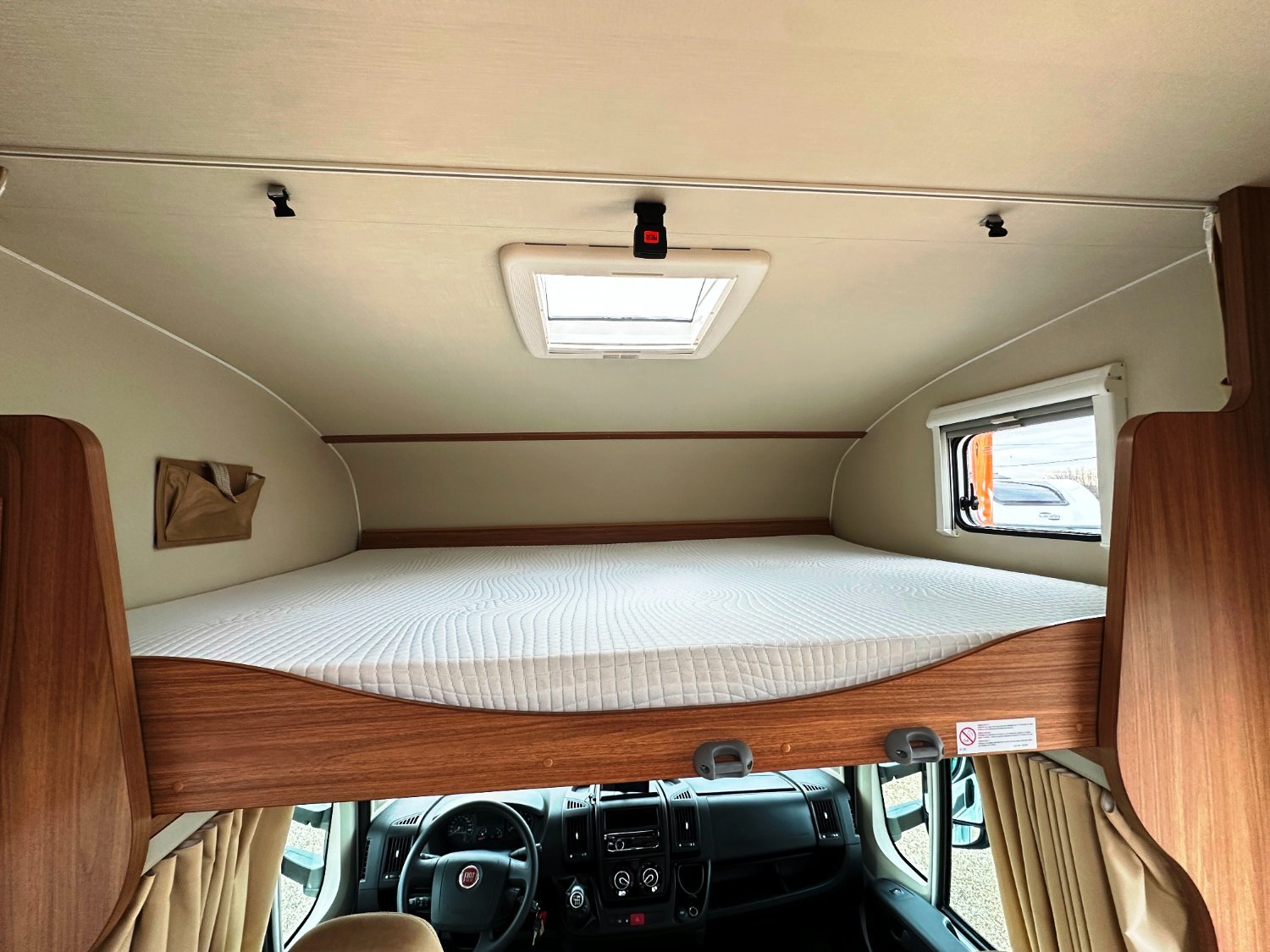 Capucine Carado, 4 couchages, lit sur immense soute garage (plusieurs vélos adultes), salle de bain avec douche indépendante, cuisine spacieuse et toute équipée, salon avant avec banquette face/face convertible en un couchage double, immense capucine en cabine avec lit en 160 cm.