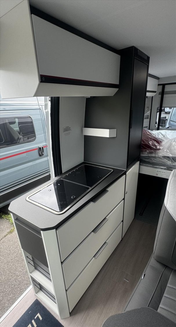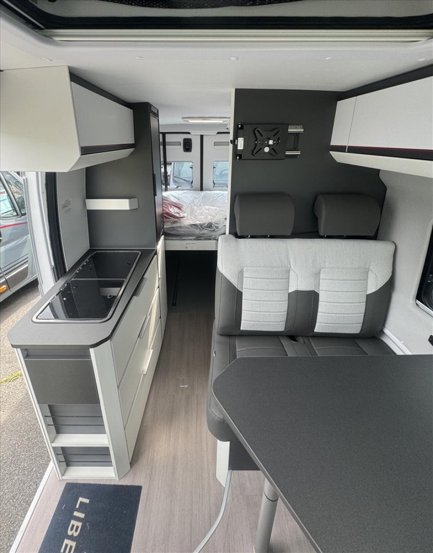 Grâce à son lit arrière électrique escamotable, vous bénéficiez d’un vaste volume de soute en journée, parfait pour ranger vélos, matériel de camping ou équipements sportifs. Le grand coin salon avec sièges pivotants offre un espace convivial pour se détendre, travailler ou partager un repas à l’étape.