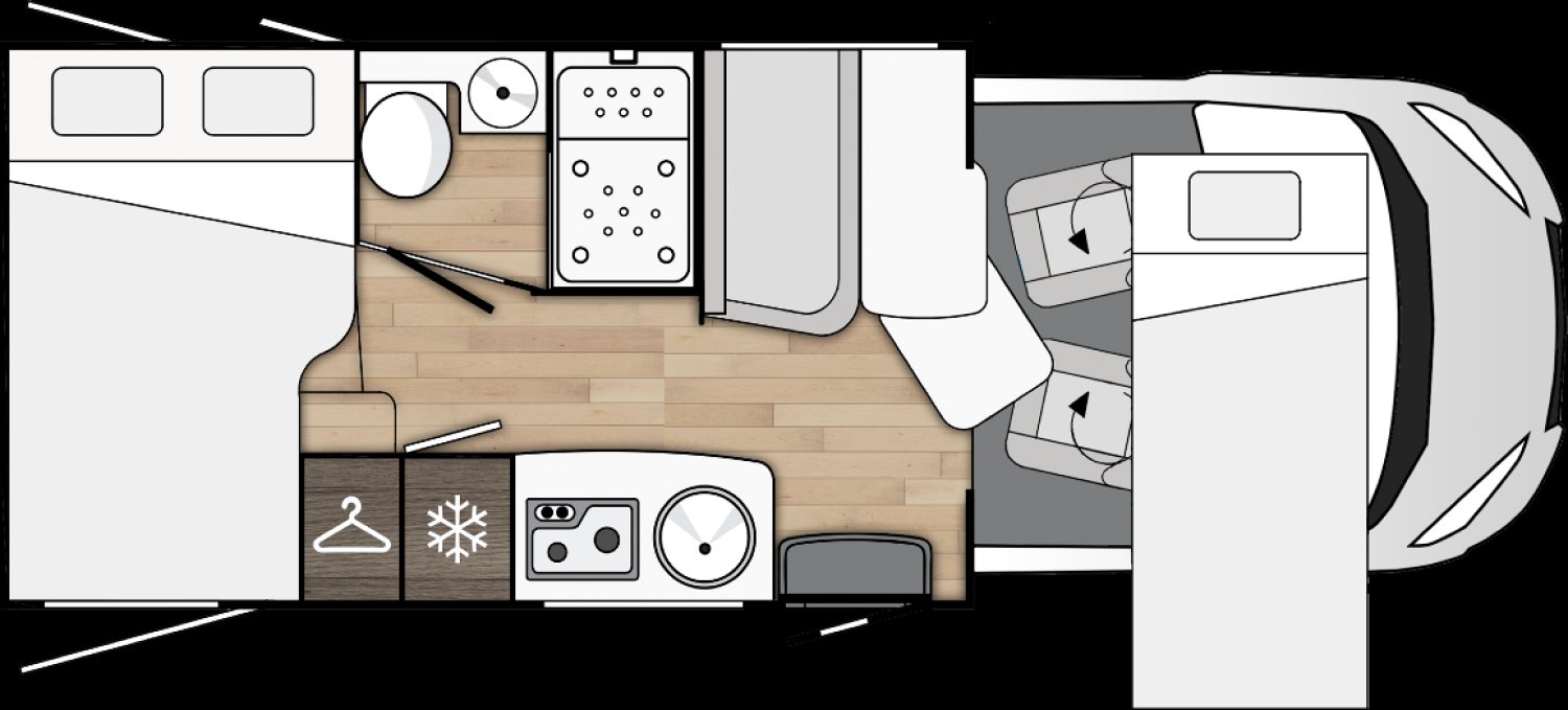 Reconnaissance des panneaux de limitation de vitesse, Lit de pavillon électrique 1 place, Moteur FORD Euro 6 - 2,0 l 165 CV, Roues 16", Phares antibrouillard avant, Alerte de circulation à contresens, Toit ouvrant panoramique cabine (avec store et moustiquaire, Réfrigérateur à compression de 150 litres, Radars de recul et caméra recul, Lumière extérieure LED, Panneau solaire 200 W avec régulateur MPPT, Store exterieur, TV 20 pouces avec antenne omnidirectionnelle, Phares automatiques et détecteur de pluie, Rétroviseurs électriques et dégivrants, Assistance au démarrage en côte (HSA), Frein électrique, Régulateur de vitesse avec limiteur, Adaptation intelligente de la vitesse, Assistance au centrage sur la voie, Alerte anticollision et aide au stationnement avant, Contrôle de la pression des pneus, Climatisation cabine automatique, Radio DAB avec écran tactile 12" + Caméra recul, Rideaux occultation vitres cabine, Carrosserie et dessous plancher polyester, Flancs et plafond imputrescibles (sans bois), Casquette de profile 100% polyester renforcé, Fenêtres double vitrage Dometic D-Lux Extra plates, Porte cellule avec fenêtre, store et poubelle, Prises 230 et 12 V dans le garage, Radars de recul