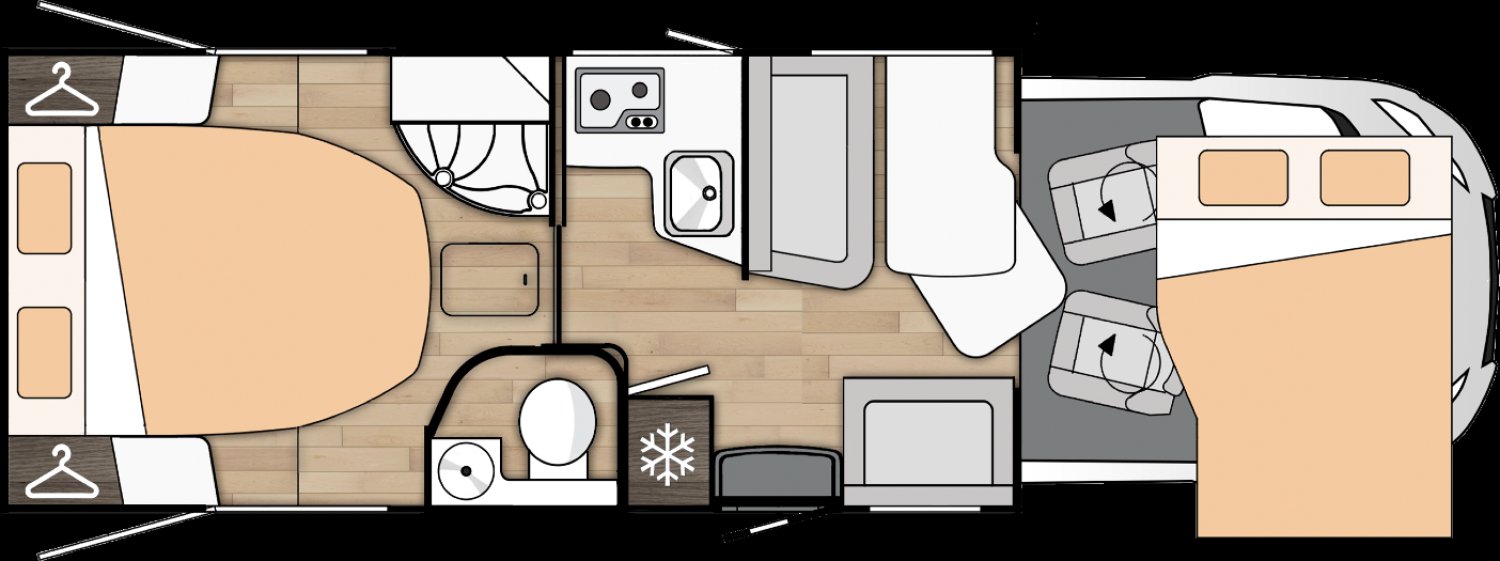 Assistance au centrage sur la voie, Flancs et plafond imputrescibles (sans bois), Roues 16", Alerte anticollision et aide au stationnement avant, Climatisation cabine automatique, Casquette de profile 100% polyester renforcé, Fenêtres double vitrage Dometic D-Lux Extra plates, Radio DAB avec écran tactile 12" + Caméra recul, Assistance au démarrage en côte (HSA), Frein électrique, Carrosserie et dessous plancher polyester, Phares antibrouillard avant, Phares automatiques et détecteur de pluie, Rétroviseurs électriques et dégivrants, Porte cellule XL, Prises 230 et 12 V dans le garage, Régulateur de vitesse avec limiteur, Adaptation intelligente de la vitesse, Reconnaissance des panneaux de limitation de vitesse, Alerte de circulation à contresens, Commandes au volant de la radio, Lit de pavillon électrique 2 places, Porte de séparation chambre / salon, Chargeur de batterie 22A avec option lithium, Grand réfrigérateur / congélateur à compression 150, Espace pour bouteilles de gaz :1, Chaudière utilisant carburant véhicule Webasto - 4000 W, Chauffe-eau gaz