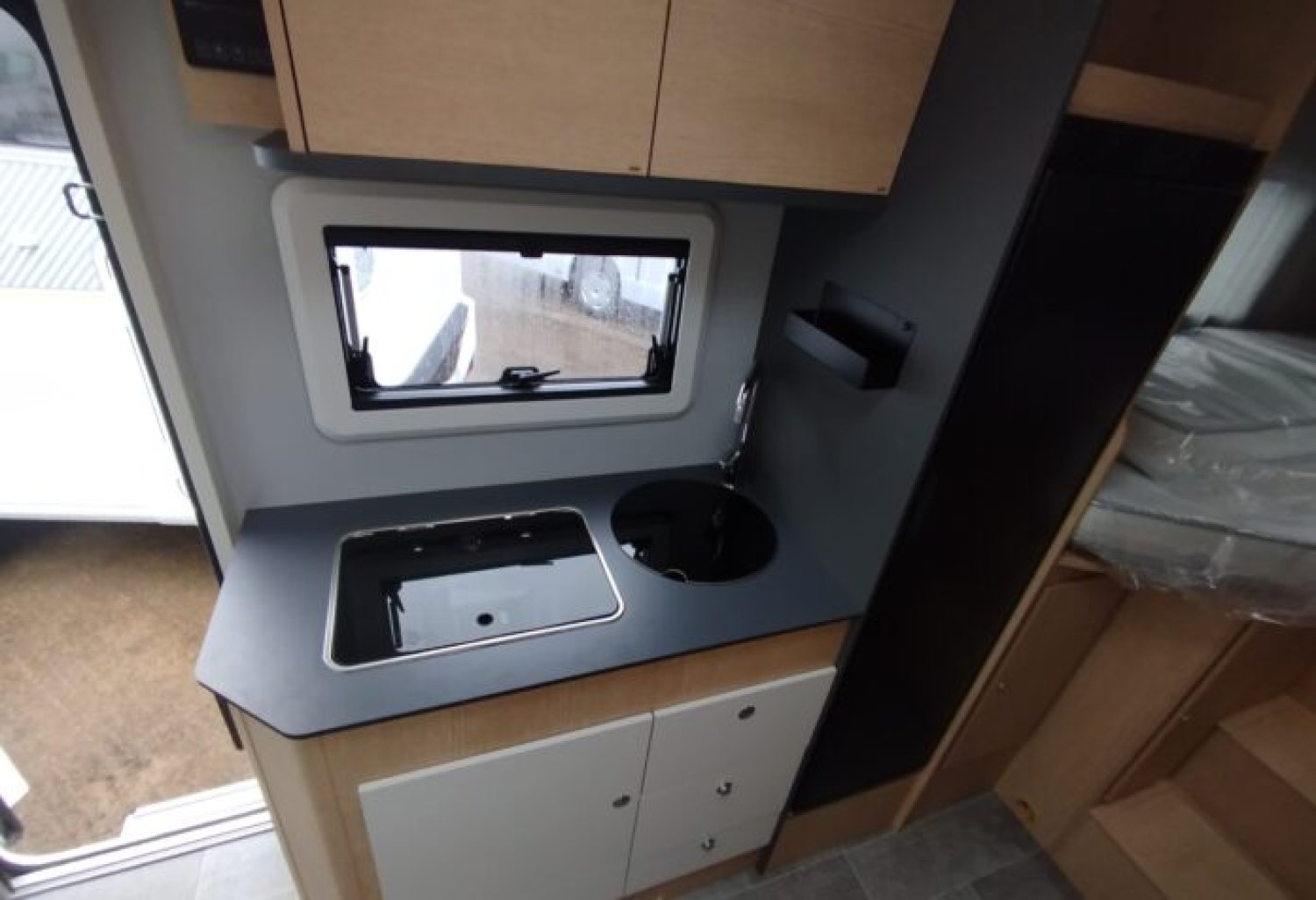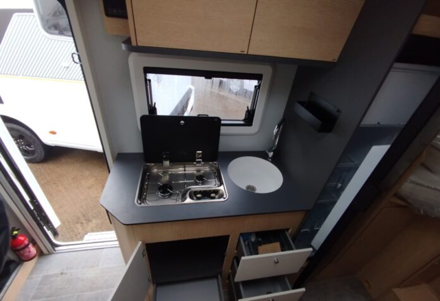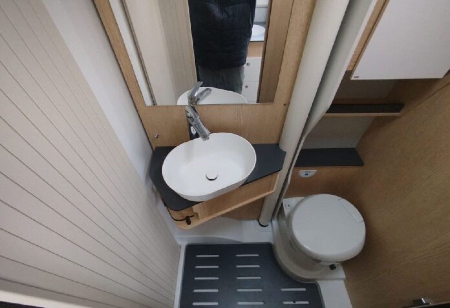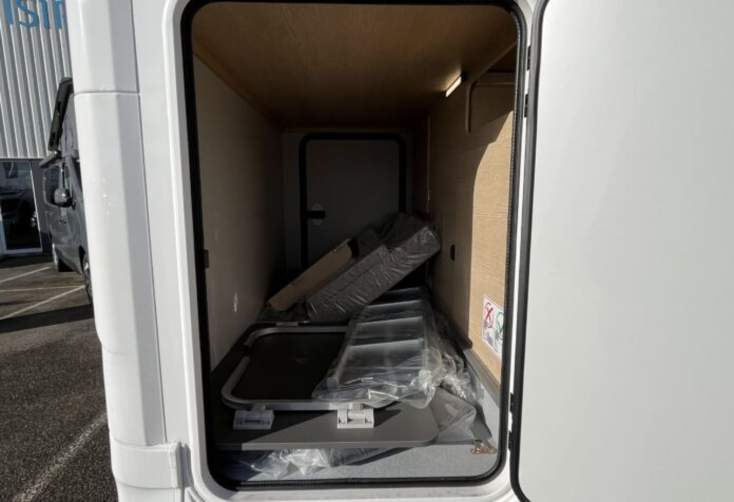 Le GIOTTILINE CX 66 PREMIERE EDITION est un profilé compact de 6,60 m de long sur porteur Peugeot Boxer 2,2 L 140 ch avec boîte automatique. Il offre 4 places carte grise et 4 couchages grâce aux lits jumeaux à l'arrière, le lit de pavillon ainsi que le couchage dinette convertible.