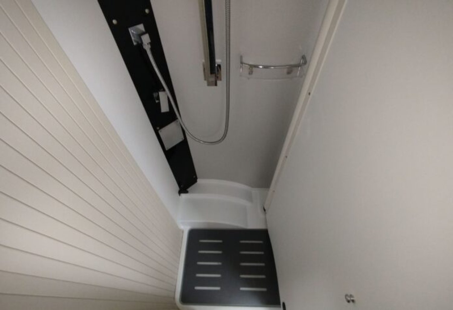 Salle de bain “VARIO” avec douche séparée Penderie SLIM à deux portes Échelle rétractable intégrée dans la porte interne de soute en pied de lit