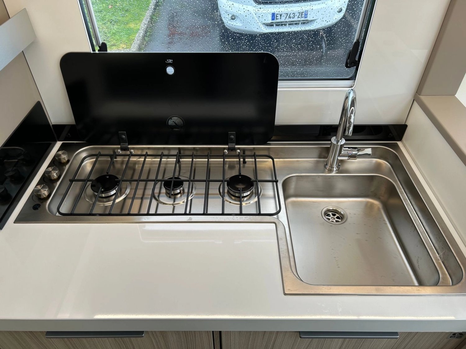 Plaque de cuisson gaz 3 feux avec allumage électrique, vitre de protection et évier inox