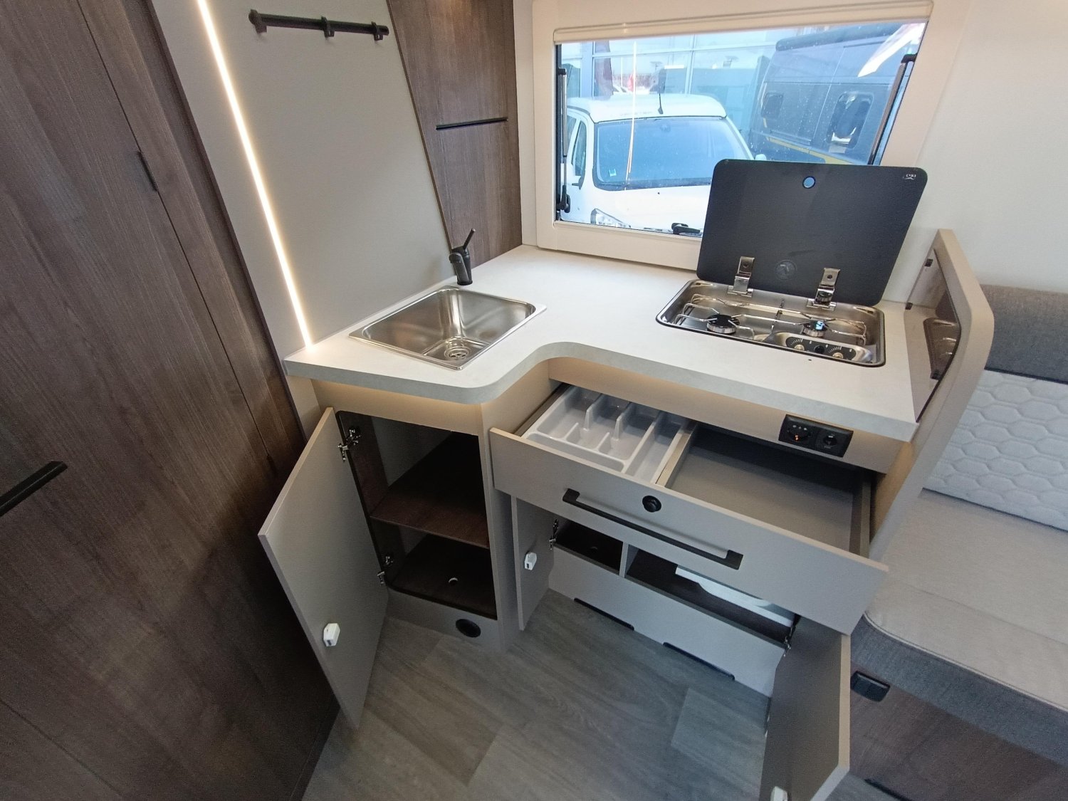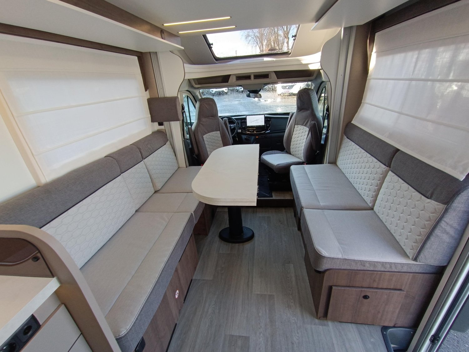 BOITE A GANTS VERROUILLABLE, ENTOURAGE GRILLES TABLEAU DE BORD GRIS ALU, PHARES HALOGENES AVEC FEUX D ANGLES FIXES, LE PACK PLUS COMPREND :, SIEGES CABINE HABILLES AVEC TISSU CELLULE, SKYDOME, PARE-CHOCS AVANT COULEUR CARROSSERIE, LUMIERE EXTERIEURE LED, PORTE CELLULE XL AVEC 2 POINTS DE FERMETURE, MOUSTIQUAIRE DE PORTE, PANNEAU SOLAIRE 200W AVEC REGULATEUR MPPT, SIEGES AVEC FIXATIONS ISOFIX, RIDEAUX OCCULTATION VITRES CABINE, SUPPORT TV, RADAR DE RECUL