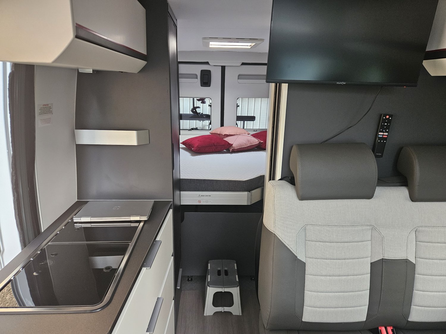 L'équipement est complété par une porte cellule XL avec moustiquaire, une rallonge de table, des stores plissés de cabine, un Sunroof ouvrant, un marchepied électrique et un panneau solaire de 150 Watts, garantissant une autonomie appréciable.