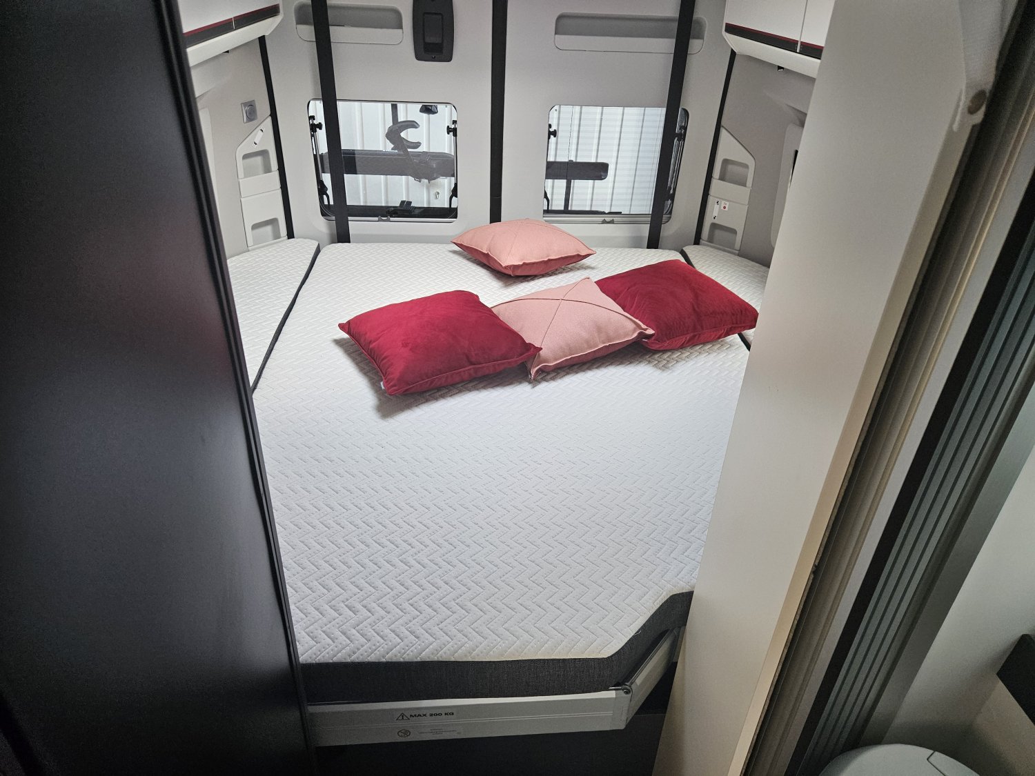 La configuration nuit est particulièrement aboutie avec un lit pavillon électrique (sous le toit relevable) un lit transversal sur soute, permettant à chacun de profiter d'un véritable espace de repos sans compromis.