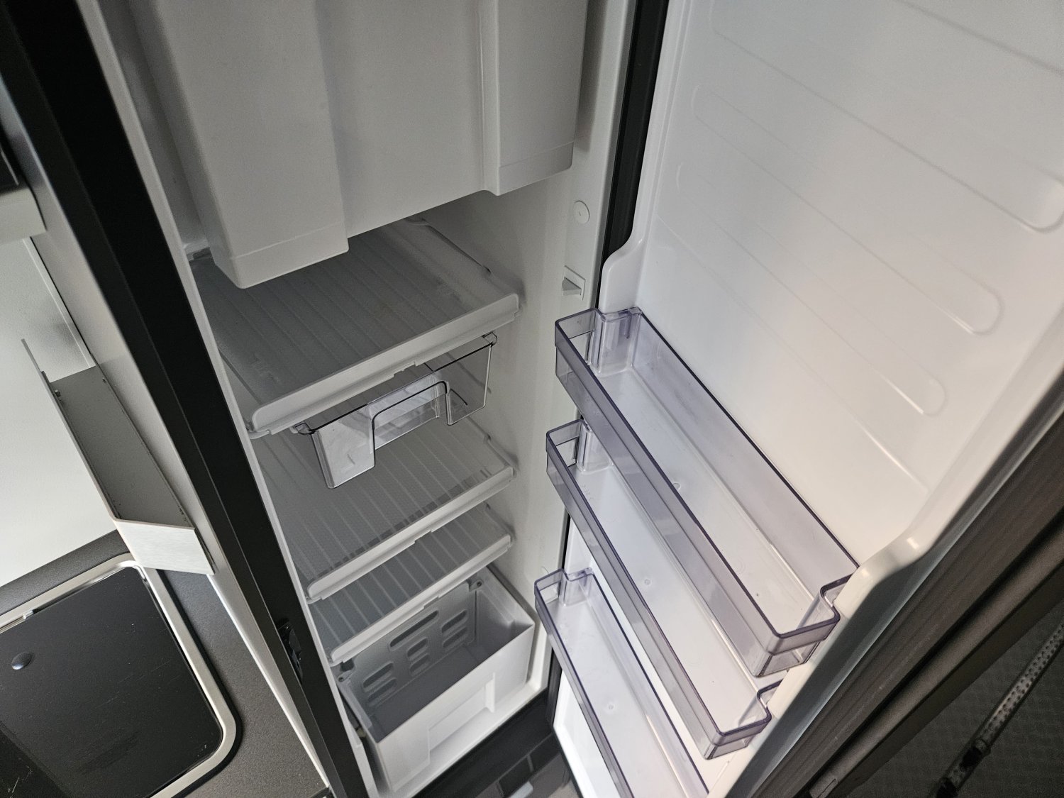 La cuisine est élégante et fonctionnelle avec une gazinière deux feux et un réfrigérateur 12 volt à compression, avec Freezer, reconnu pour son efficacité et sa faible consommation.