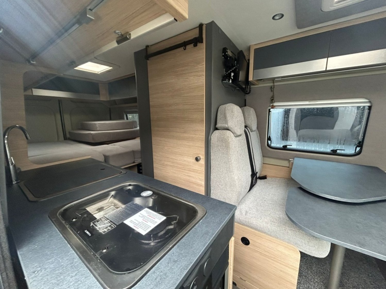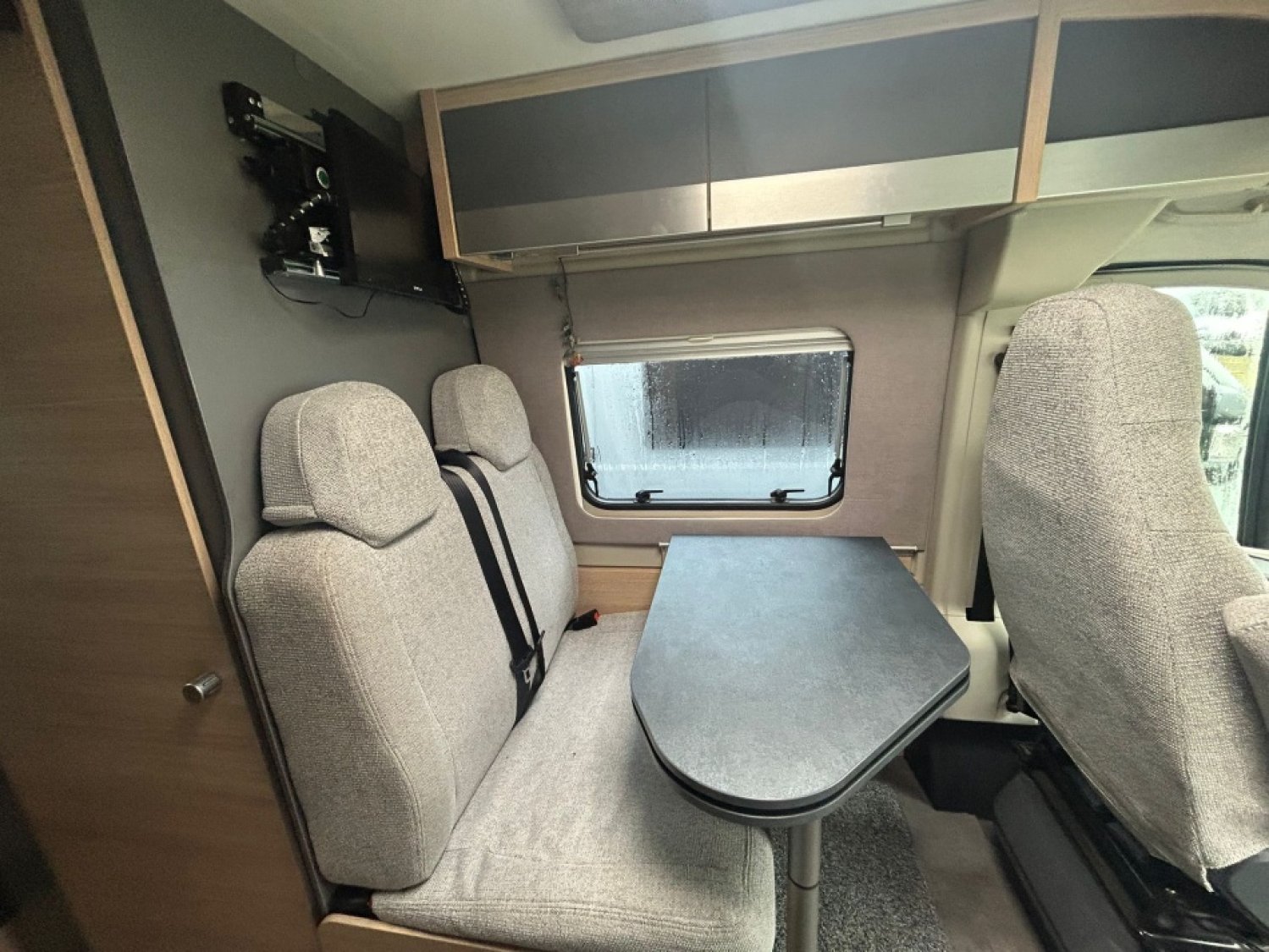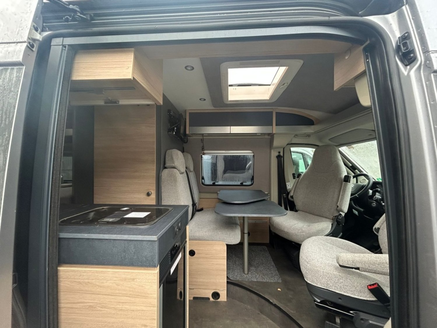 Fermeture porte coulissante latérale avec assistance électrique Softlock - Large marchepied électrique avec avertisseur sonore - moustiquaire de porte coulissante - Isolation performante - 2 trappes de rangement dans le plancher au niveau de la dinette - Mobilier de qualité - Réfrigérateur à absorption - Lit arrière empilable permettant d’agrandir le volume de la soute