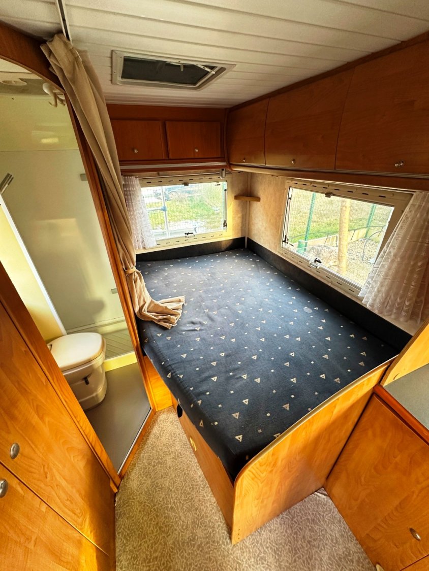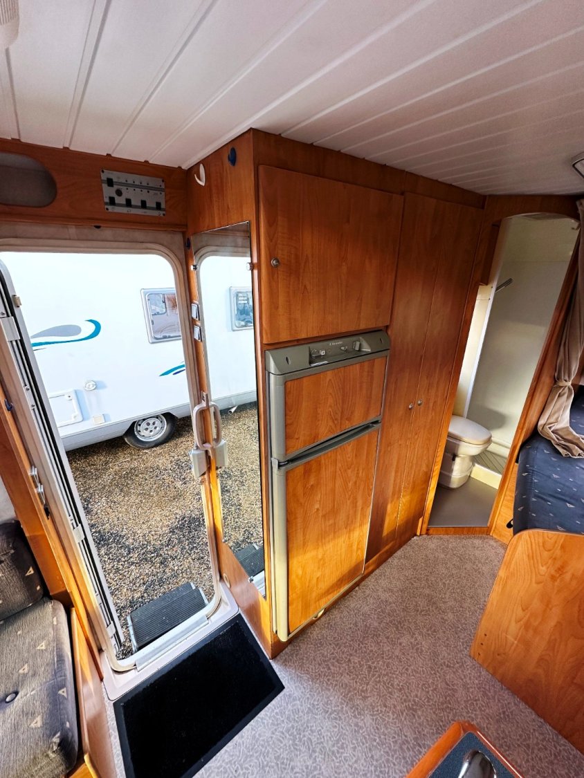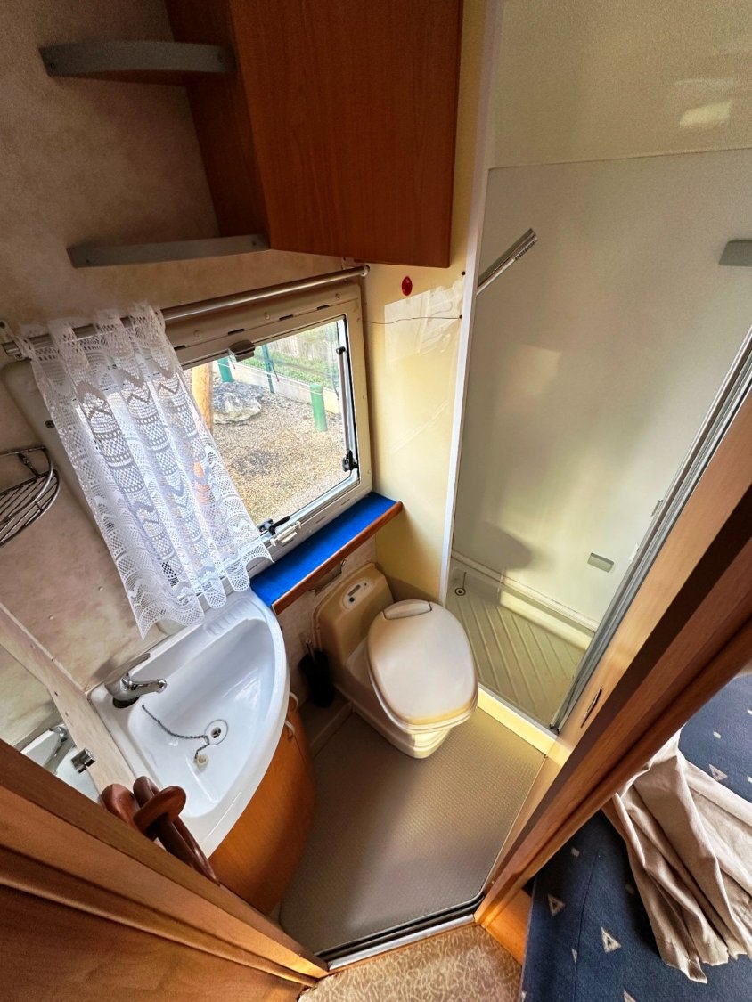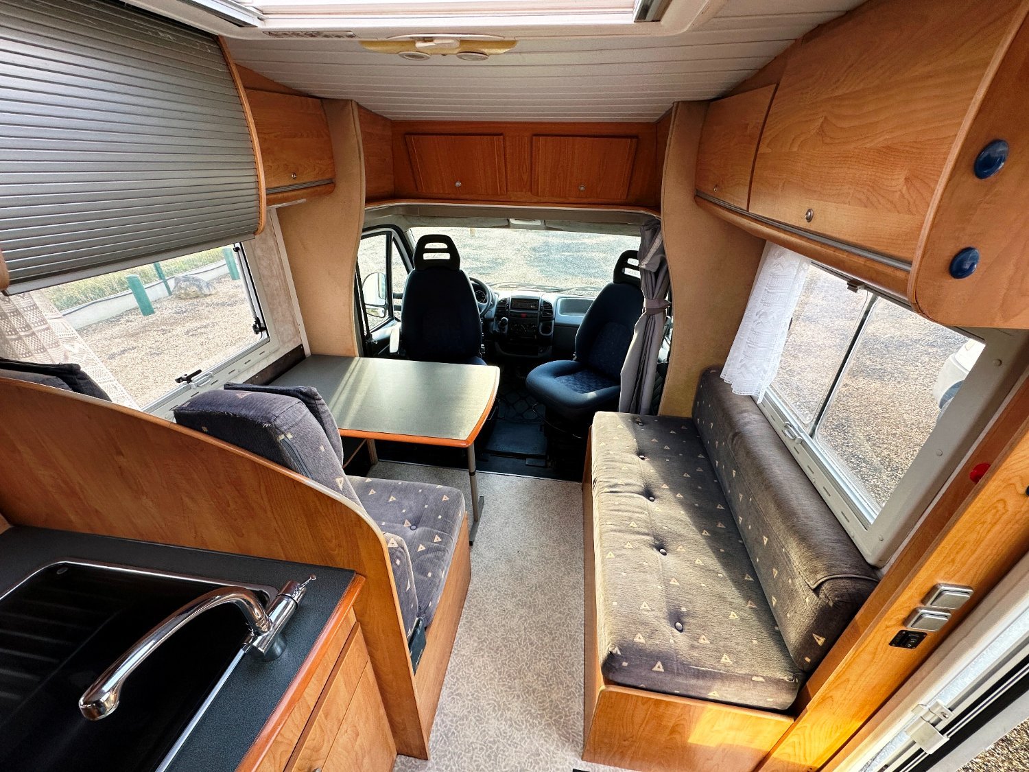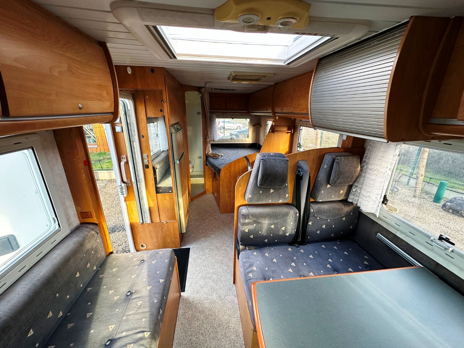 Profilé Bavaria, 4 couchages, lit à la Française, salle de bain avec douche séparée, cuisine spacieuse et toute équipée, salon avant avec sièges pivotant et table centrale convertible en un couchage double d’appoint.