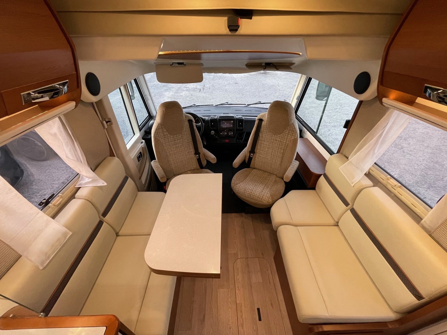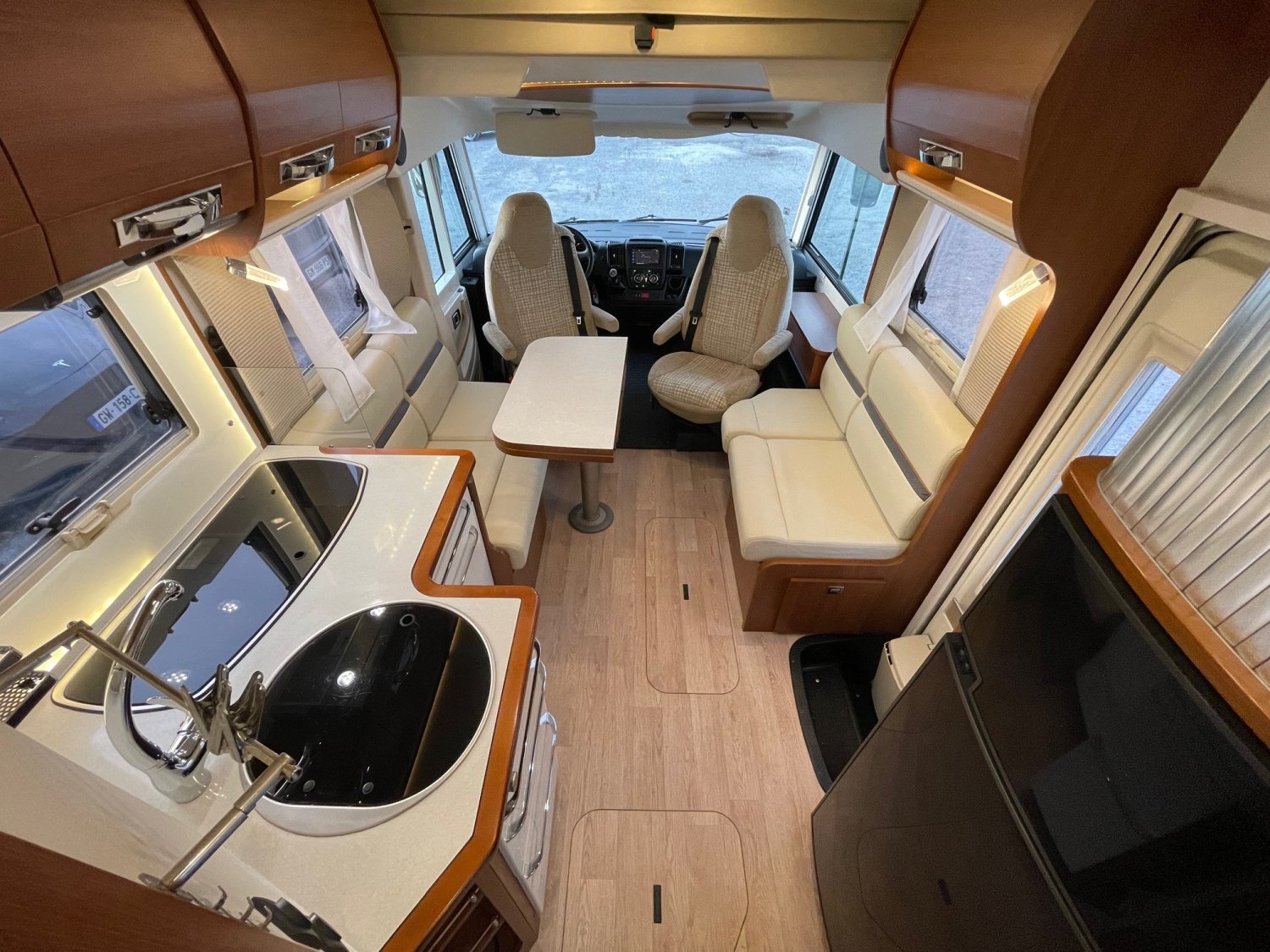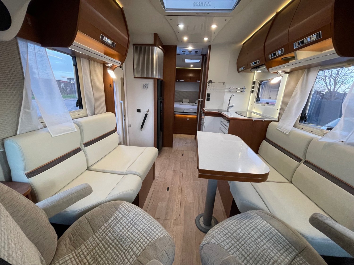 Ce camping-car intégral sur châssis al-kor offre un agencement pensé pour le confort et l’espace. Salon face-face, lit de 160 cm réglable en hauteur, cabinet de toilette à double cloisonnement.